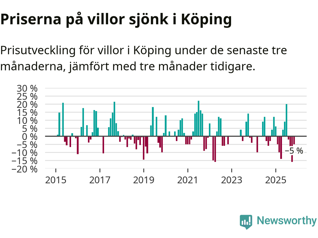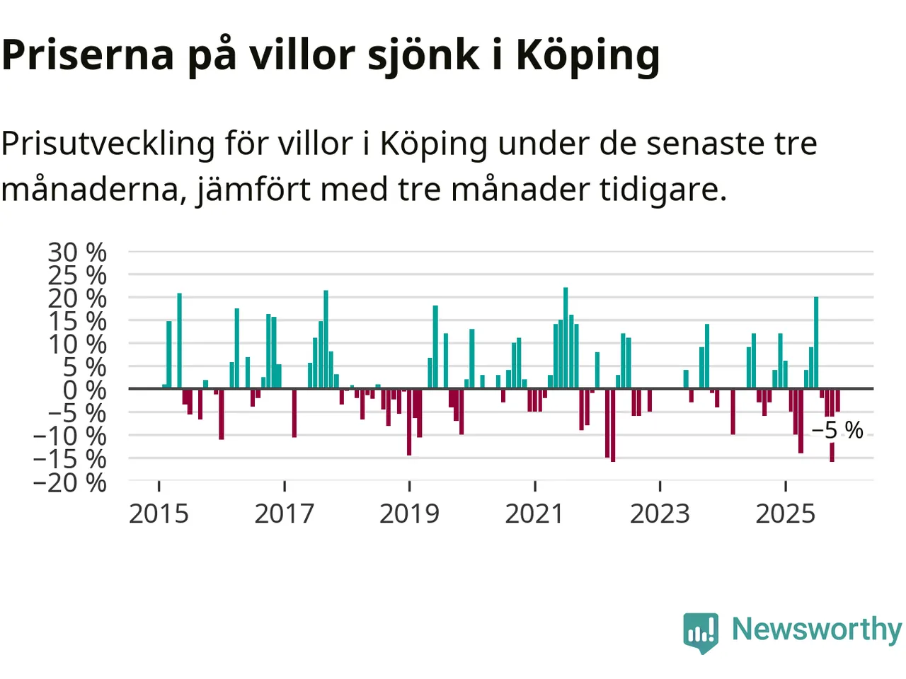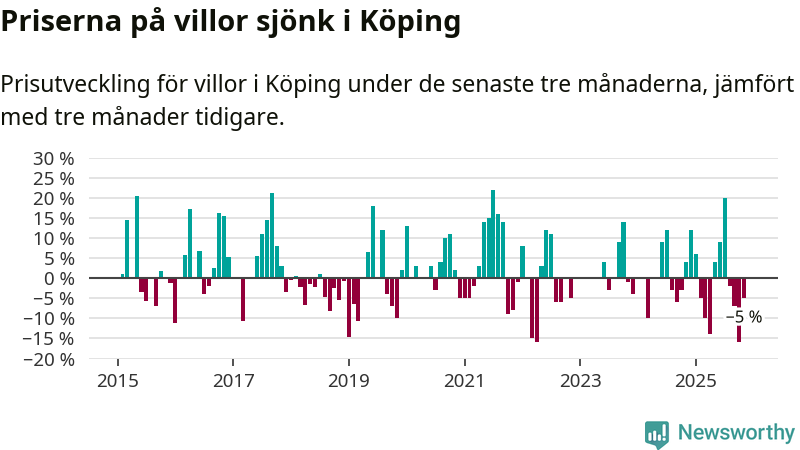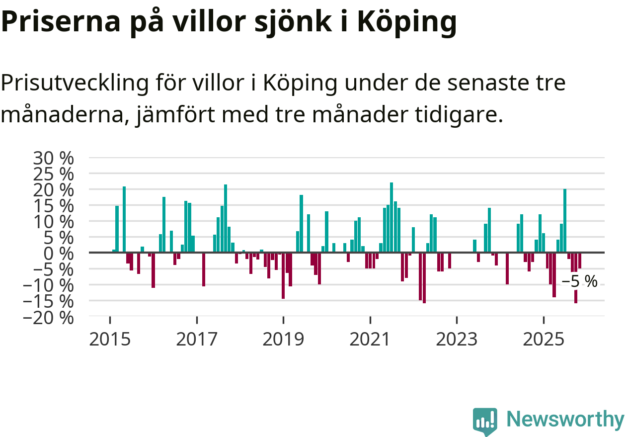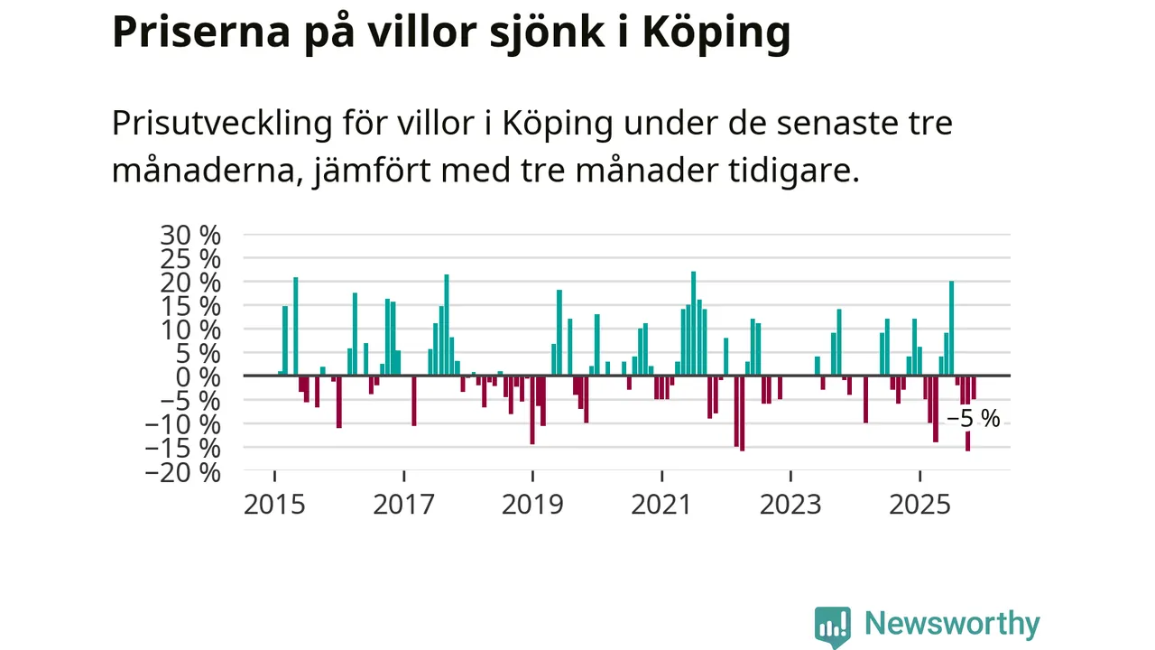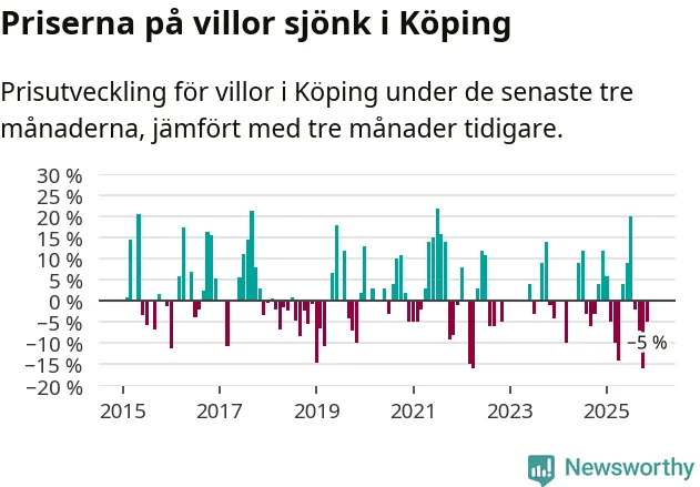 Villapriserna har gått ner i Köpings kommun. Medelpriset på försäljningarna under de senaste tre månaderna visar på en nedgång med 5 procent.