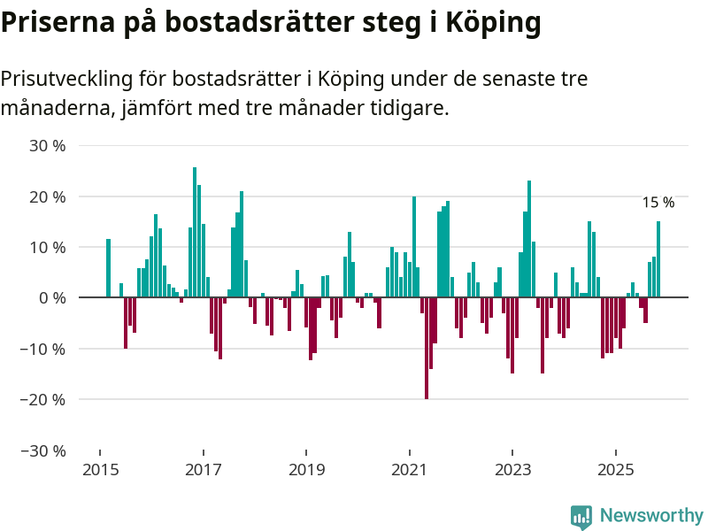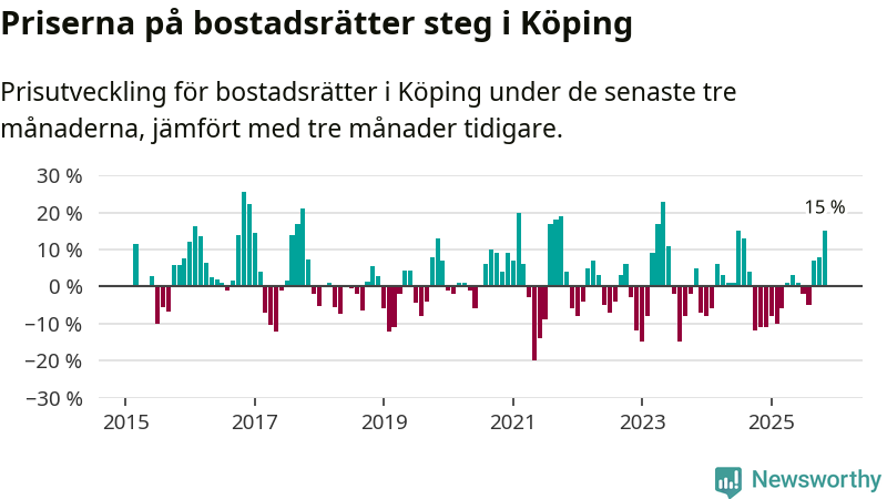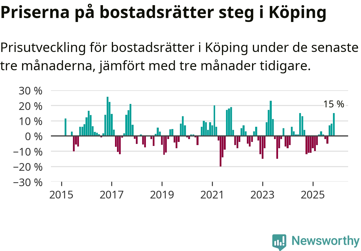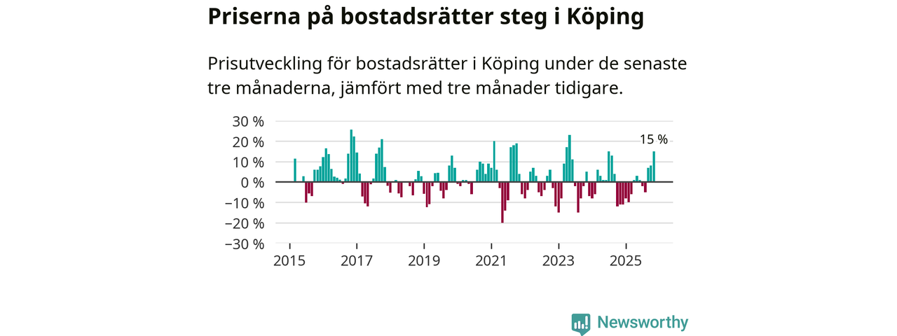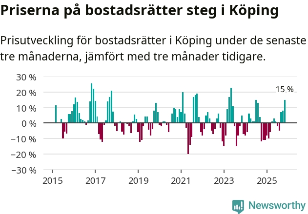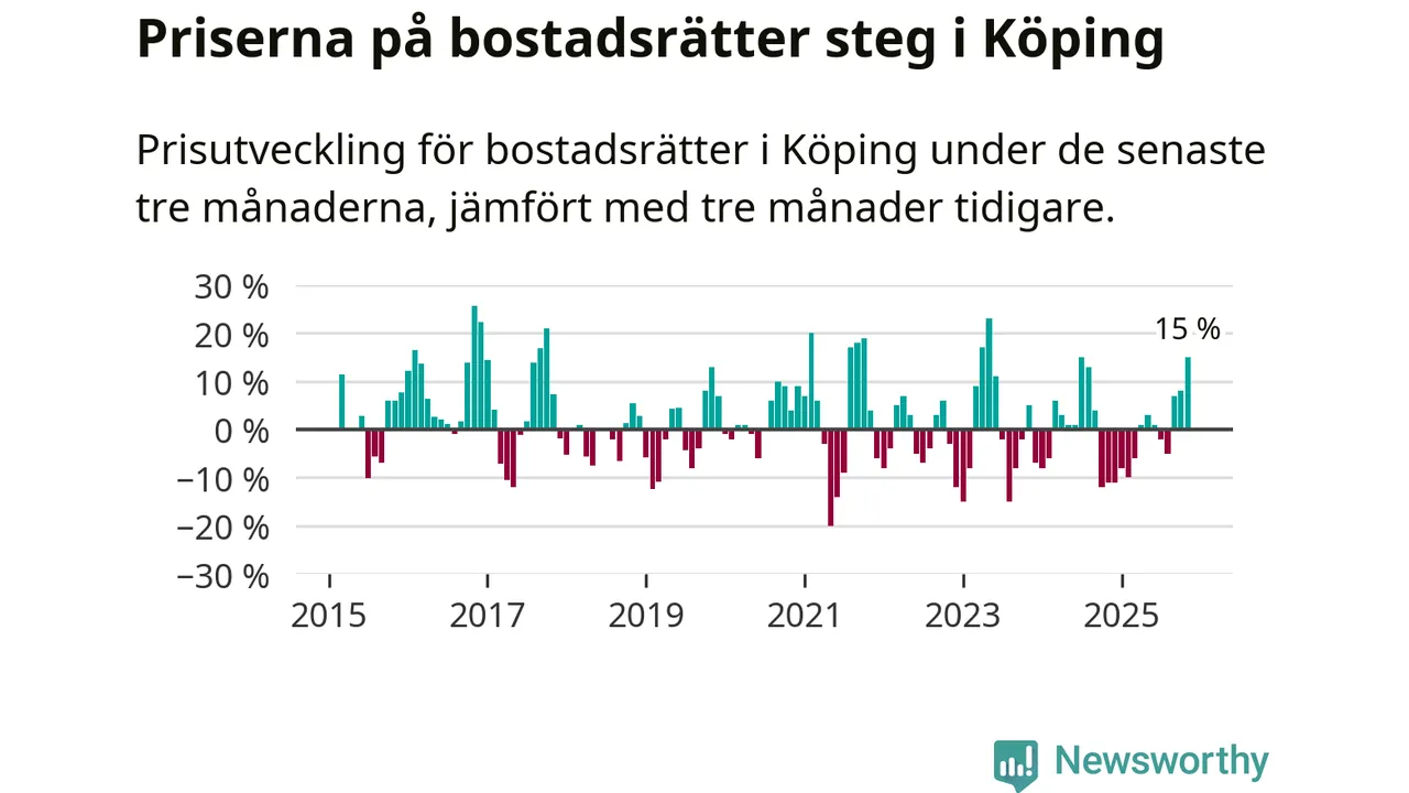 Priserna på bostadsrätter steg mellan september och november med 15 procent i Köpings kommun. Det är en betydande uppgång jämfört med det gångna året då priserna i snitt sjunkit med 1 procent.