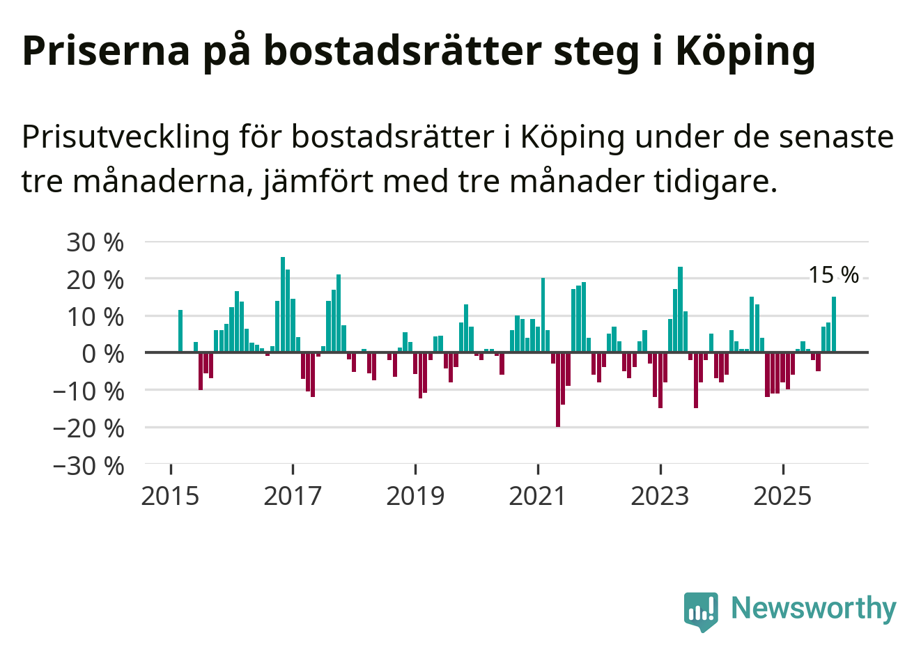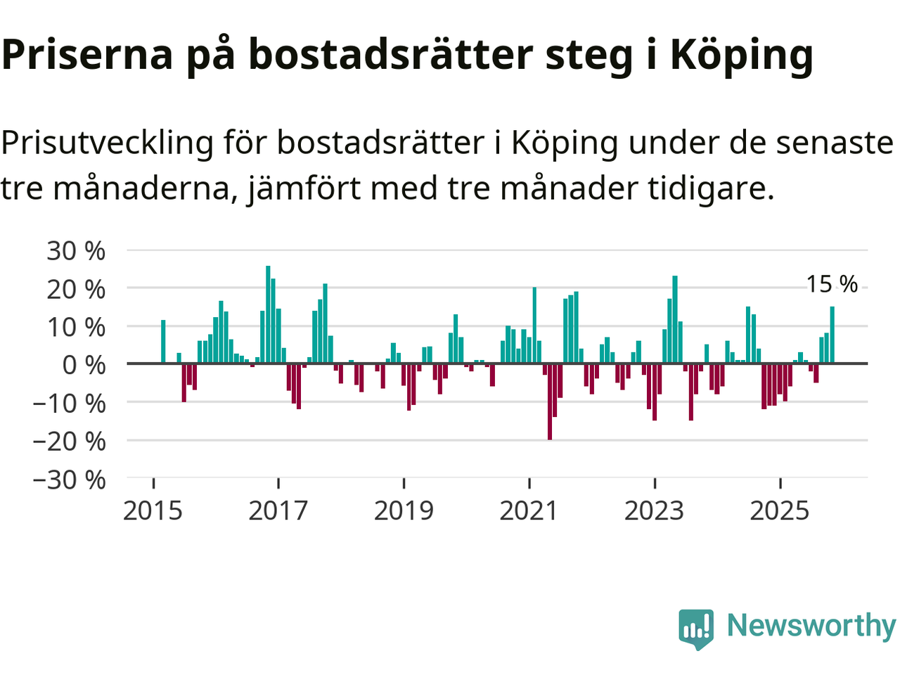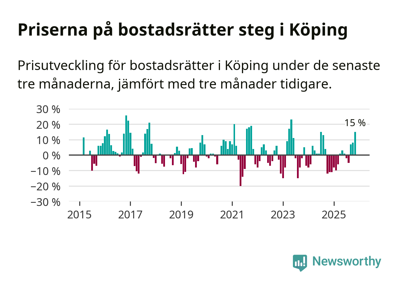 Priserna på bostadsrätter steg mellan september och november med 15 procent i Köpings kommun. Det är en betydande uppgång jämfört med det gångna året då priserna i snitt sjunkit med 1 procent.