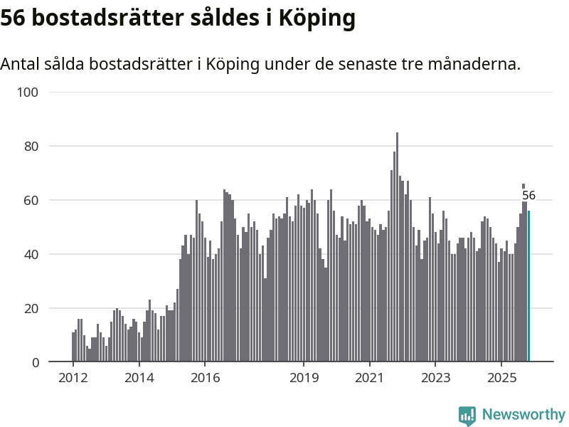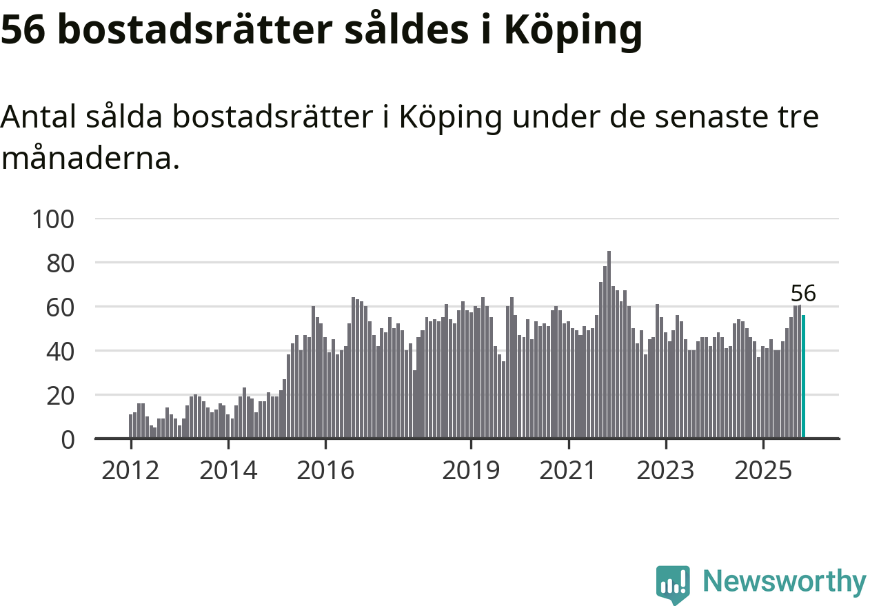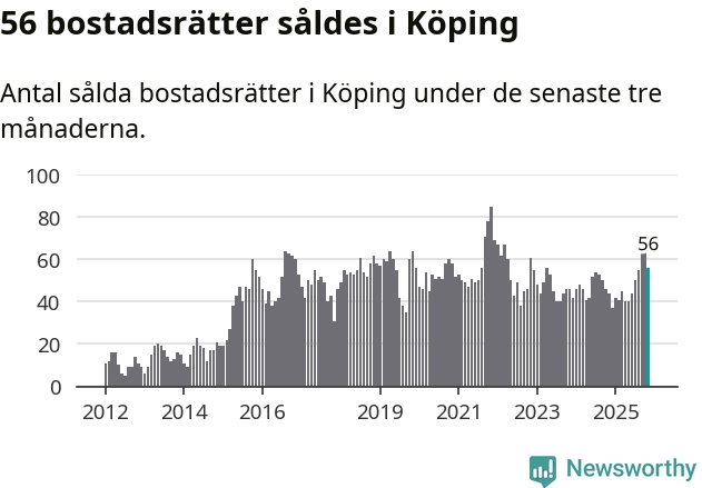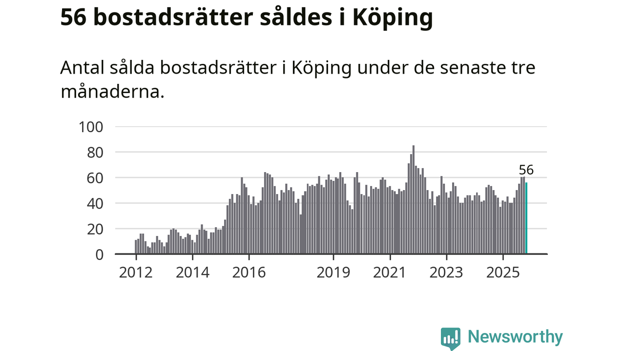 Sammanlagt såldes 56 bostadsrätter i Köpings kommun mellan september och november till ett genomsnittligt pris på 0,7 miljoner kronor. I fjol gjordes 44 affärer vid den här tiden på året.