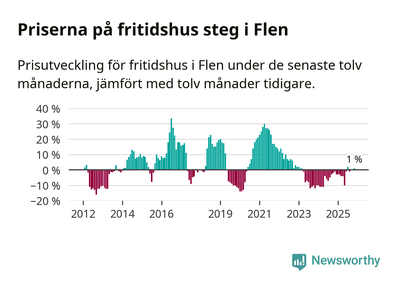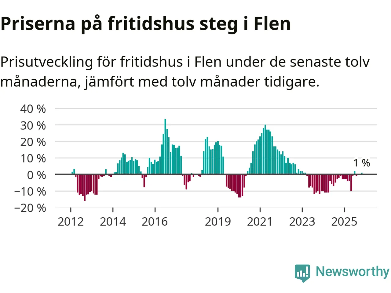 Priserna på fritidshus har gått upp i Flens kommun. Medelpriset på försäljningarna under de senaste tolv månaderna visar på en uppgång med 1 procent.