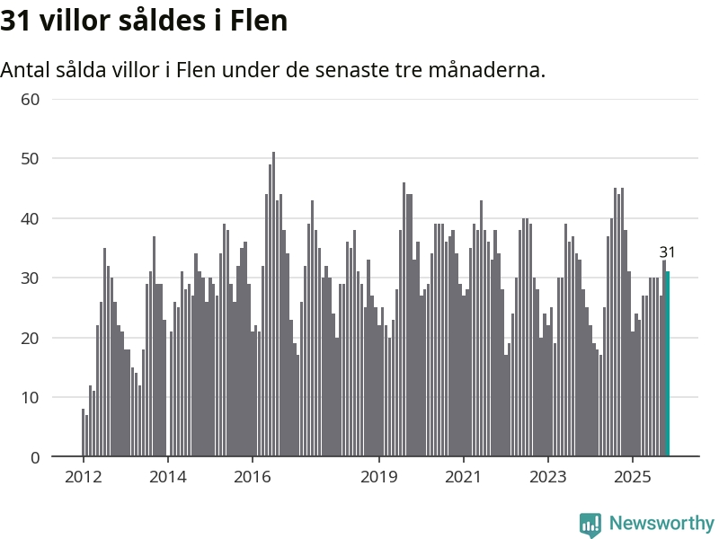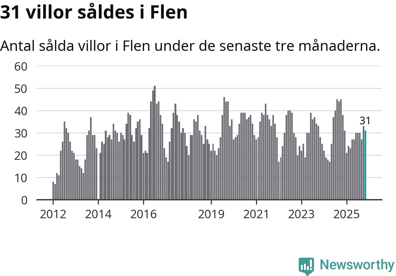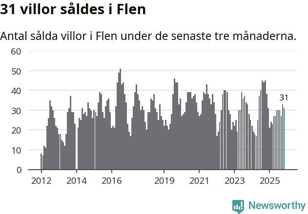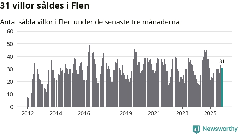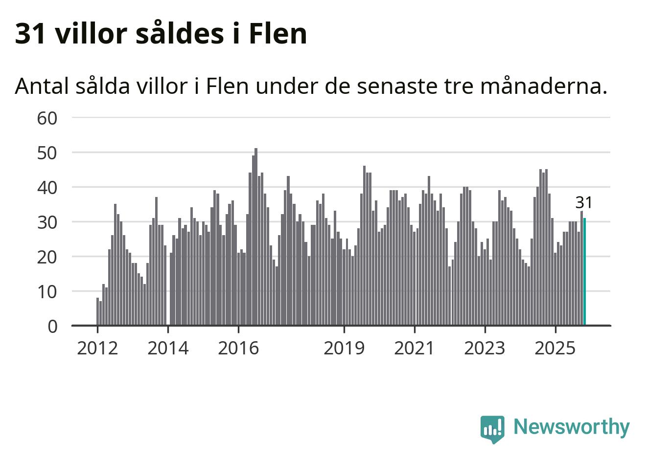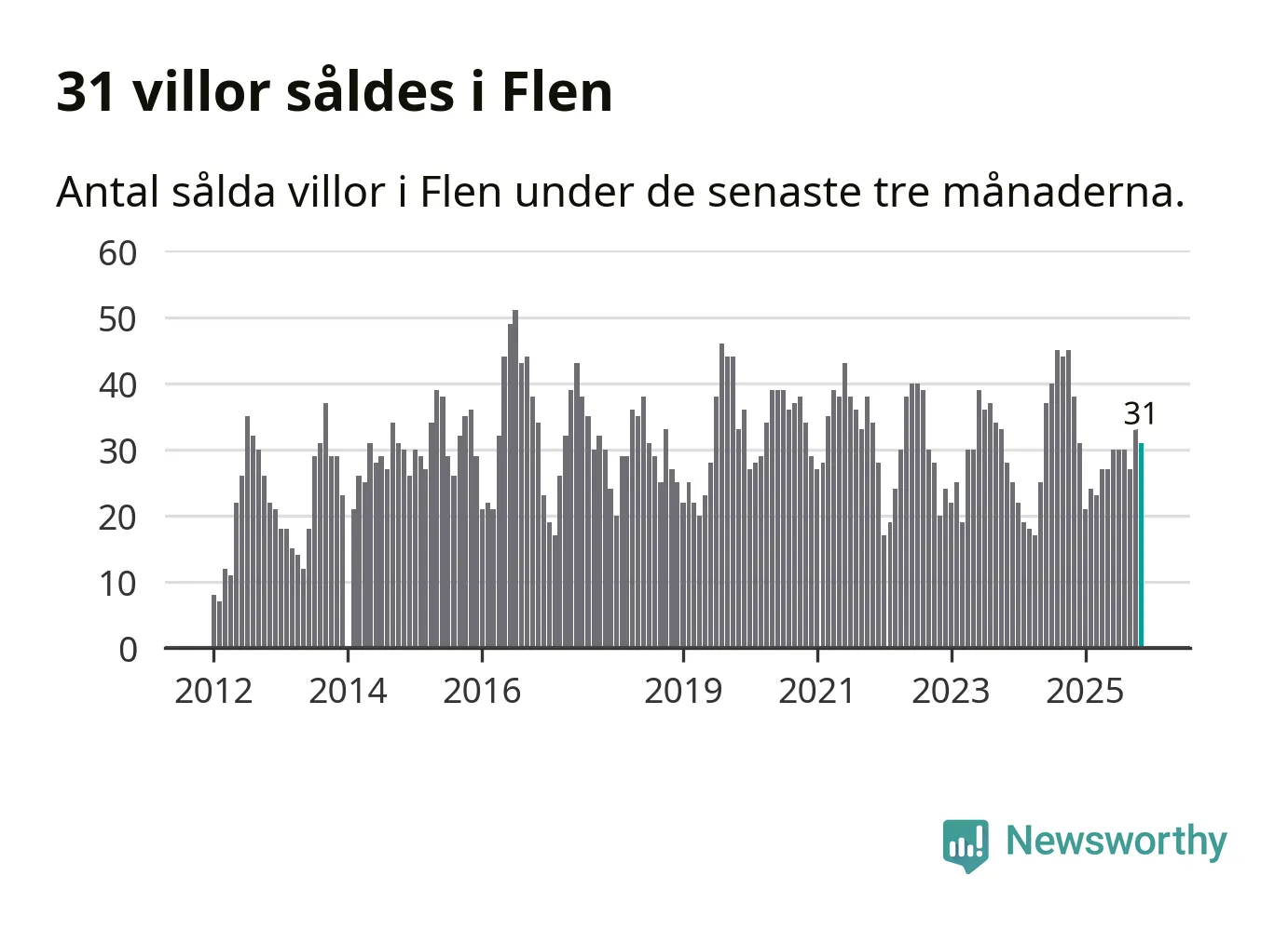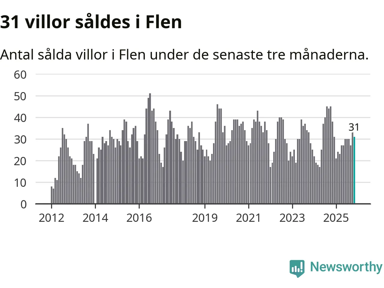 Mellan september och november gjordes sammanlagt 31 affärer med villor i Flens kommun. Det kan jämföras med 38 vid motsvarande tid i fjol.
