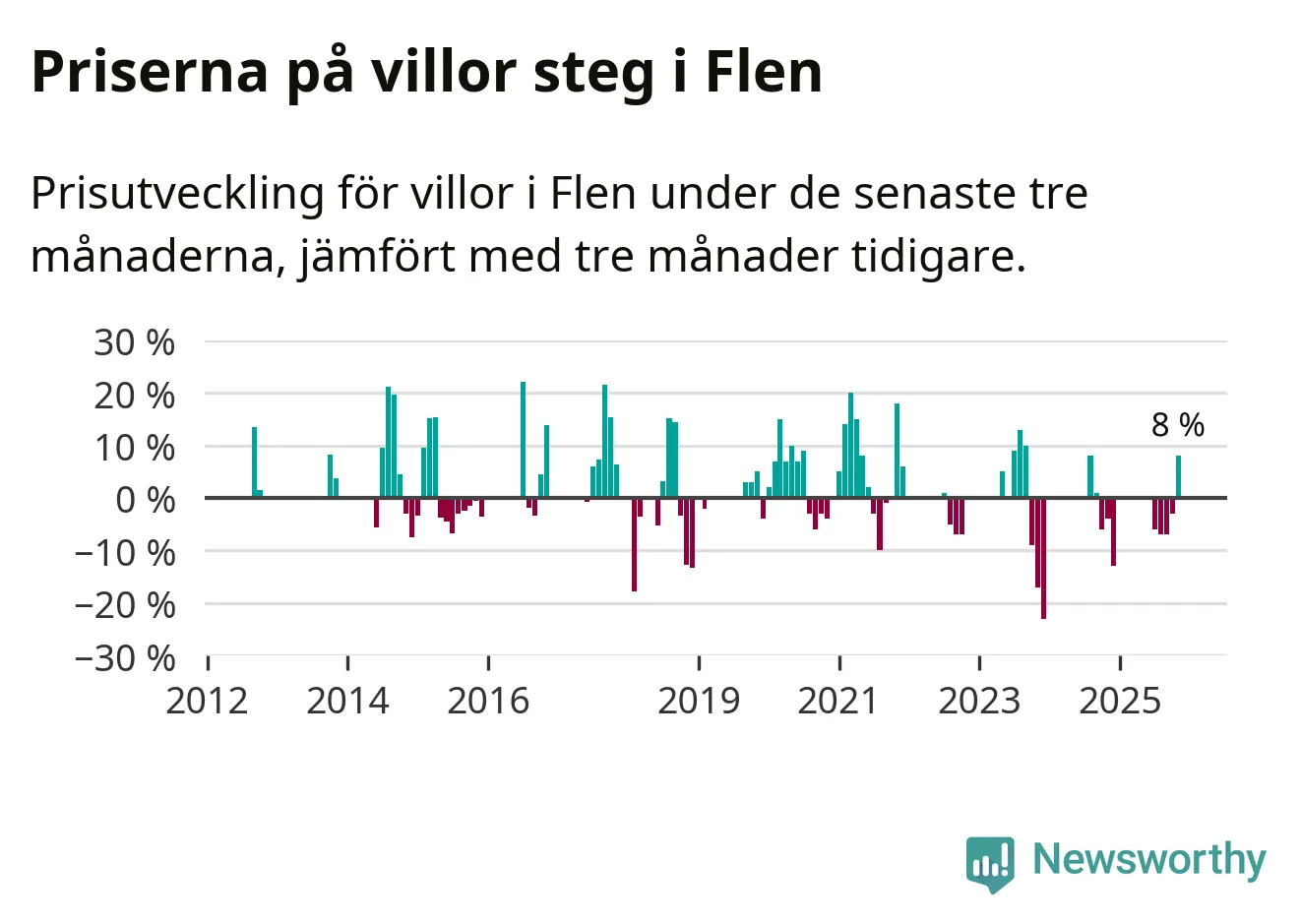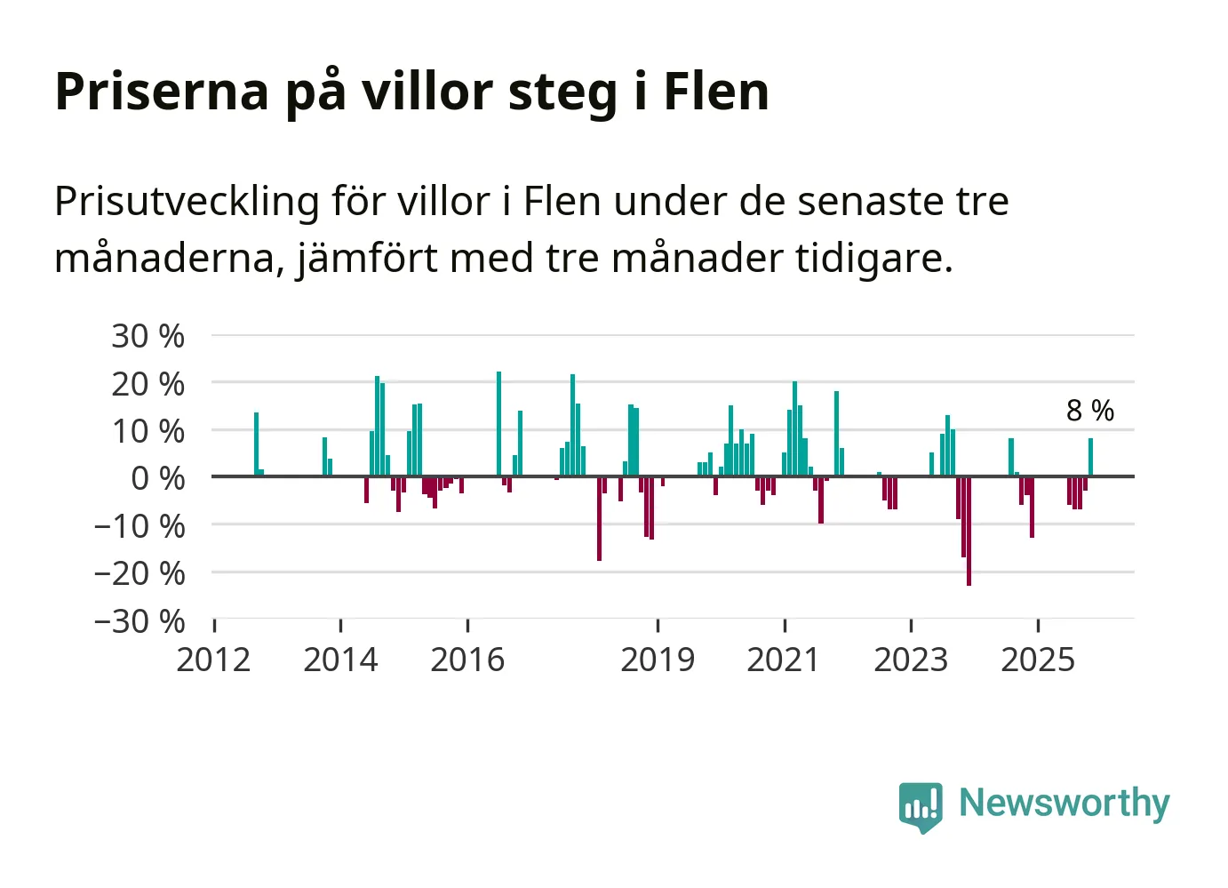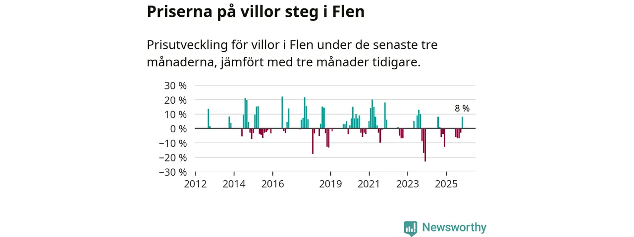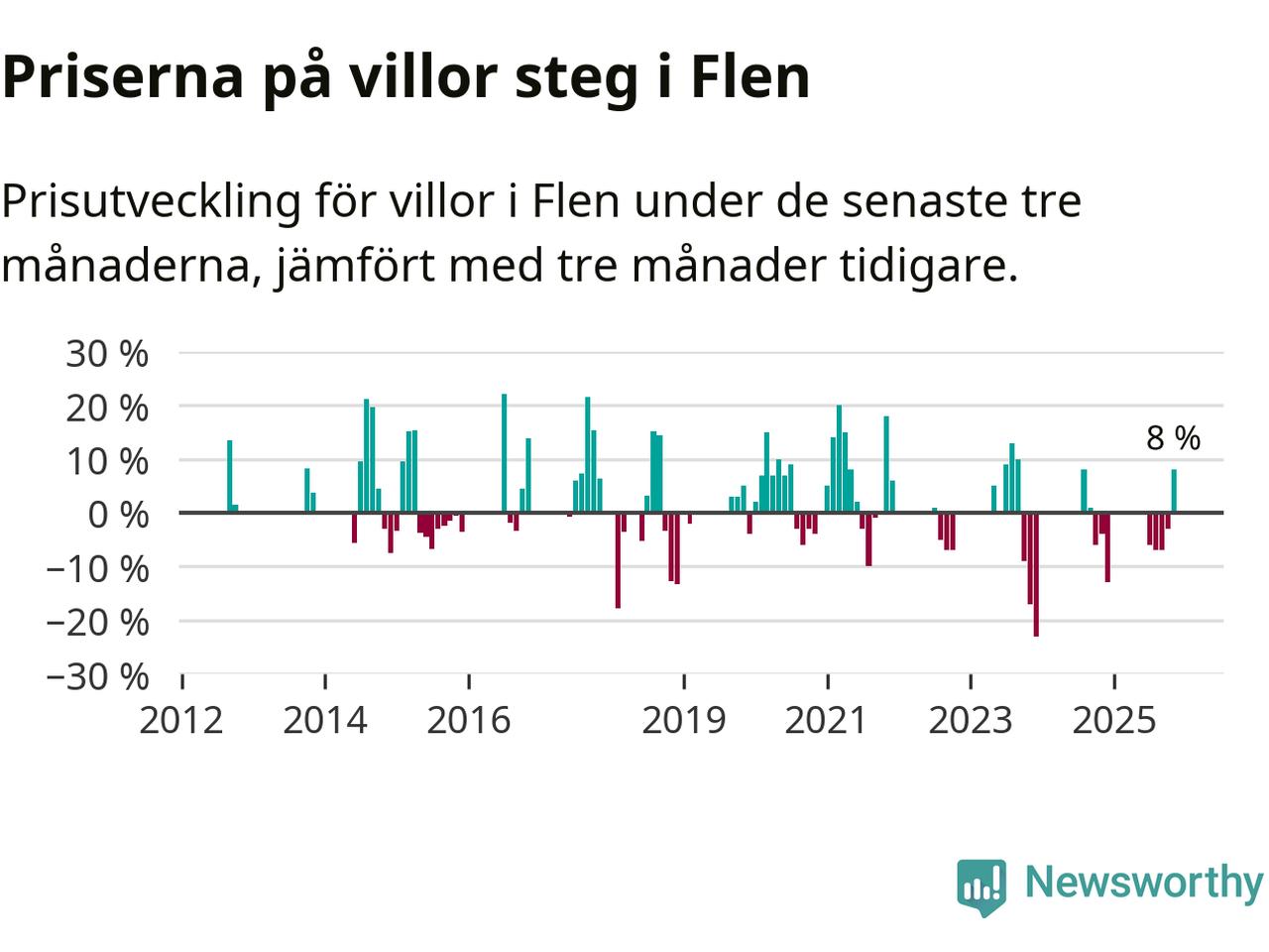 Statistiken visar även på en stor prisuppgång i Flens kommun. Medelpriset på försäljningarna av villor i kommunen var 8 procent högre än för tre månader sedan. I hela Södermanland däremot sjunker villapriserna. I hela länet noterades en prisnedgång på 2 procent.