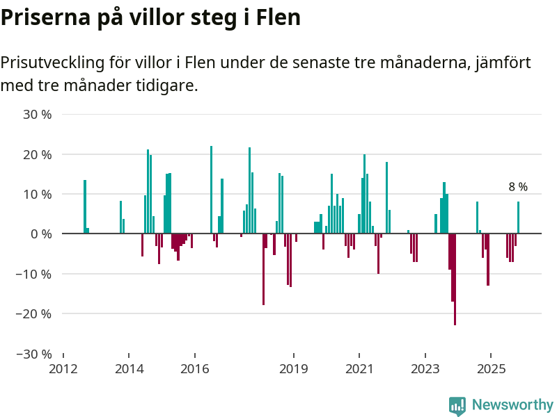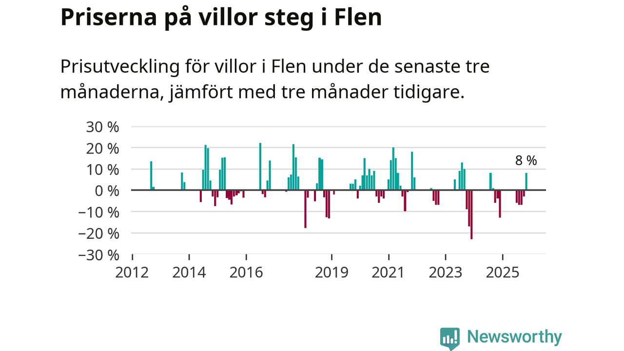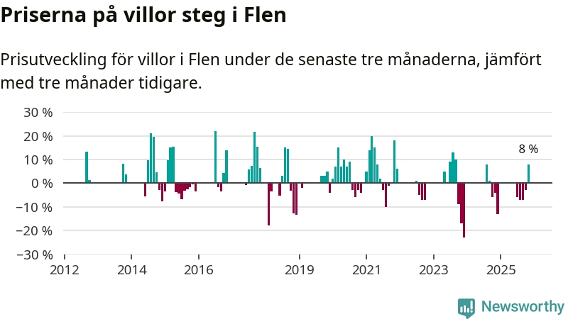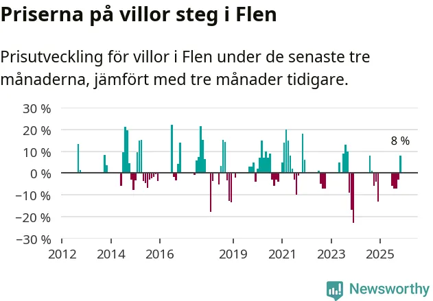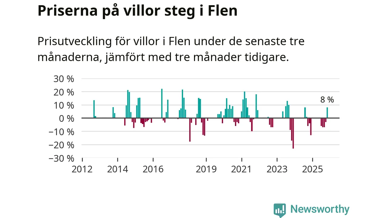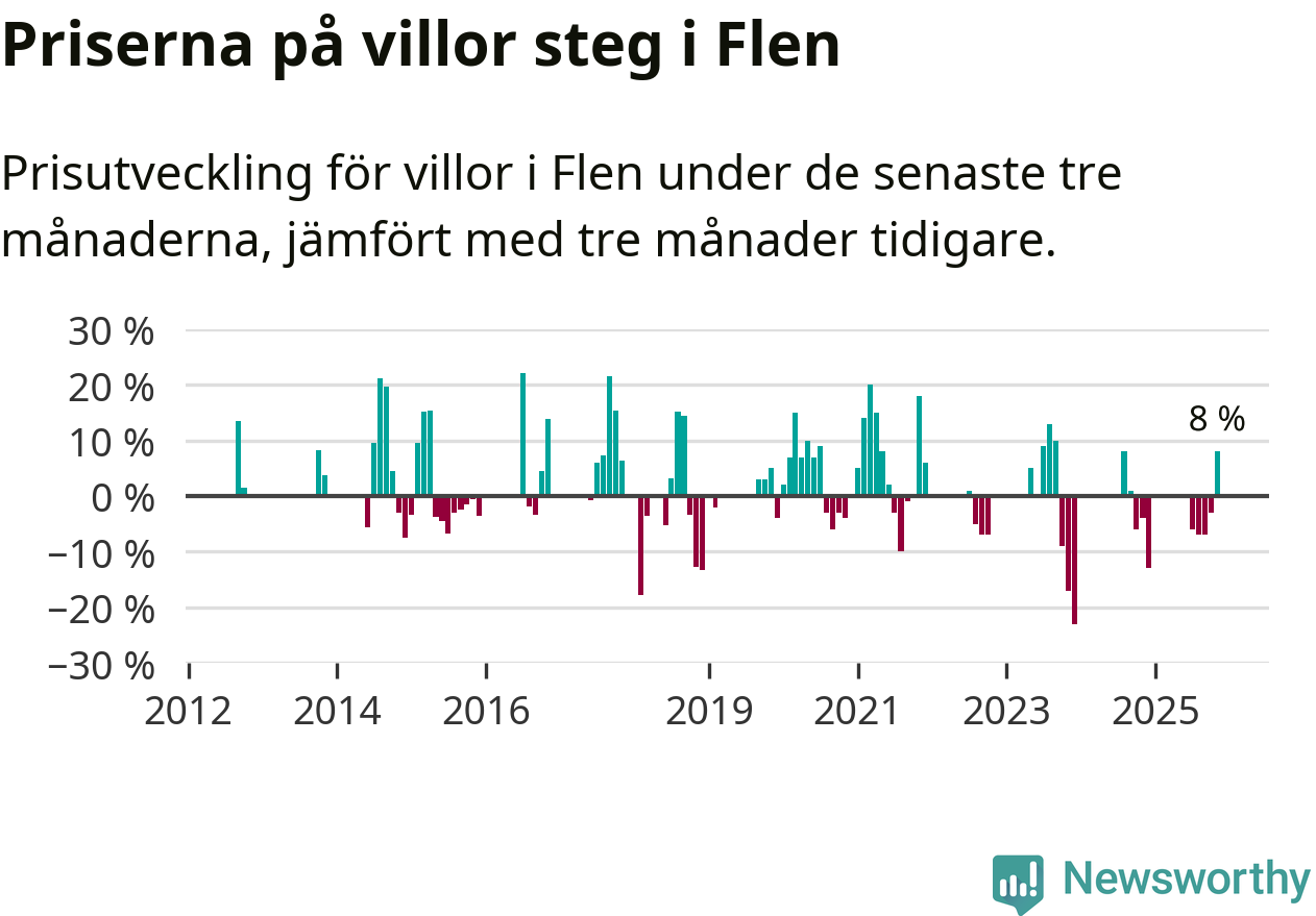 Statistiken visar även på en stor prisuppgång i Flens kommun. Medelpriset på försäljningarna av villor i kommunen var 8 procent högre än för tre månader sedan. I hela Södermanland däremot sjunker villapriserna. I hela länet noterades en prisnedgång på 2 procent.