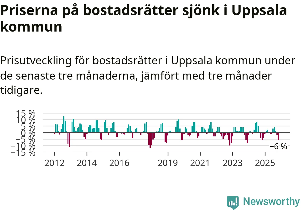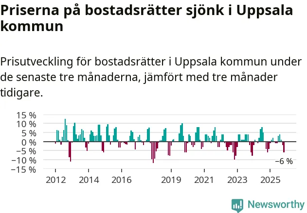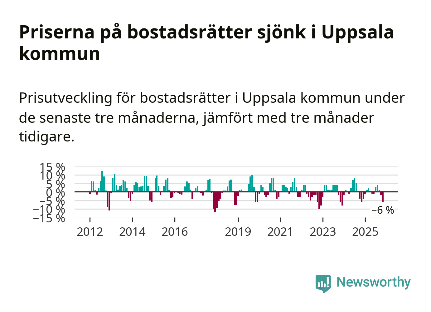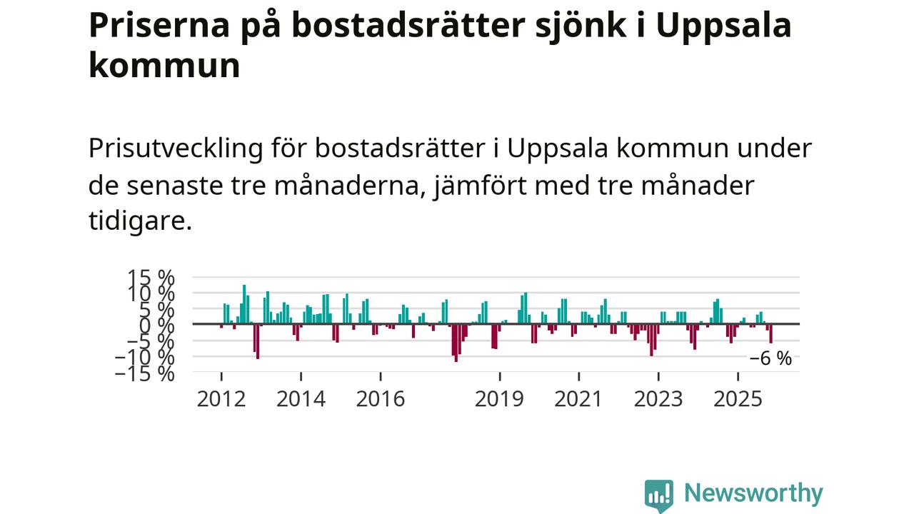Priserna på bostadsrätter har gått ner i Uppsala kommun. Medelpriset på försäljningarna under de senaste tre månaderna visar på en nedgång med 6 procent.