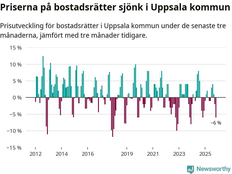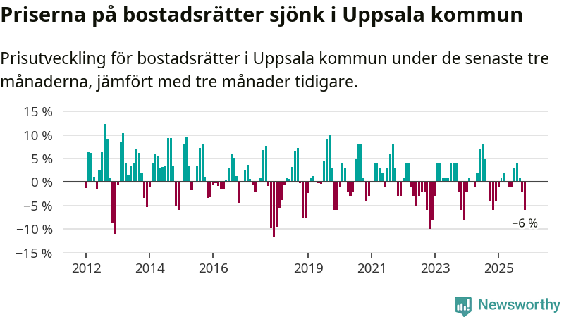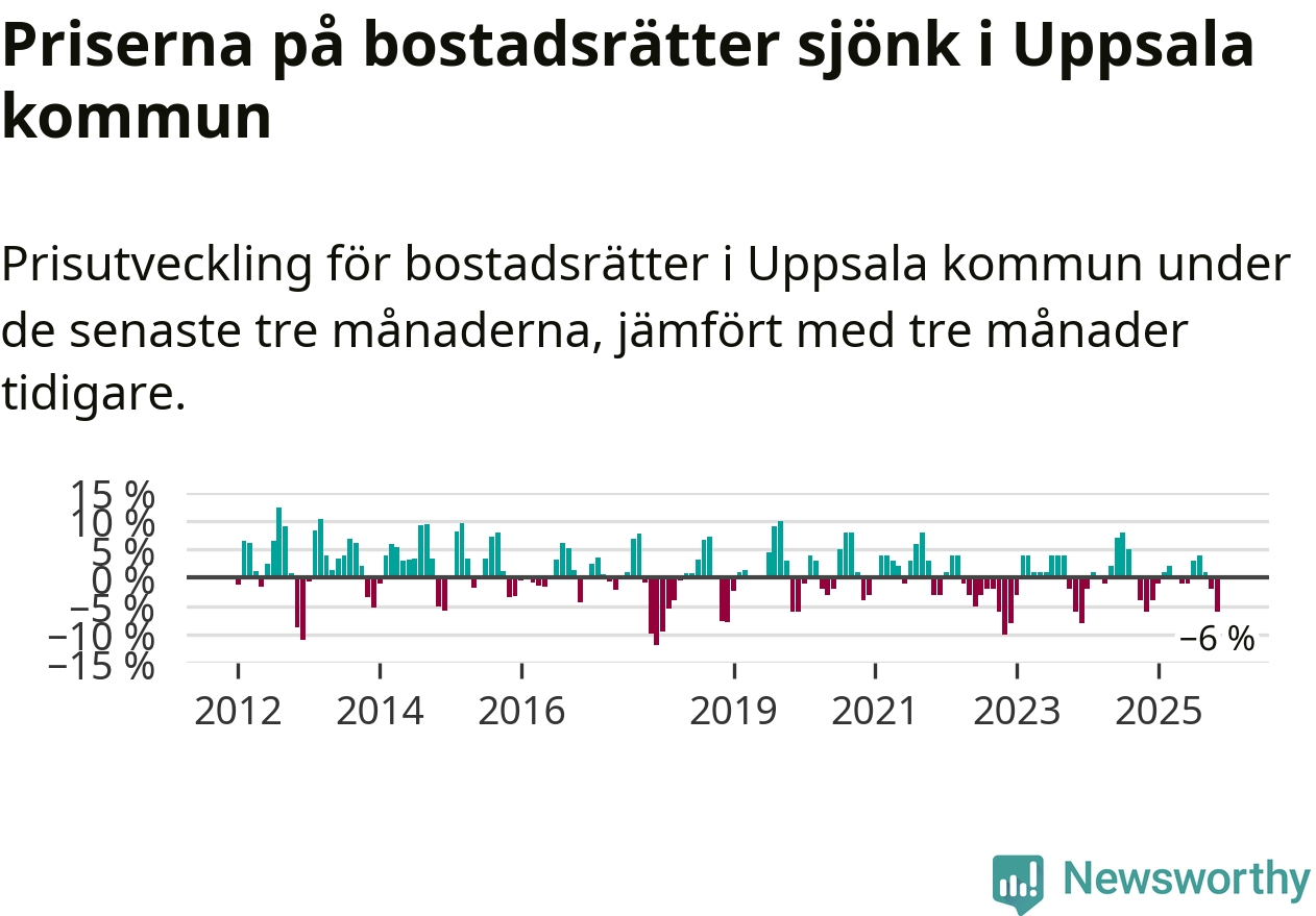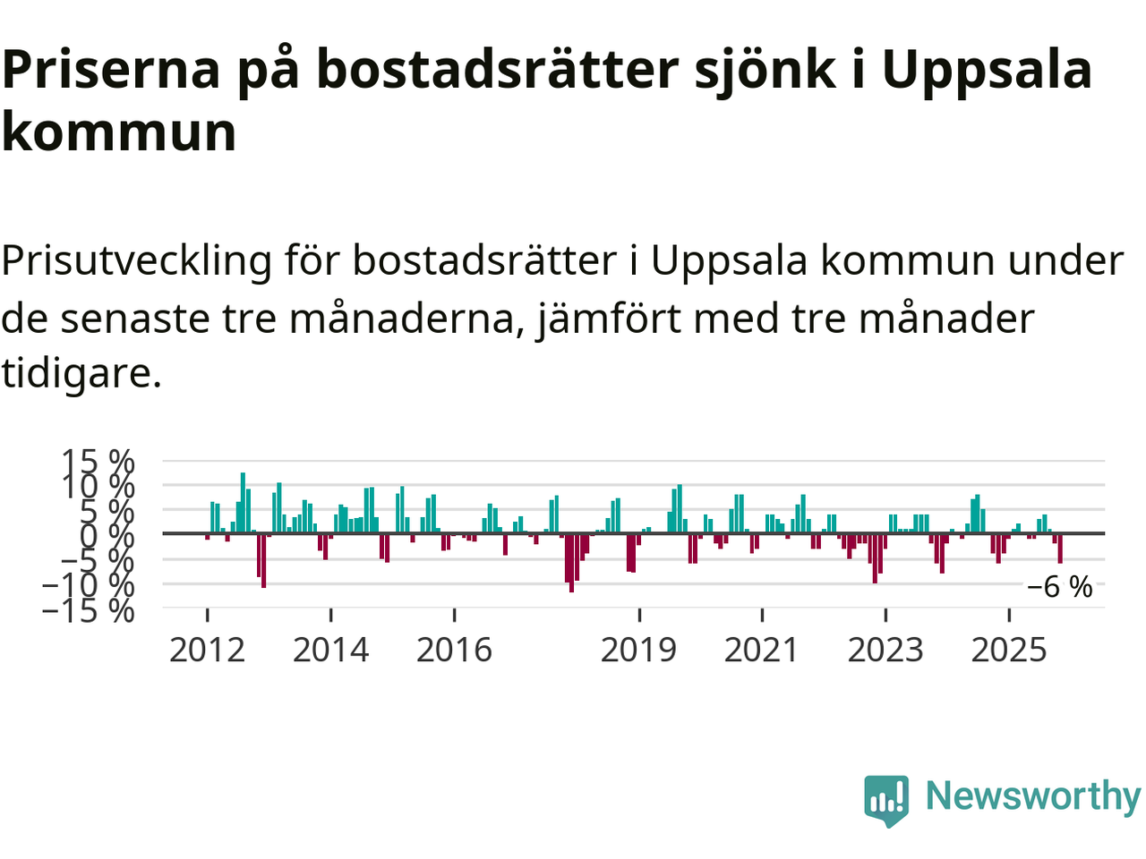 Priserna på bostadsrätter har gått ner i Uppsala kommun. Medelpriset på försäljningarna under de senaste tre månaderna visar på en nedgång med 6 procent.
