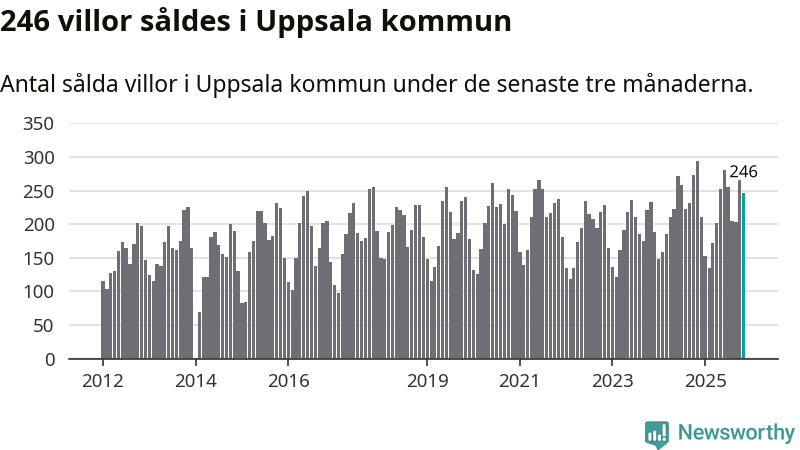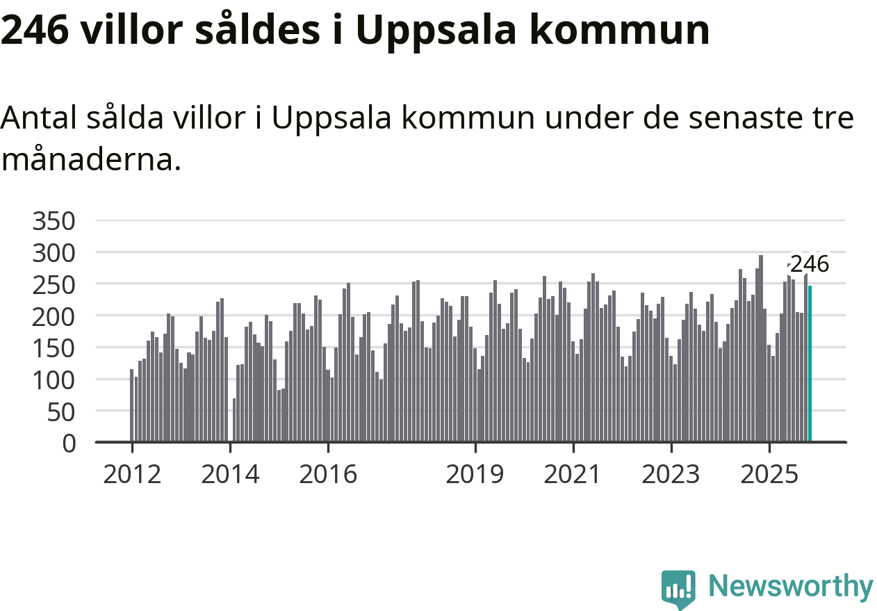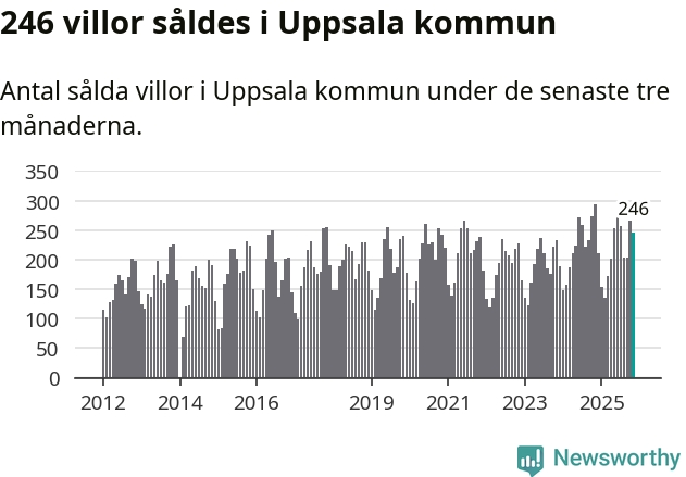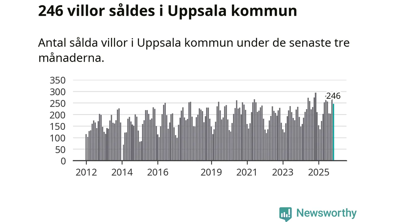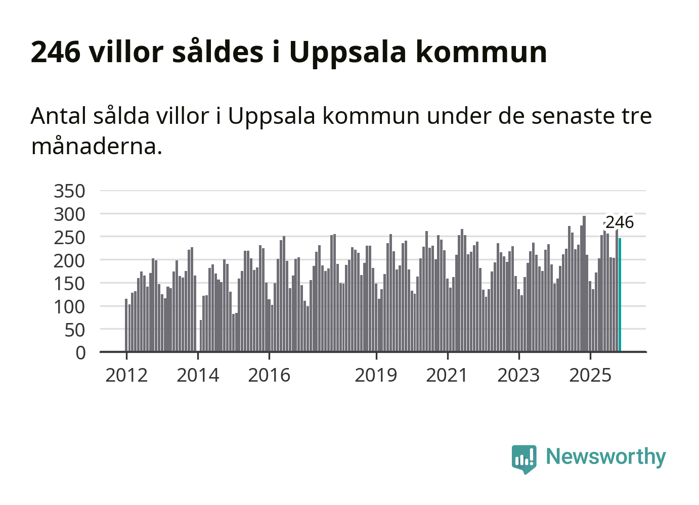 Sammanlagt såldes 246 villor i Uppsala kommun mellan september och november till ett genomsnittligt pris på 5,3 miljoner kronor. I fjol gjordes 294 affärer vid den här tiden på året.