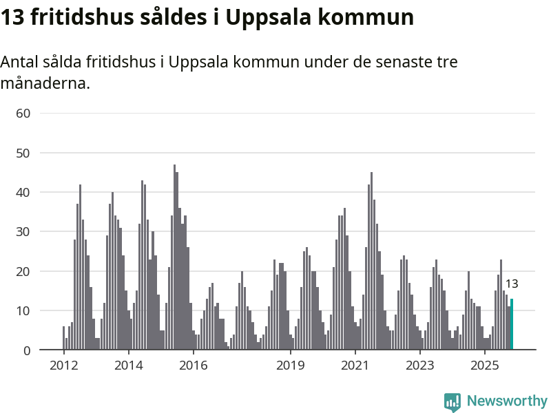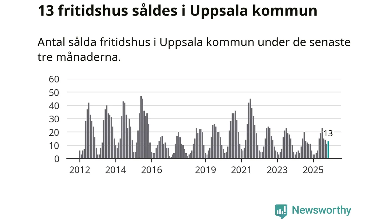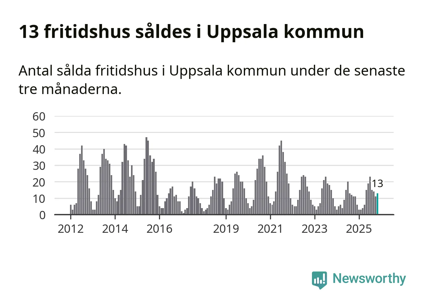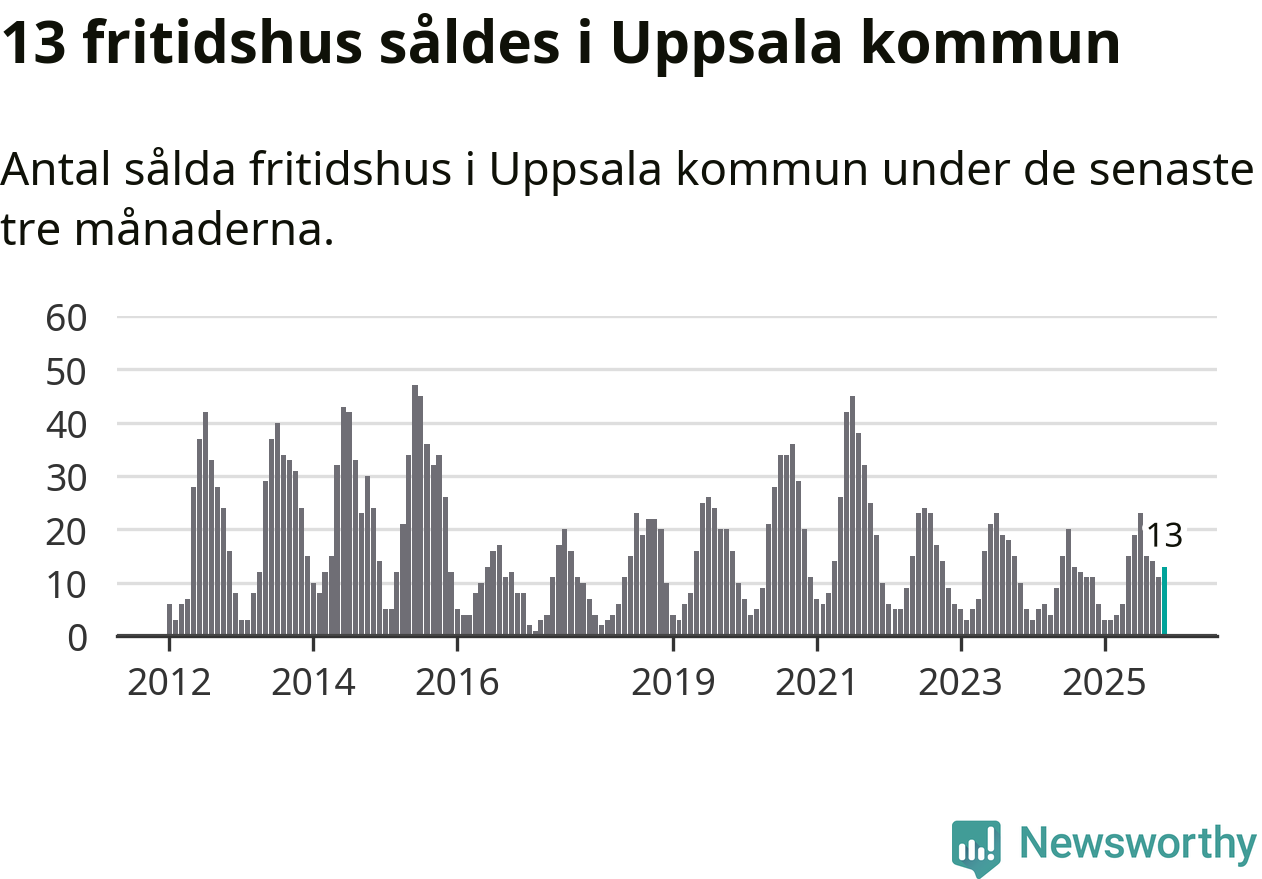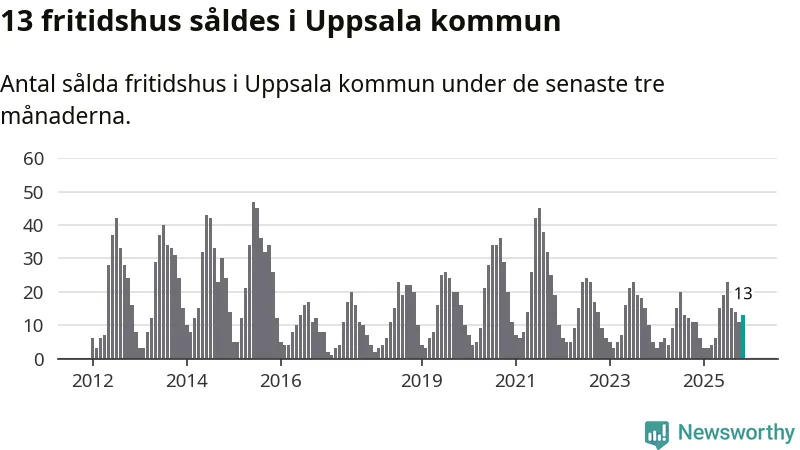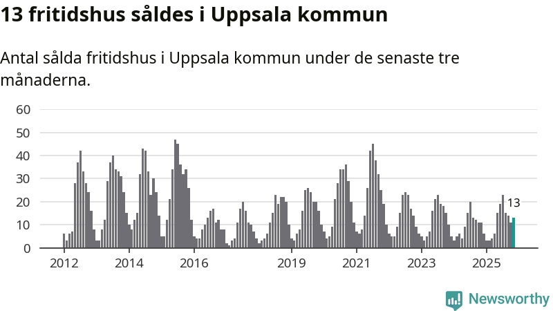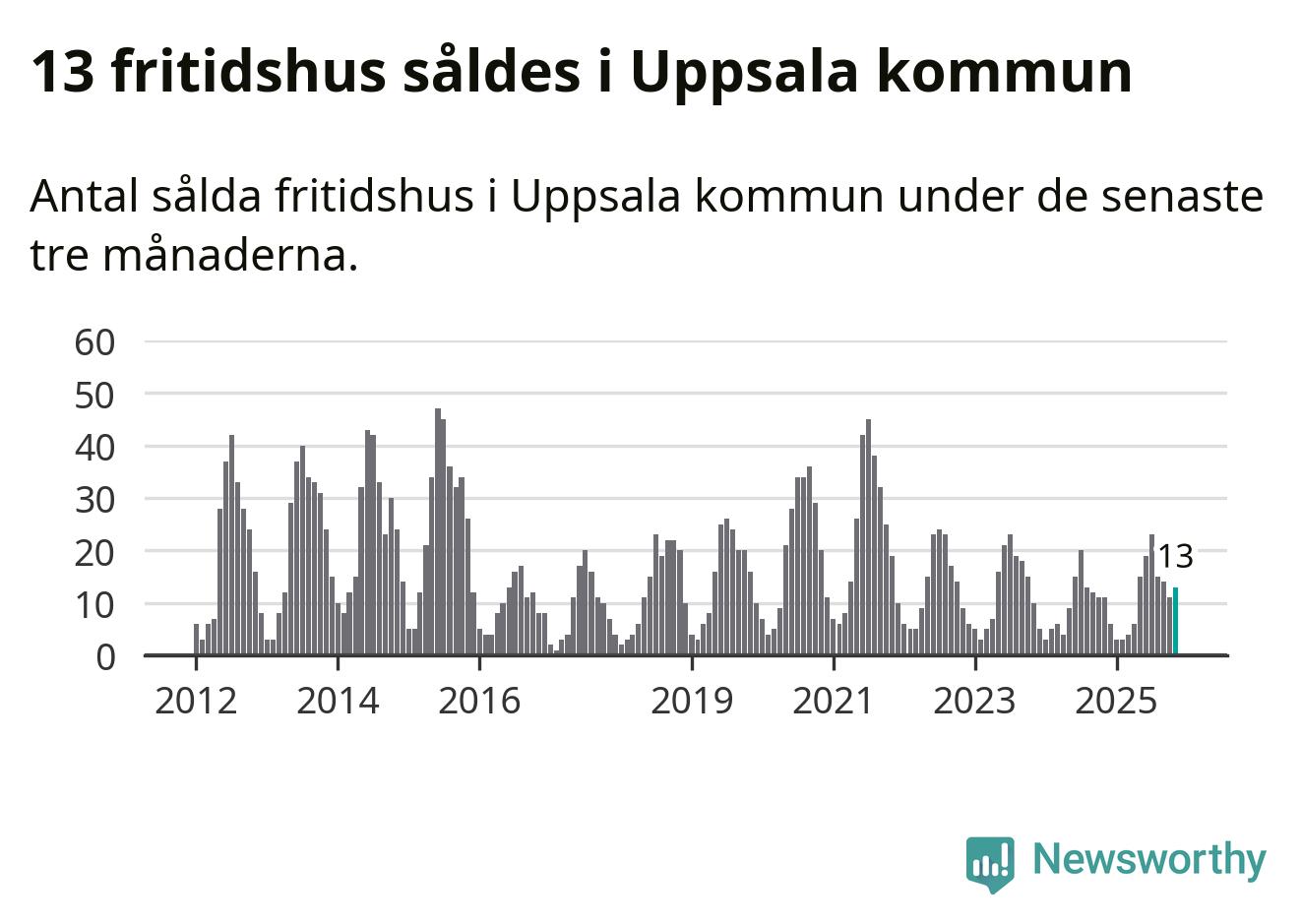 Sammanlagt såldes 13 fritidshus i Uppsala kommun mellan september och november till ett genomsnittligt pris på 1,6 miljoner kronor. I fjol gjordes elva affärer vid den här tiden på året.