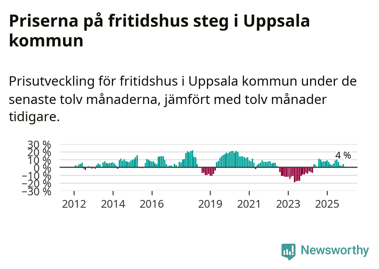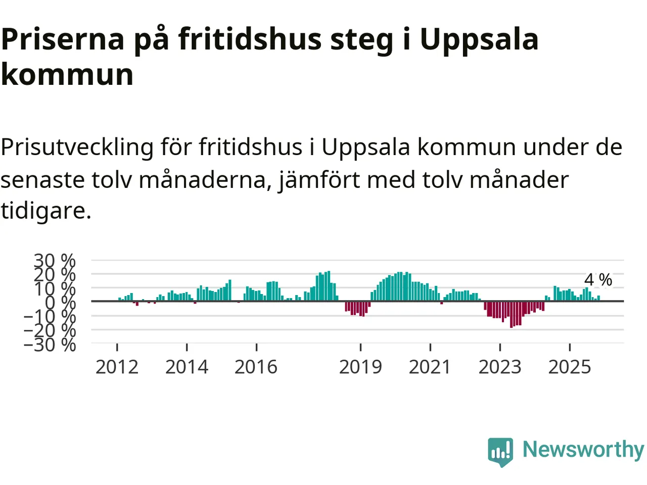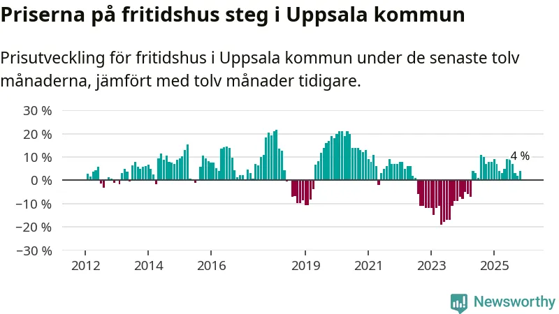 Priserna på fritidshus har gått upp i Uppsala kommun. Medelpriset på försäljningarna under de senaste tolv månaderna visar på en uppgång med 4 procent.