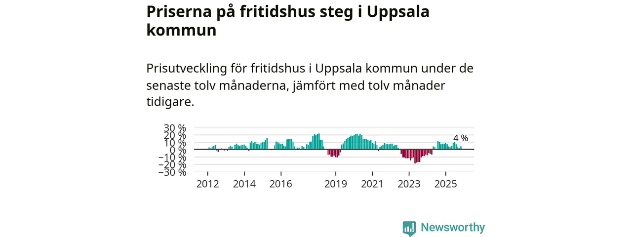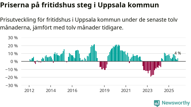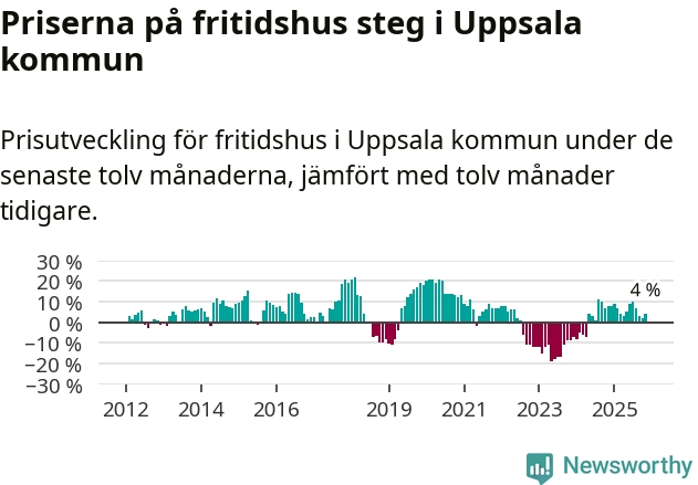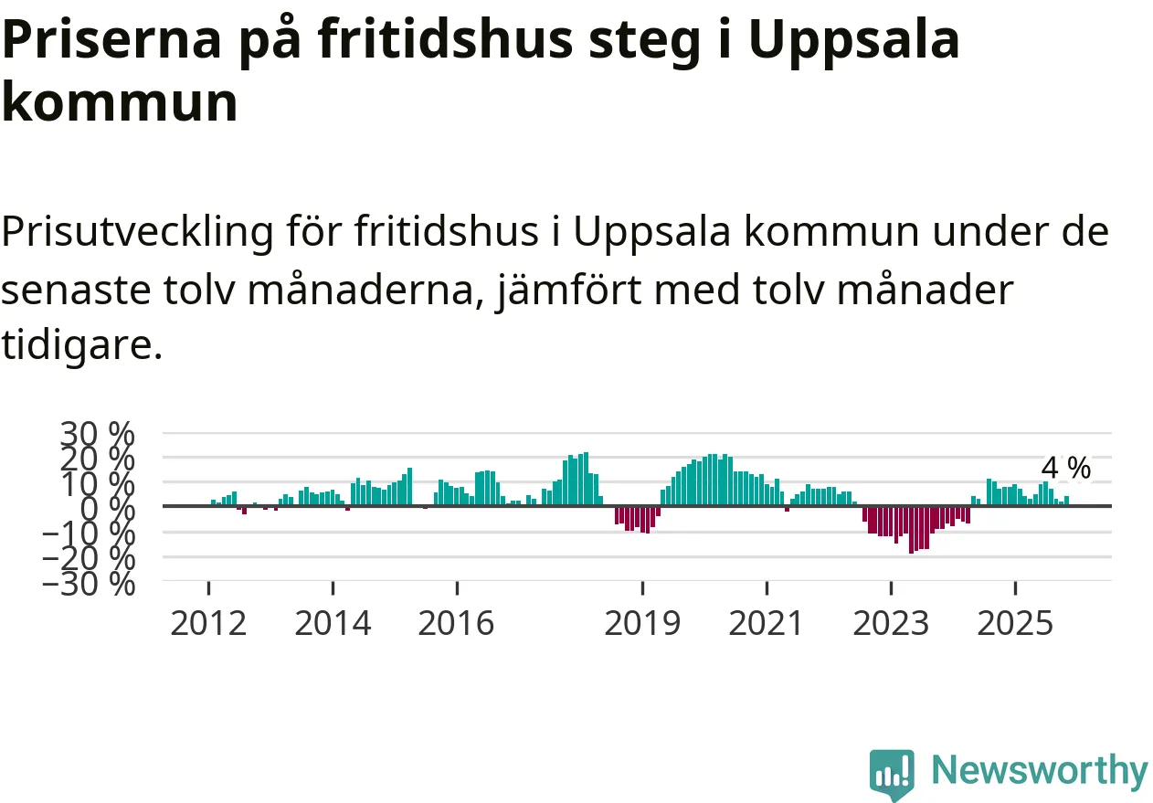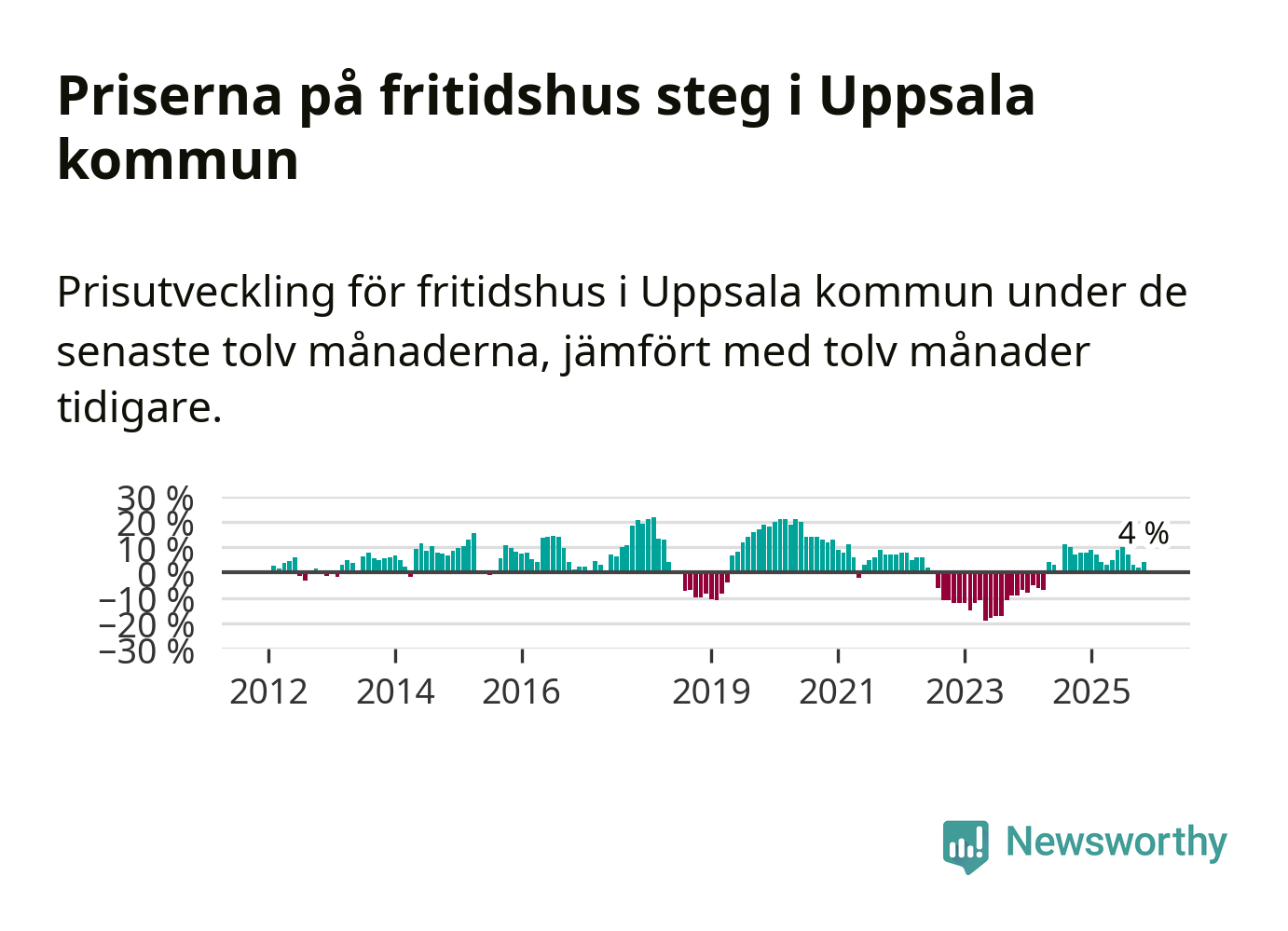 Priserna på fritidshus har gått upp i Uppsala kommun. Medelpriset på försäljningarna under de senaste tolv månaderna visar på en uppgång med 4 procent.