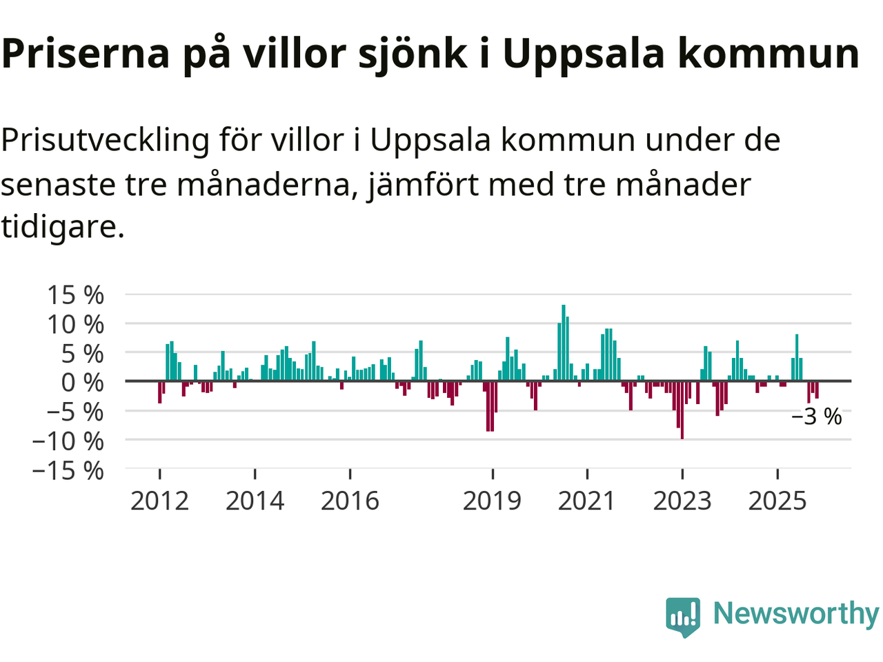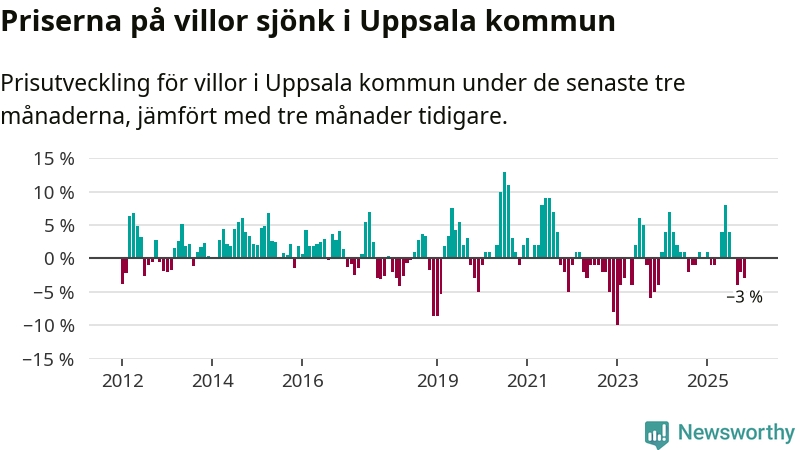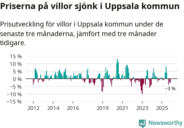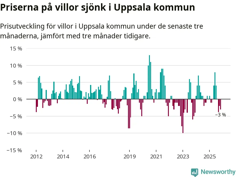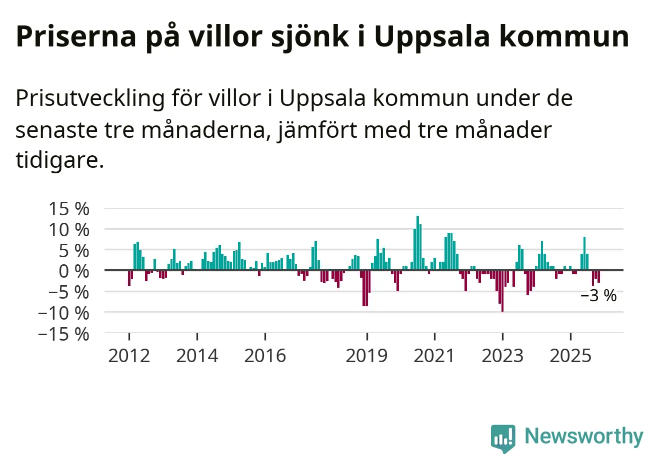 Villapriserna har gått ner i Uppsala kommun. Medelpriset på försäljningarna under de senaste tre månaderna visar på en nedgång med 3 procent.