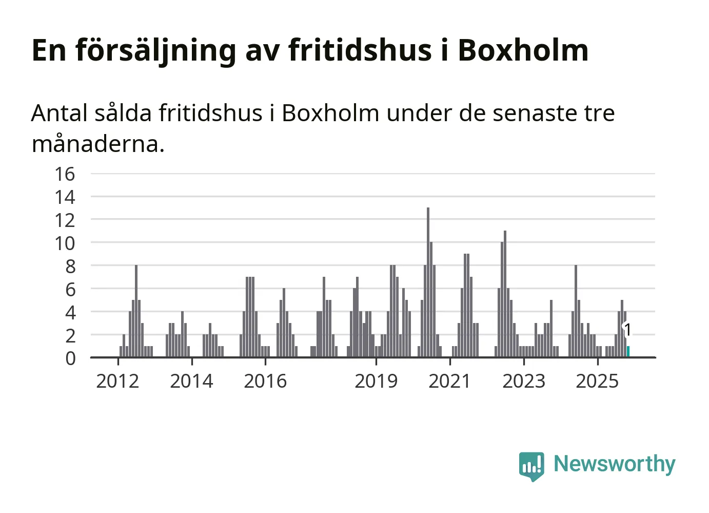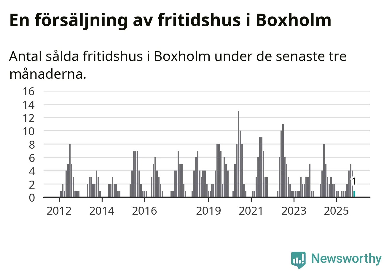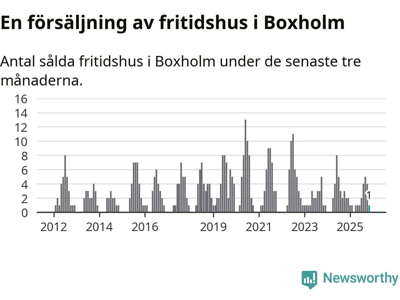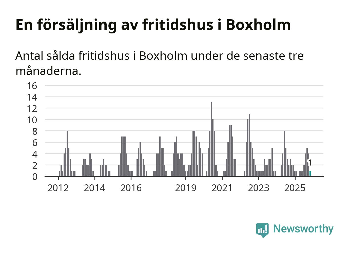 Mellan september och november gjordes sammanlagt en affär med fritidshus i Boxholms kommun. Det kan jämföras med två vid motsvarande tid i fjol.