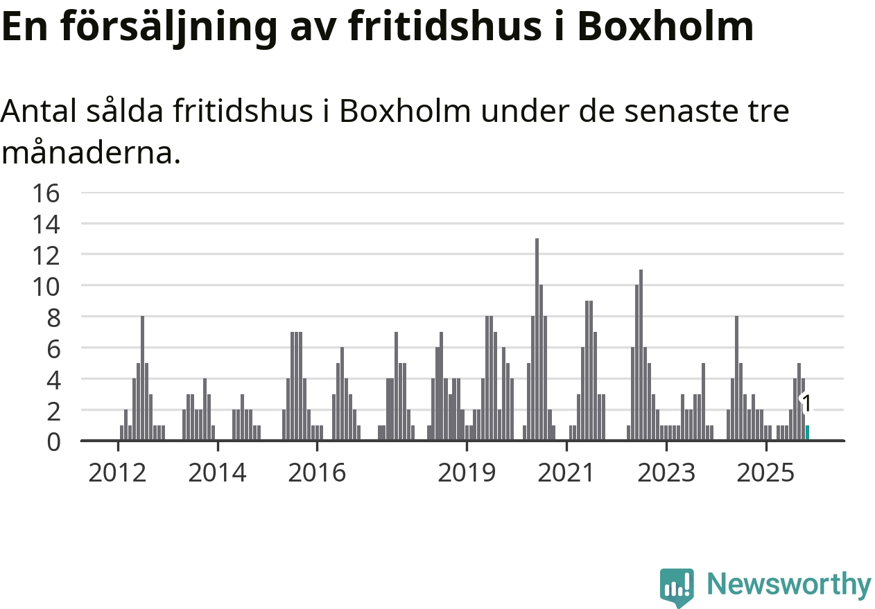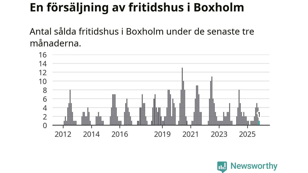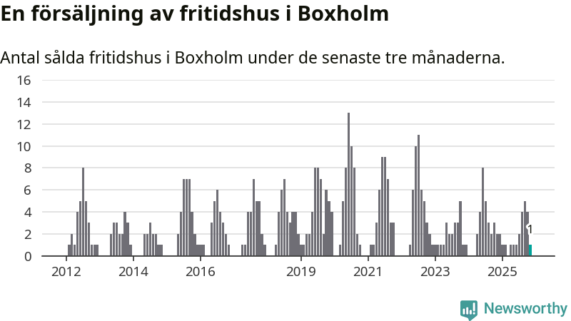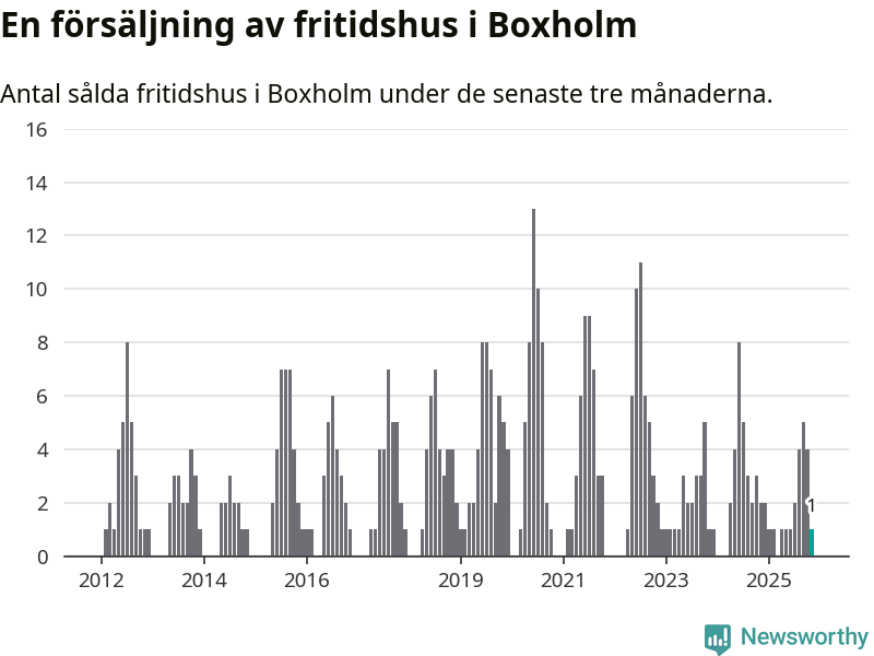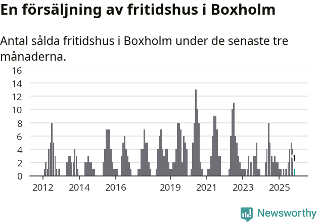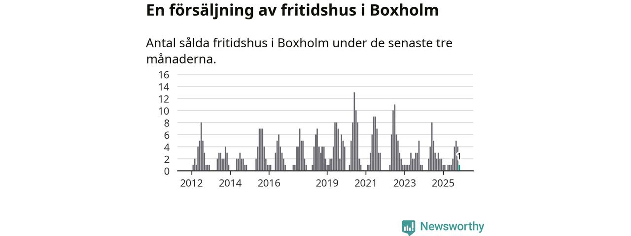 Mellan september och november gjordes sammanlagt en affär med fritidshus i Boxholms kommun. Det kan jämföras med två vid motsvarande tid i fjol.
