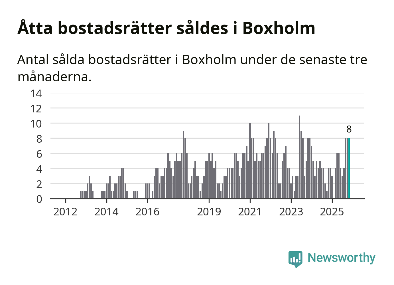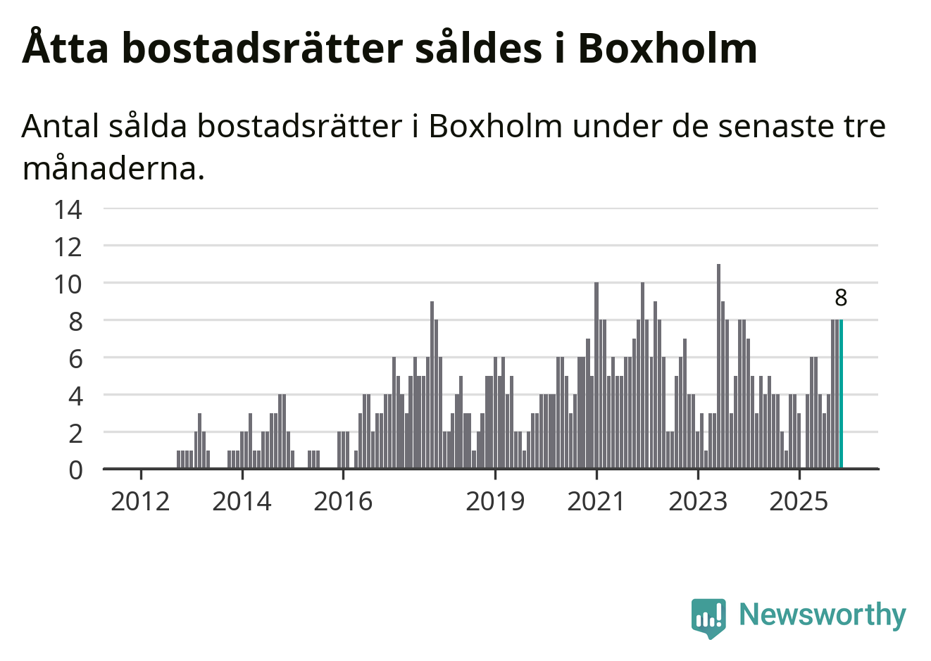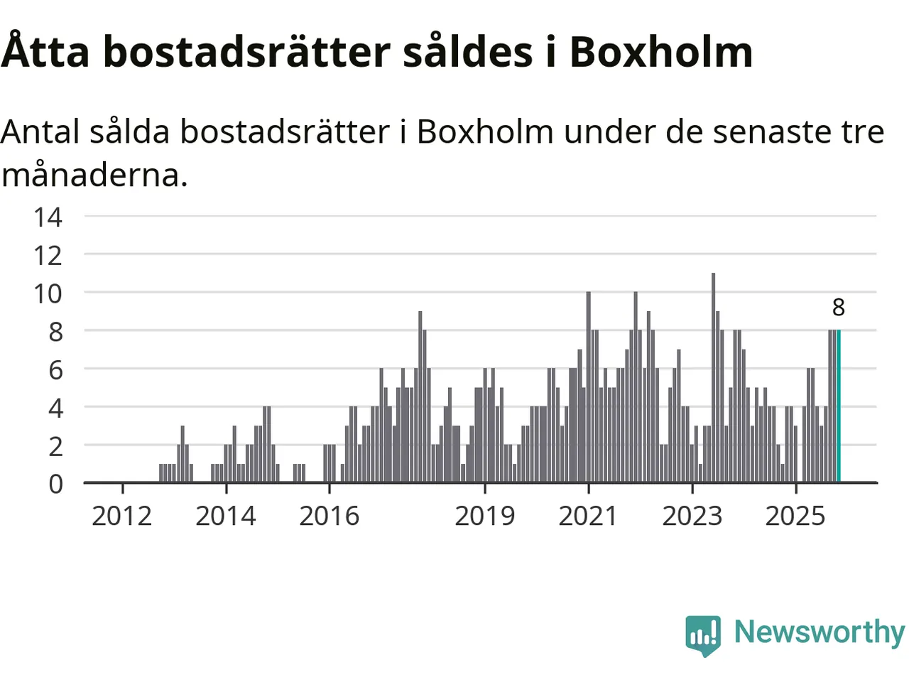 Mellan september och november gjordes sammanlagt åtta affärer med bostadsrätter i Boxholms kommun. Det kan jämföras med fyra vid motsvarande tid i fjol.