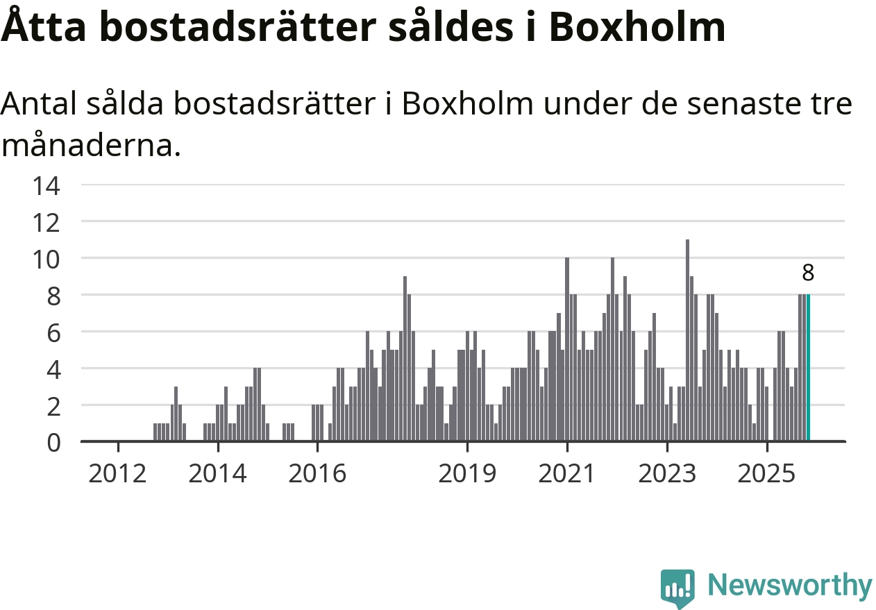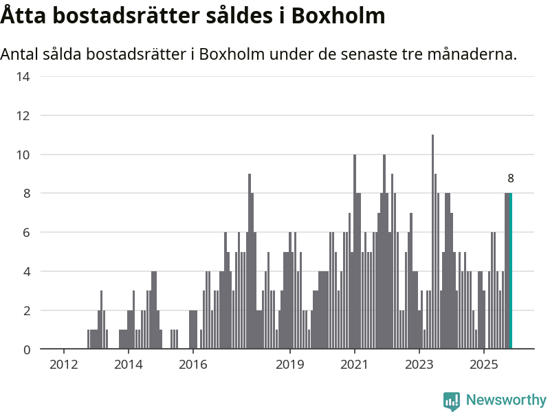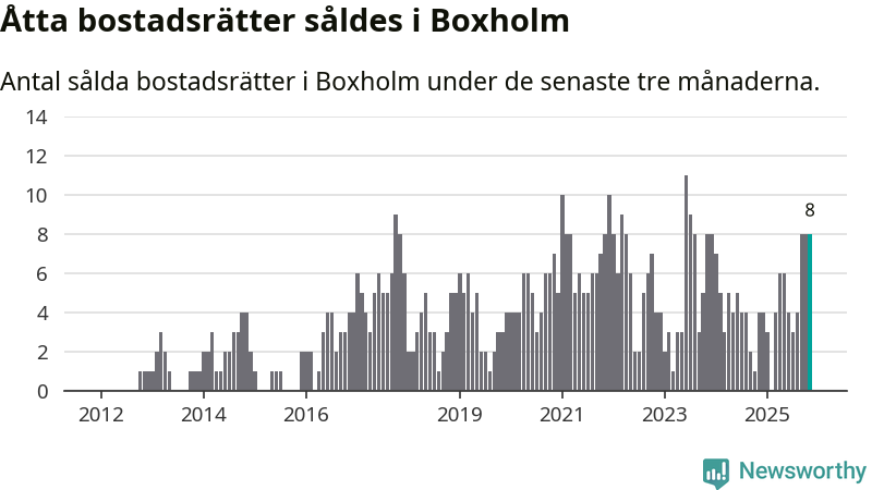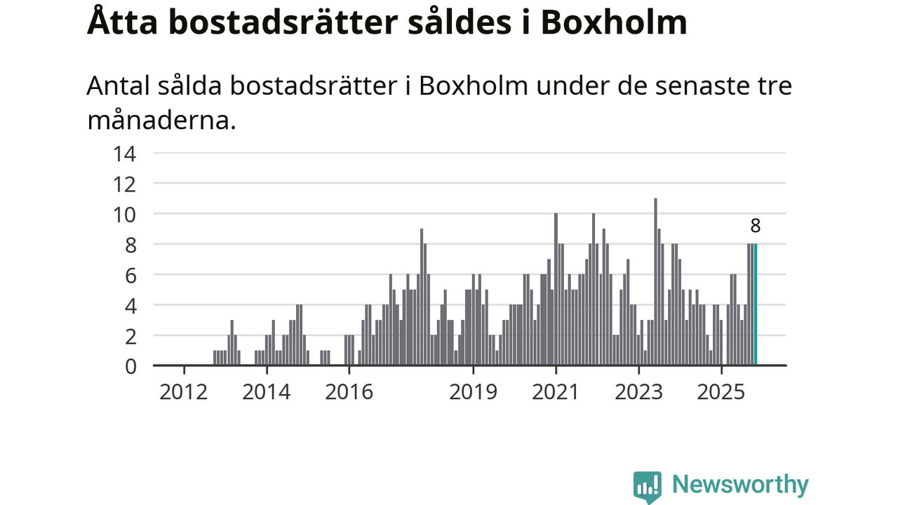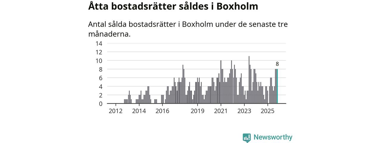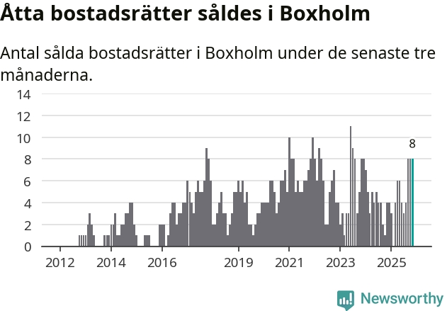 Mellan september och november gjordes sammanlagt åtta affärer med bostadsrätter i Boxholms kommun. Det kan jämföras med fyra vid motsvarande tid i fjol.