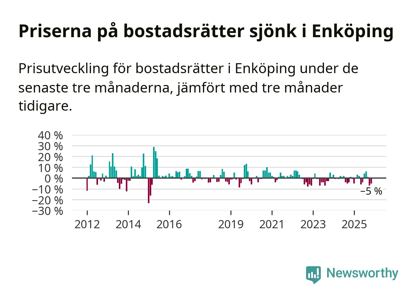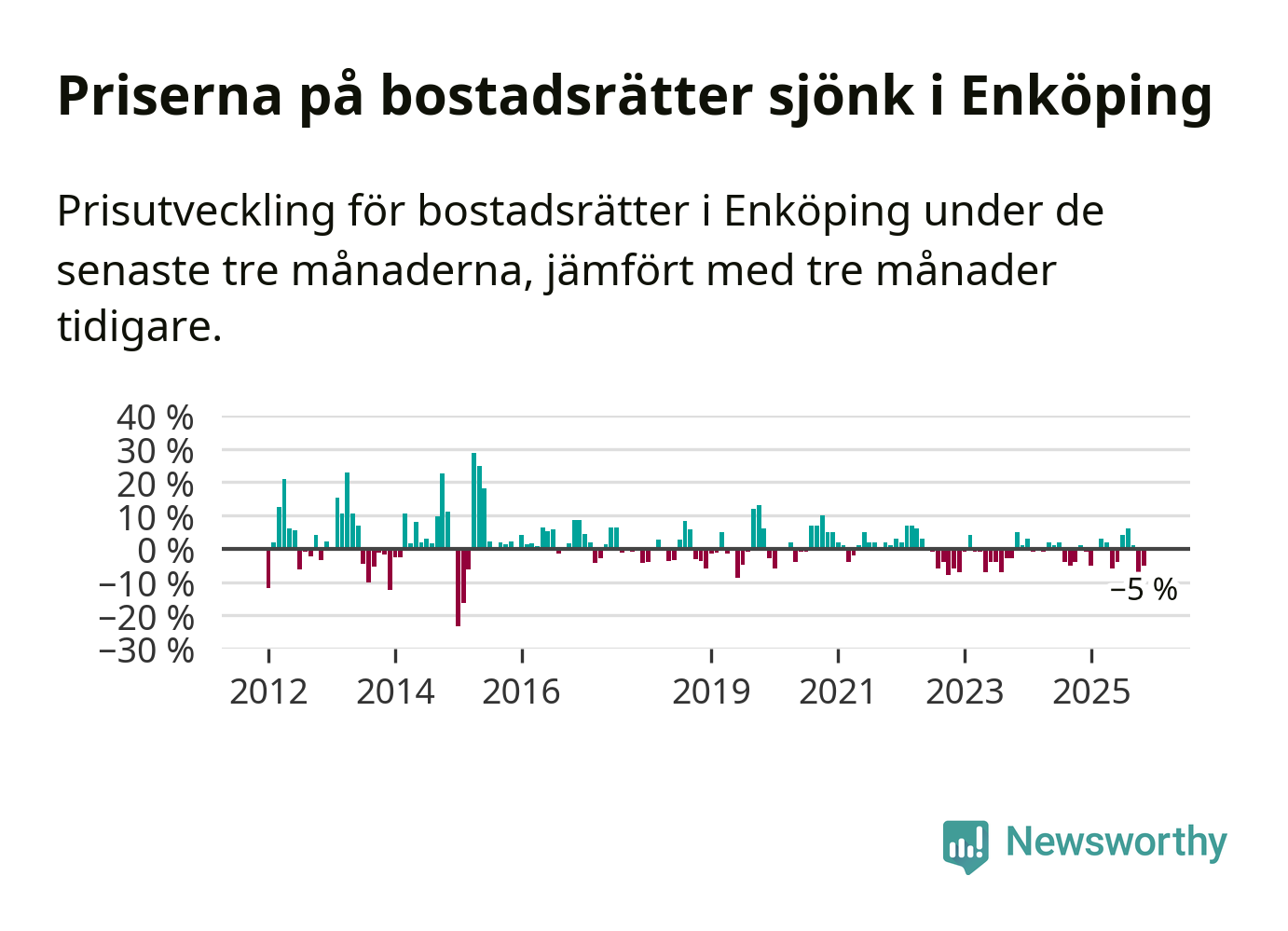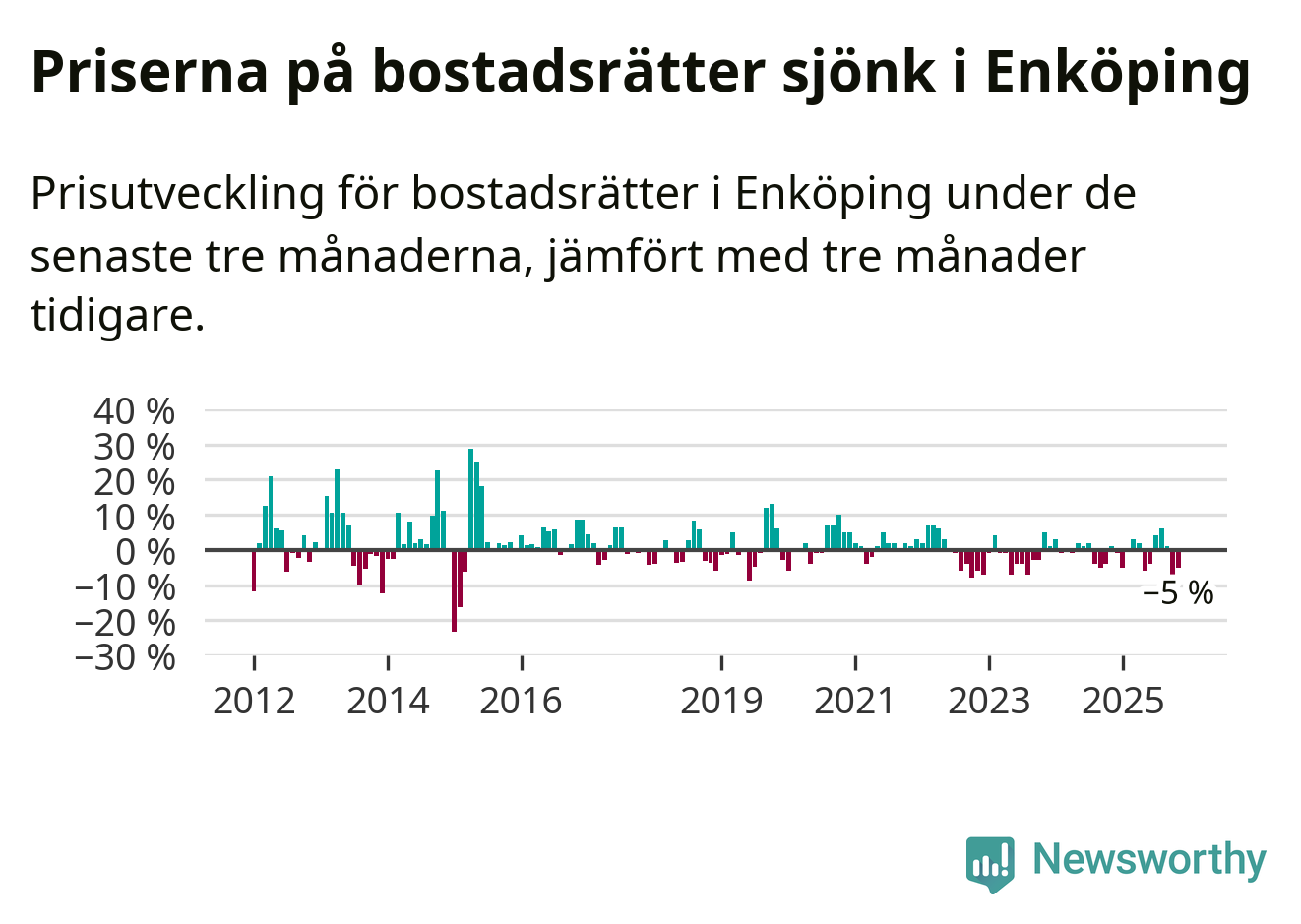 Priserna på bostadsrätter har gått ner i Enköpings kommun. Medelpriset på försäljningarna under de senaste tre månaderna visar på en nedgång med 5 procent.
