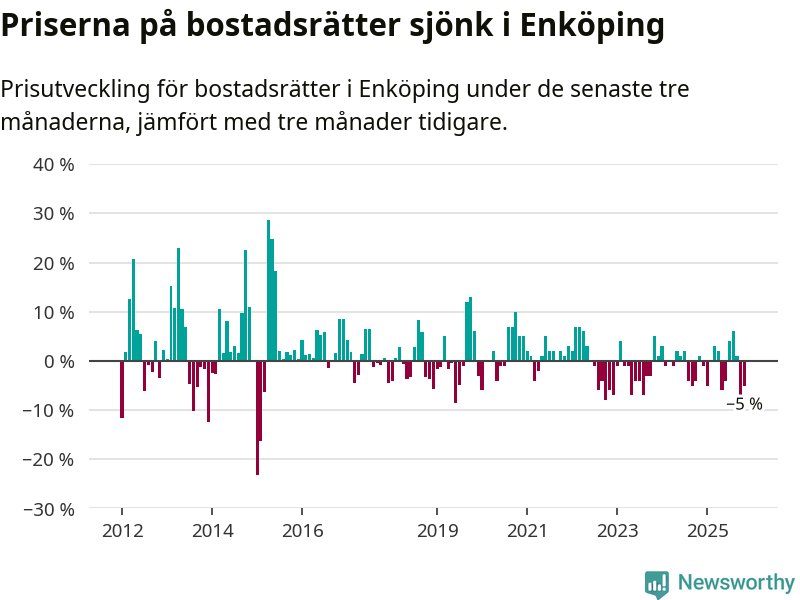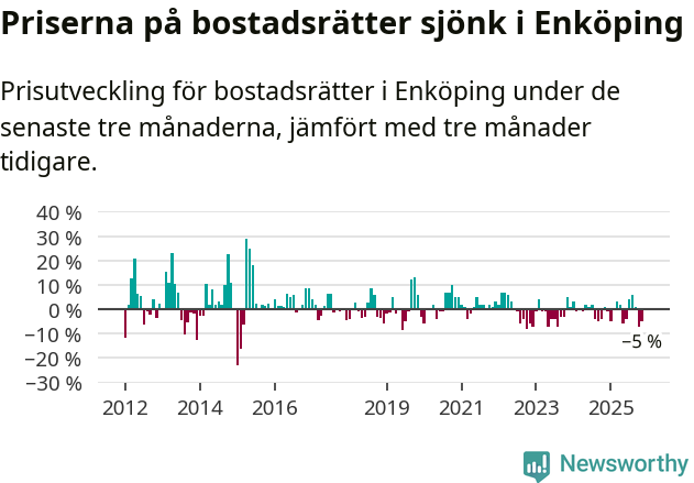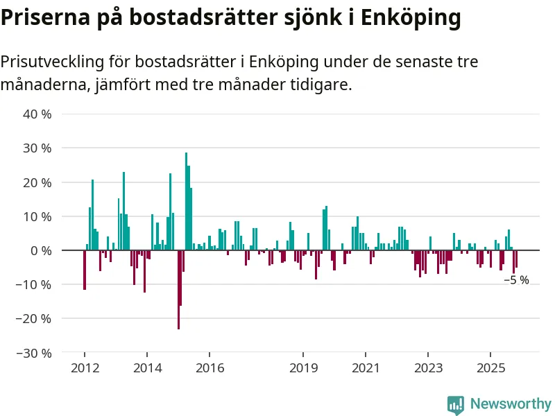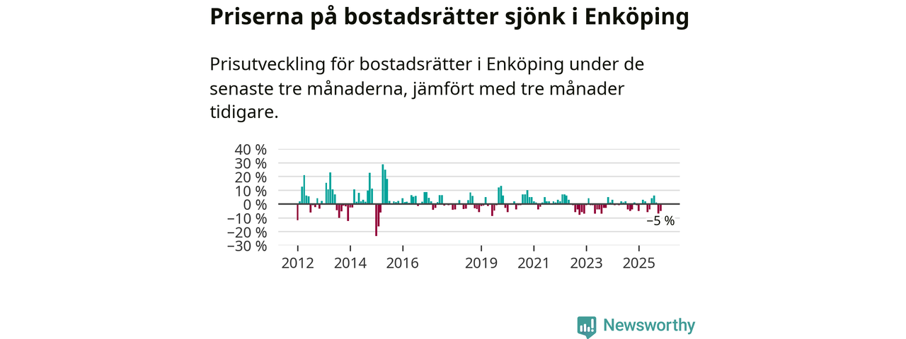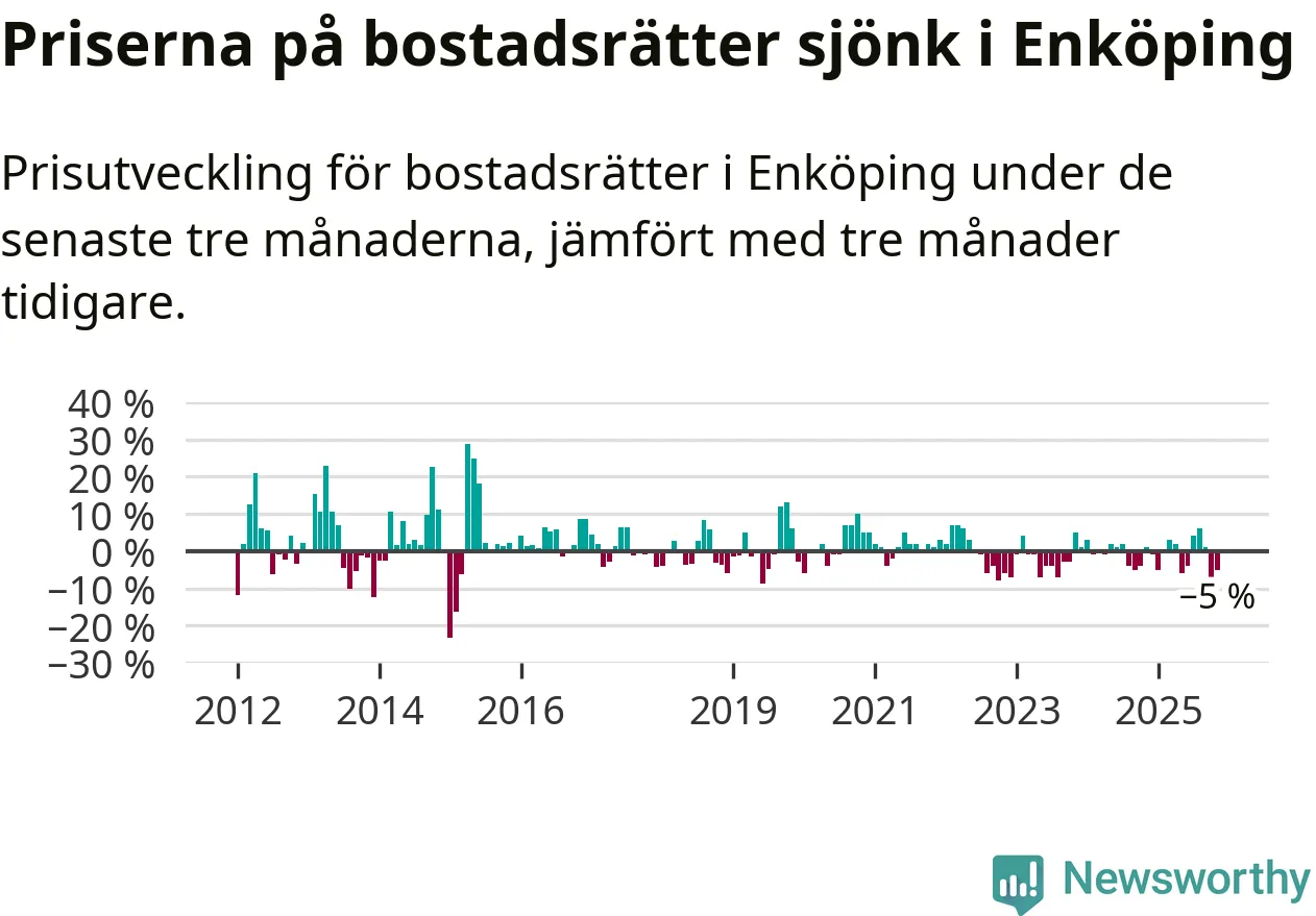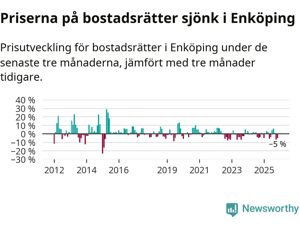 Priserna på bostadsrätter har gått ner i Enköpings kommun. Medelpriset på försäljningarna under de senaste tre månaderna visar på en nedgång med 5 procent.