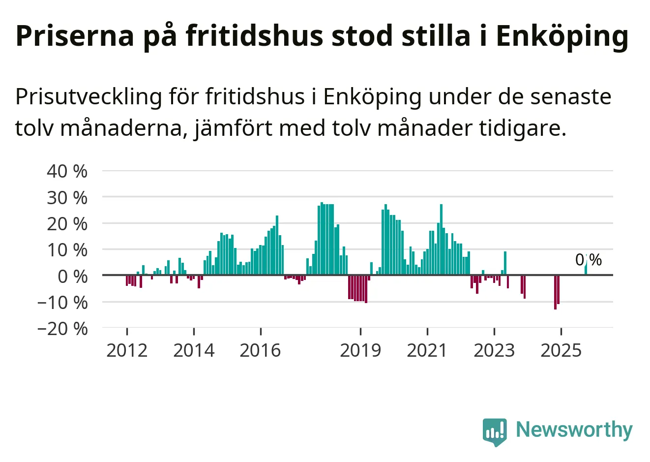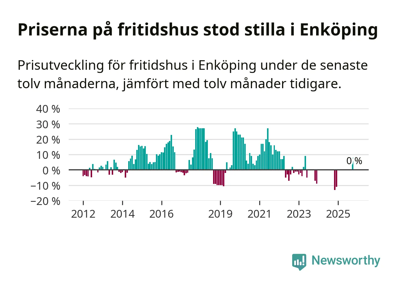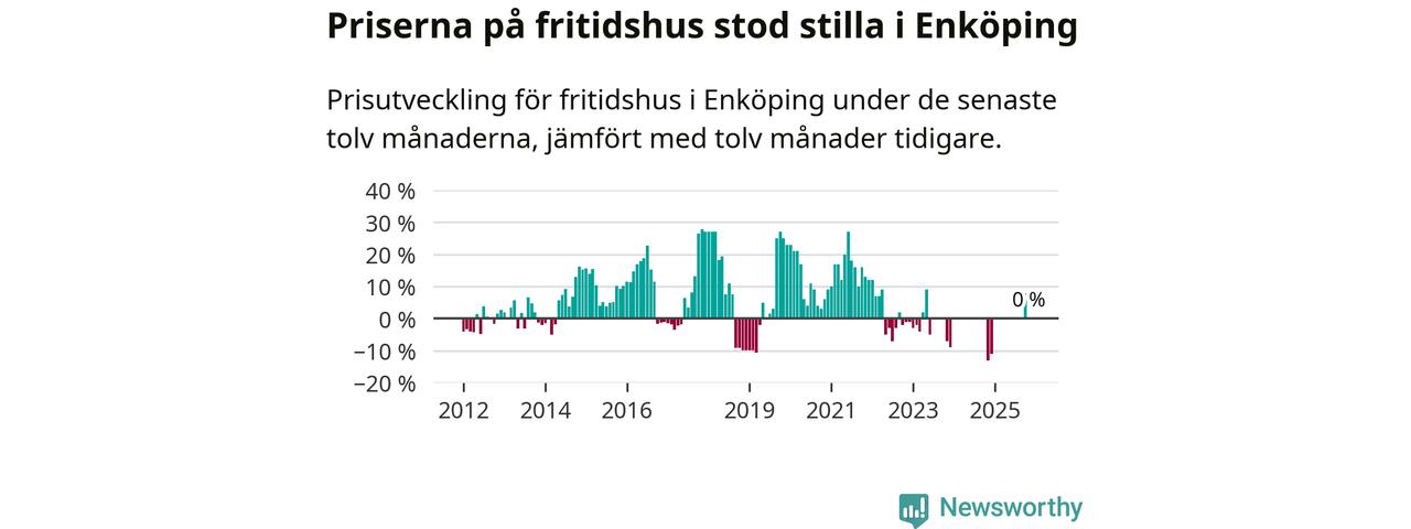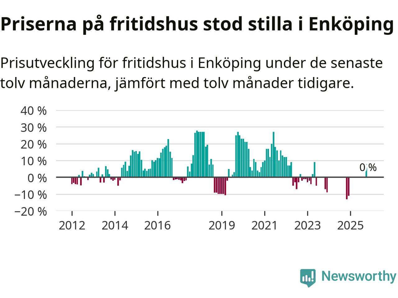 Priserna på fritidshus står i stort sett stilla i Enköpings kommun. Medelpriset på de på försäljningarna under de senaste tolv månaderna låg på samma nivå som för ett år sedan.