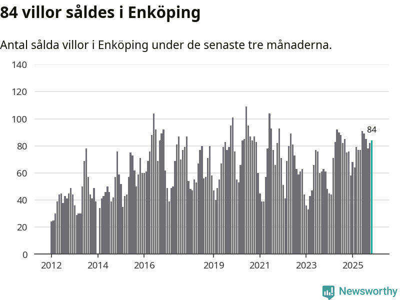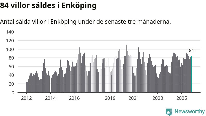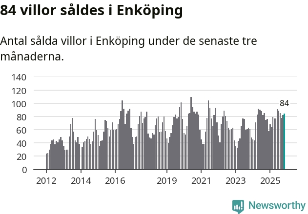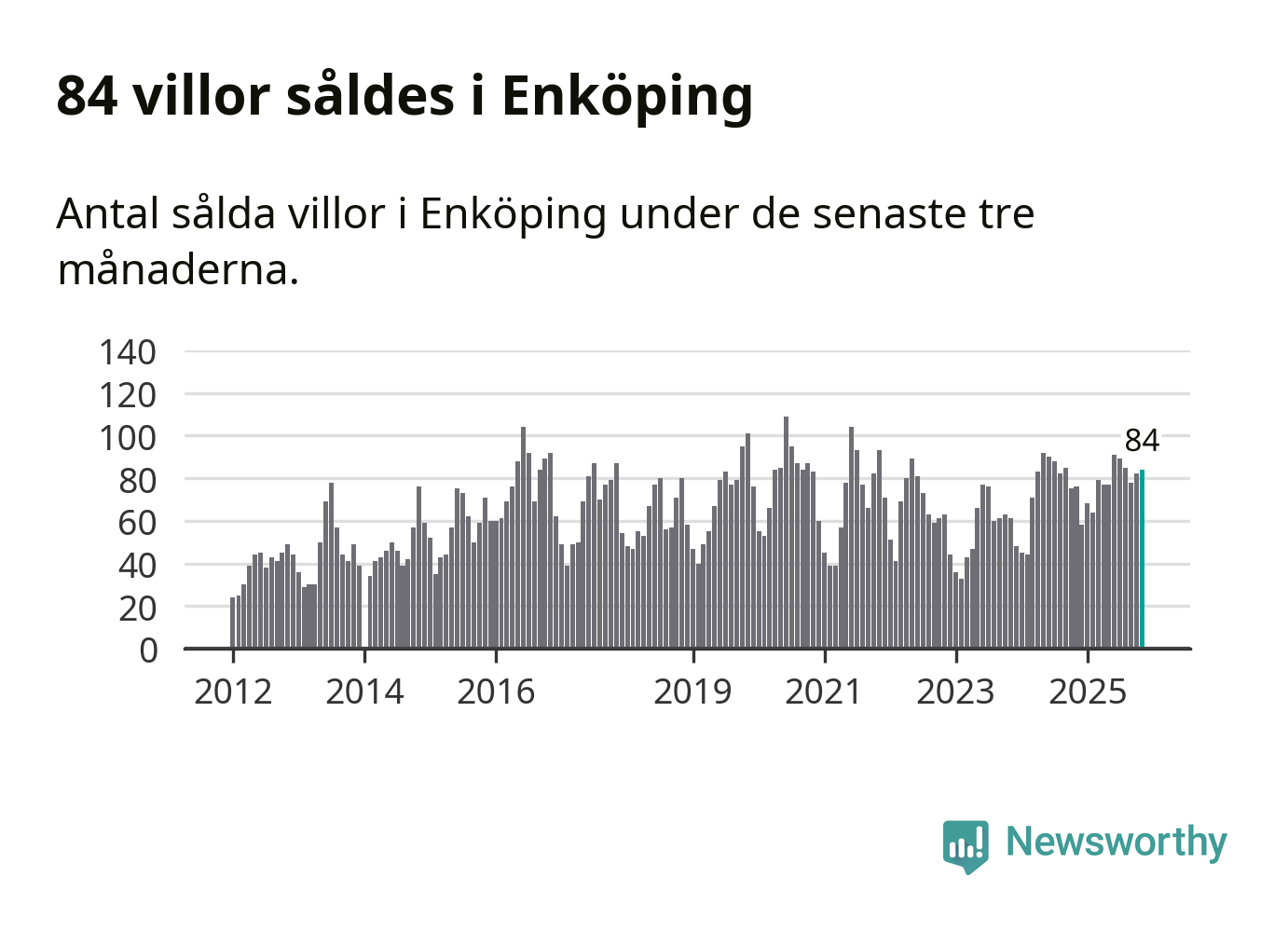 Sammanlagt såldes 84 villor i Enköpings kommun mellan september och november till ett genomsnittligt pris på 3,7 miljoner kronor. I fjol gjordes 76 affärer vid den här tiden på året.