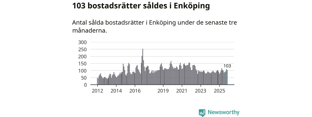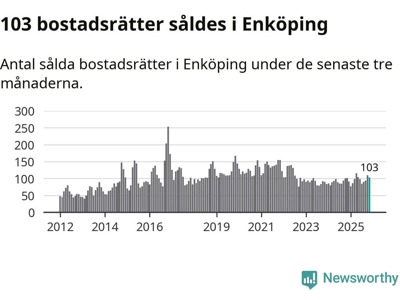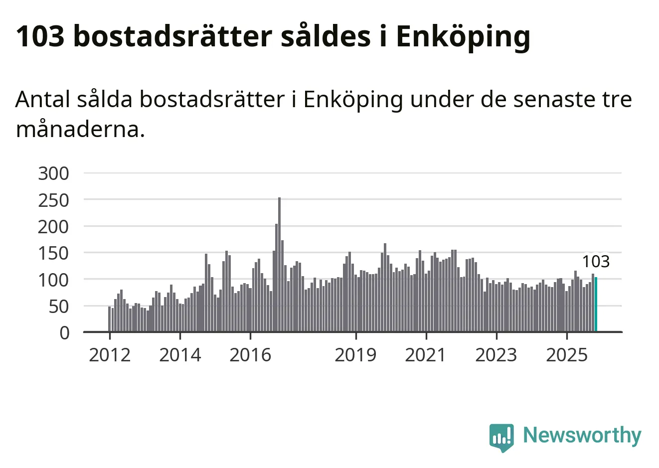 Sammanlagt såldes 103 bostadsrätter i Enköpings kommun mellan september och november till ett genomsnittligt pris på 1,6 miljoner kronor. I fjol gjordes 101 affärer vid den här tiden på året.