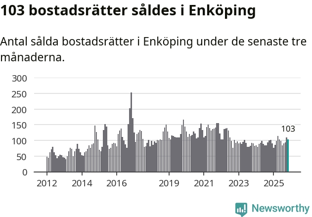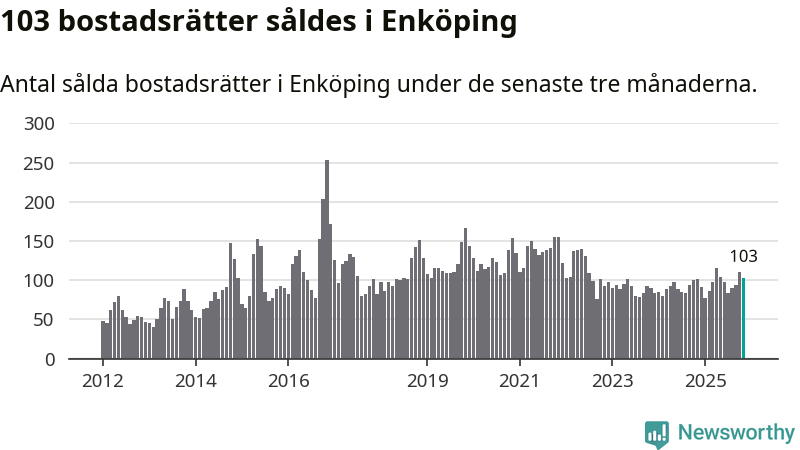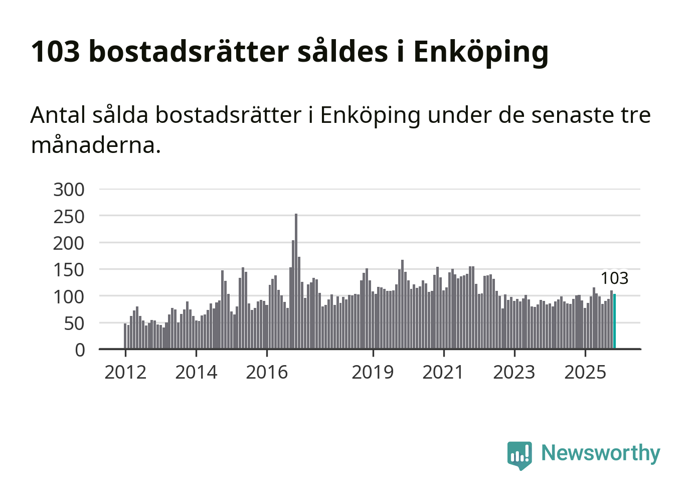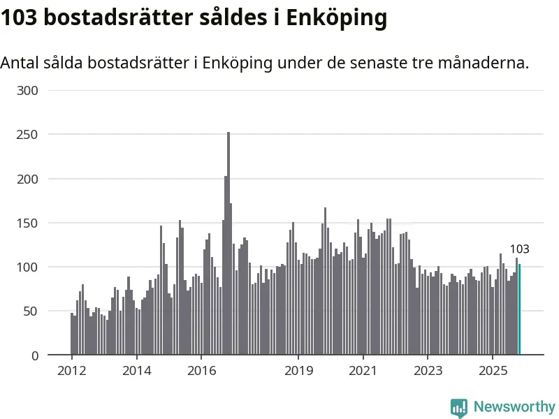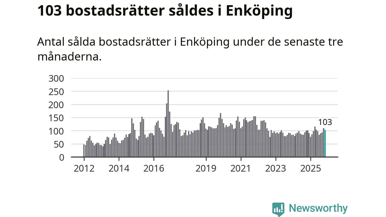 Sammanlagt såldes 103 bostadsrätter i Enköpings kommun mellan september och november till ett genomsnittligt pris på 1,6 miljoner kronor. I fjol gjordes 101 affärer vid den här tiden på året.