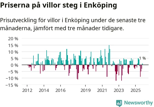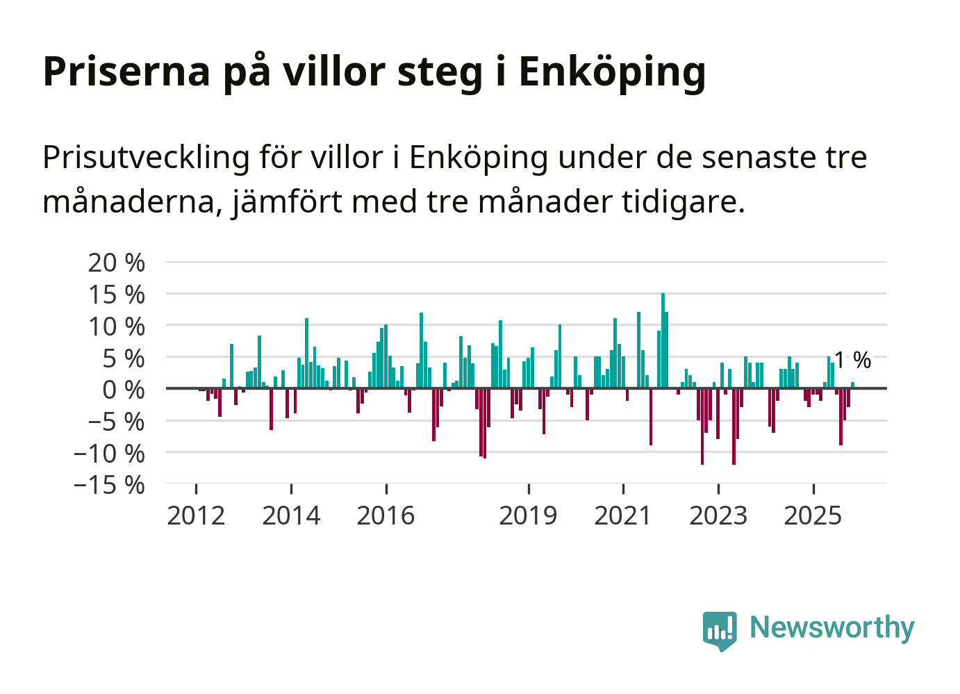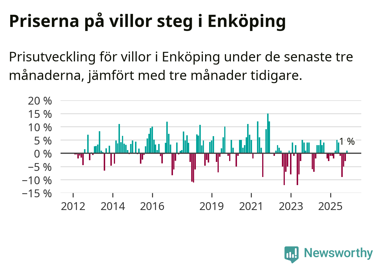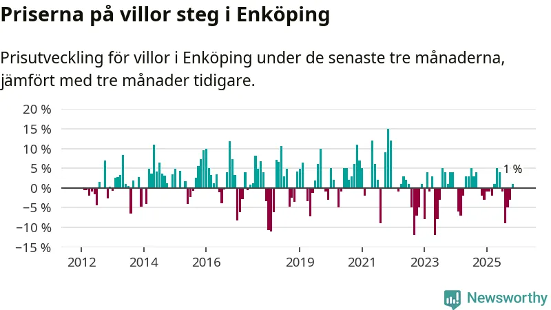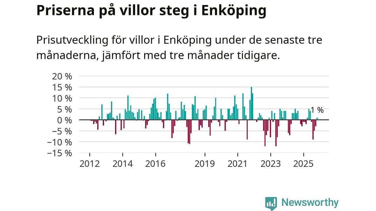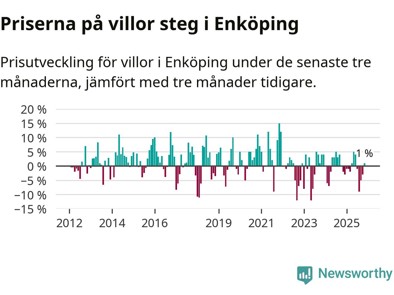 Villapriserna har gått upp i Enköpings kommun. Medelpriset på försäljningarna under de senaste tre månaderna visar på en uppgång med 1 procent.