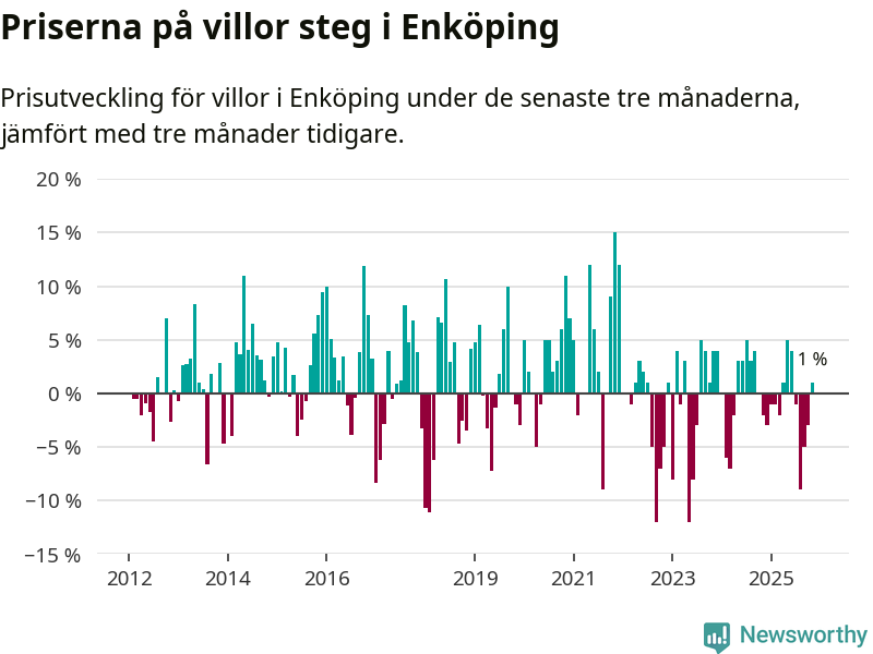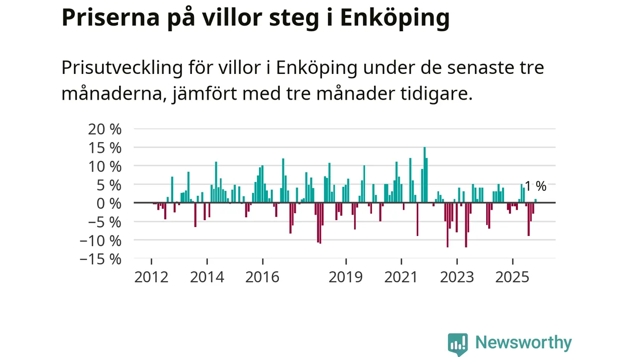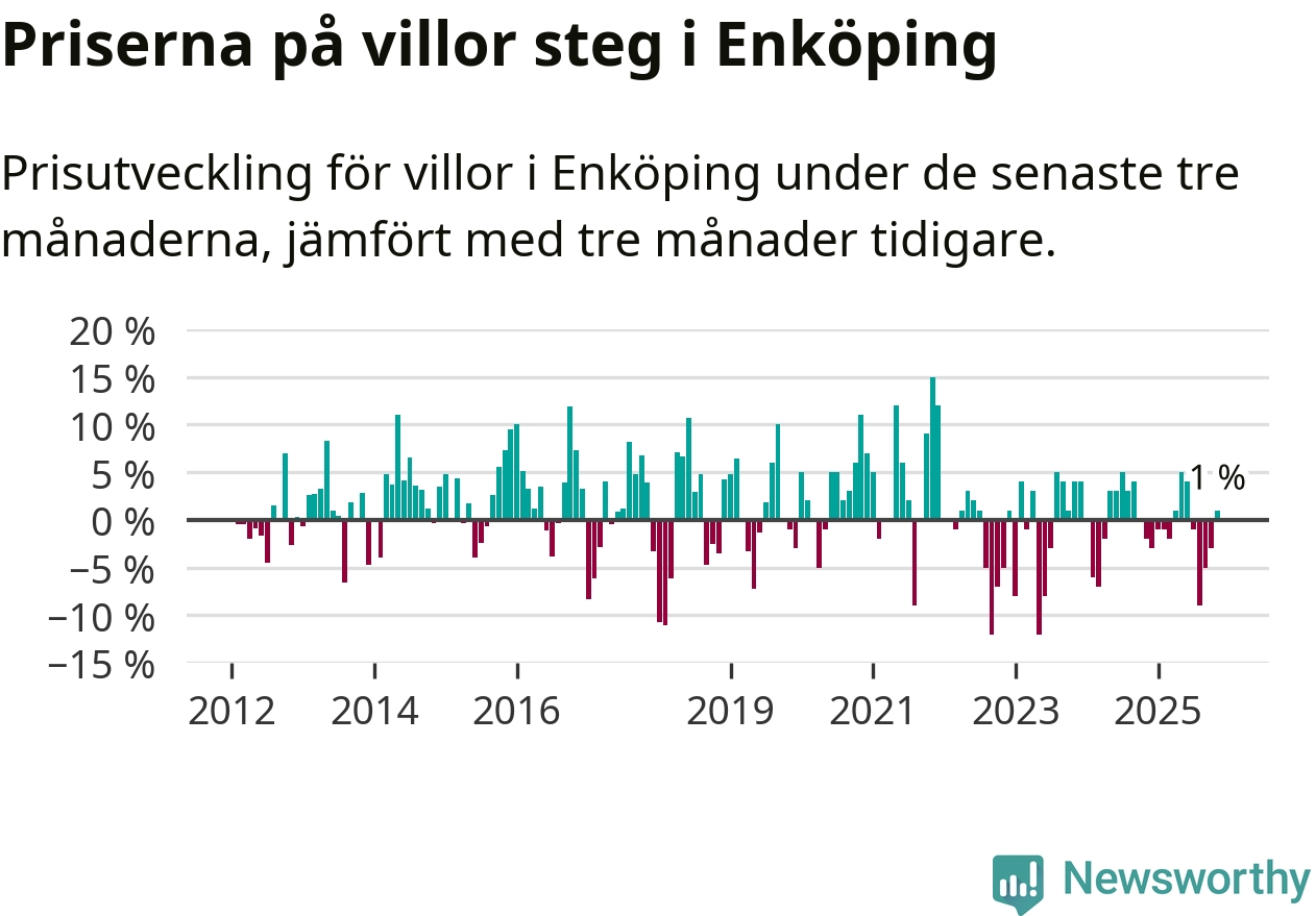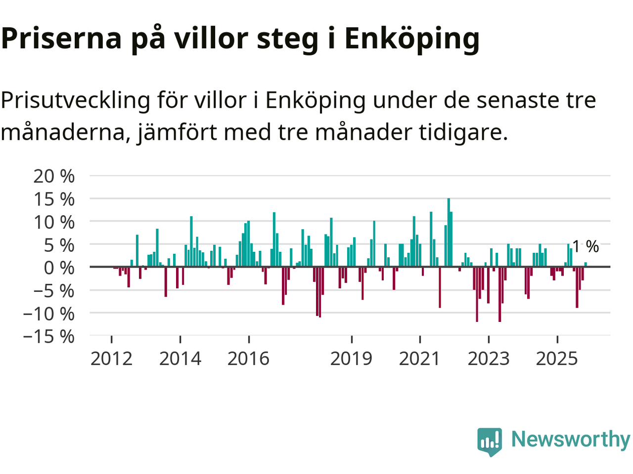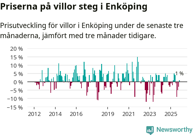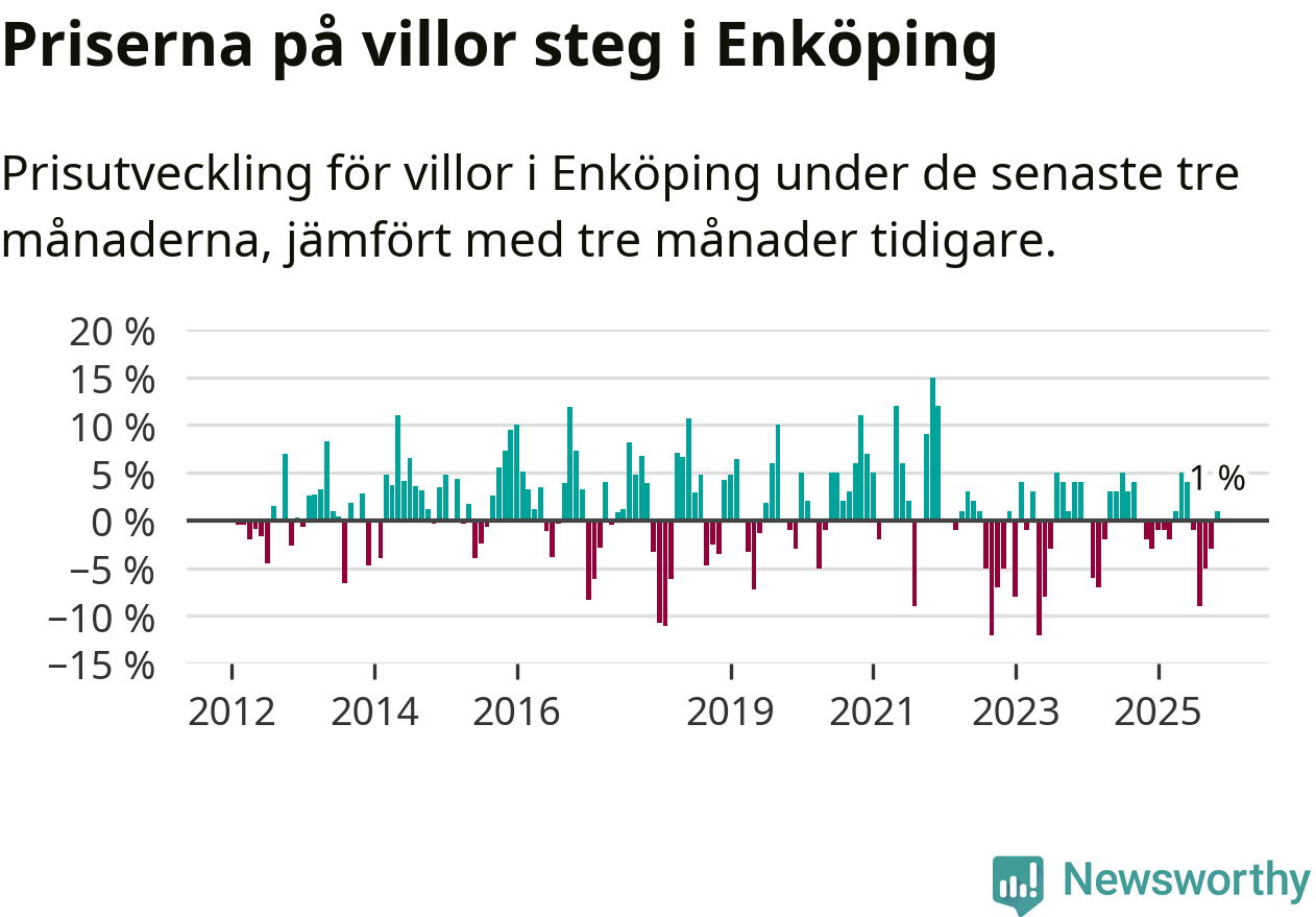 Villapriserna har gått upp i Enköpings kommun. Medelpriset på försäljningarna under de senaste tre månaderna visar på en uppgång med 1 procent.