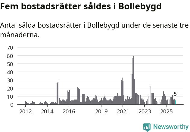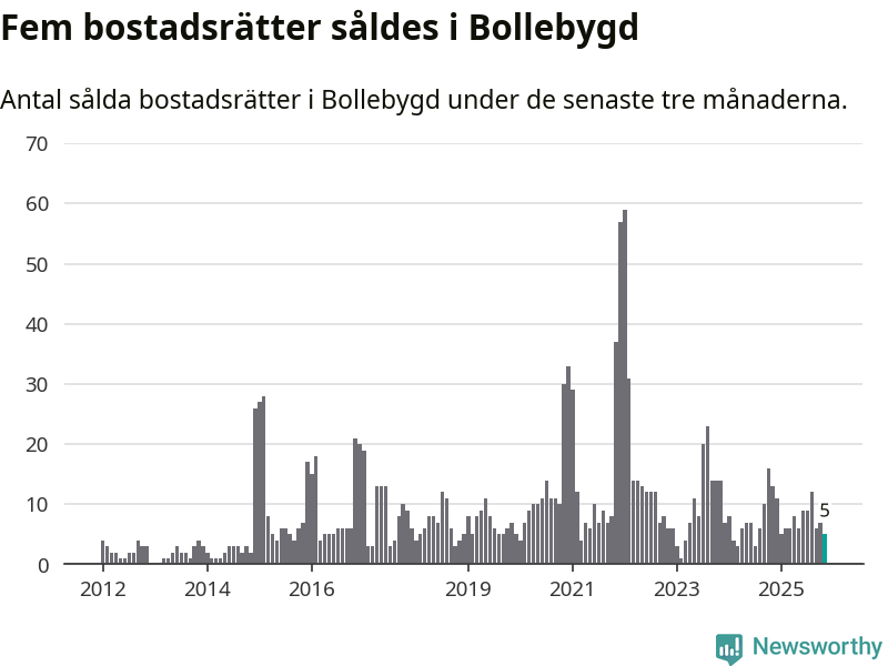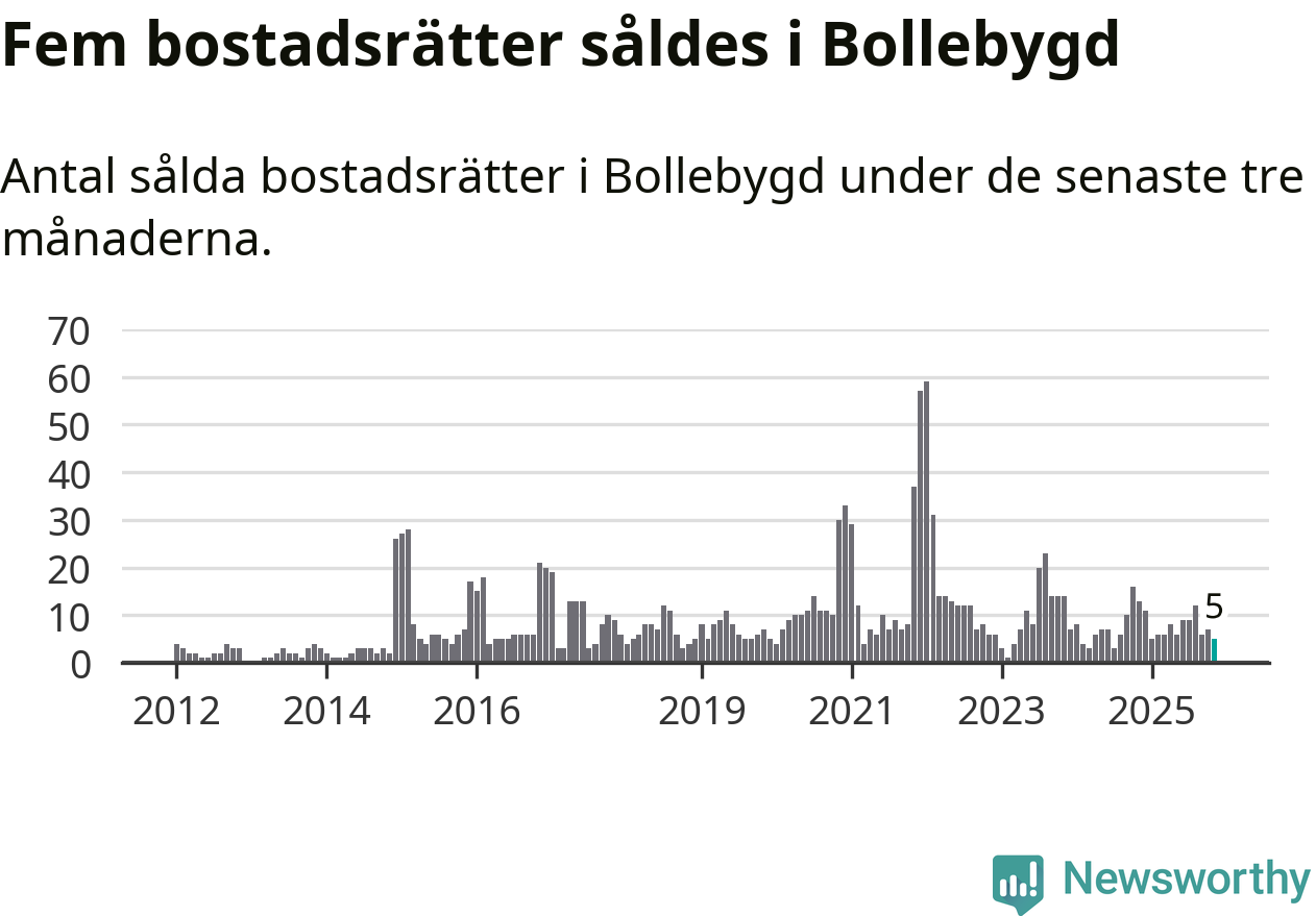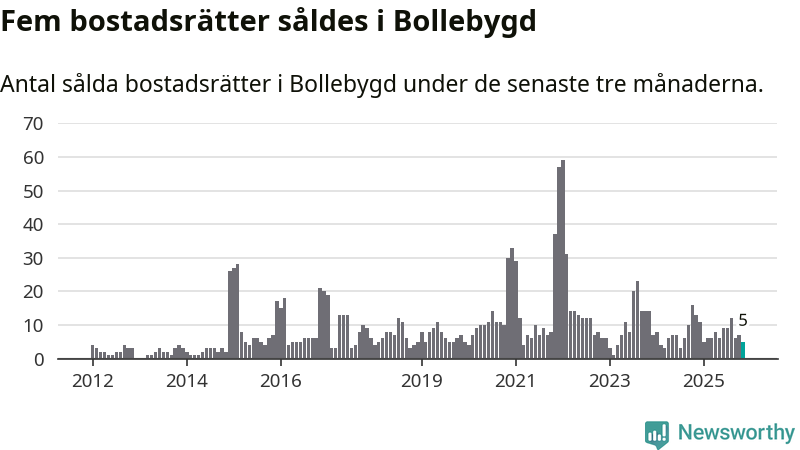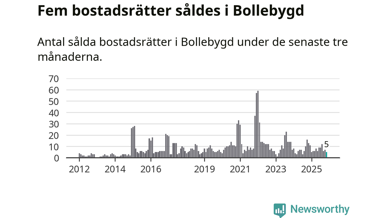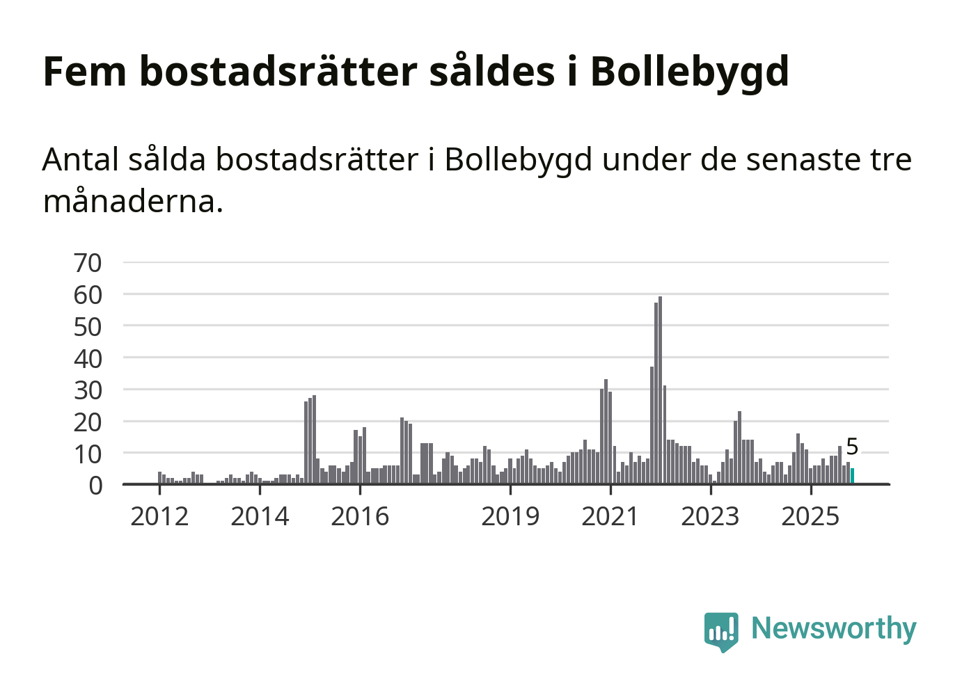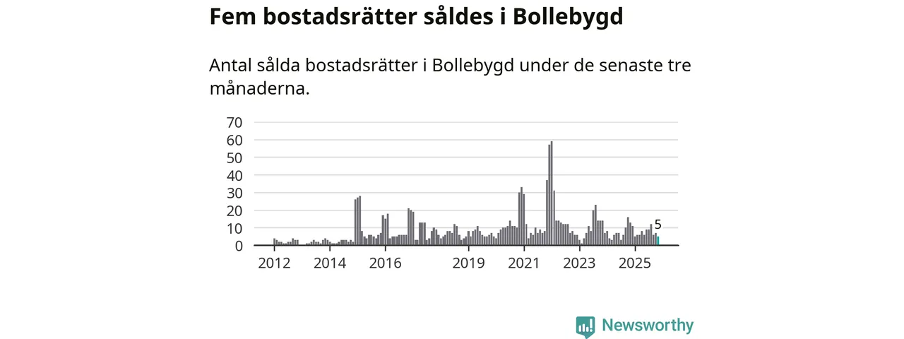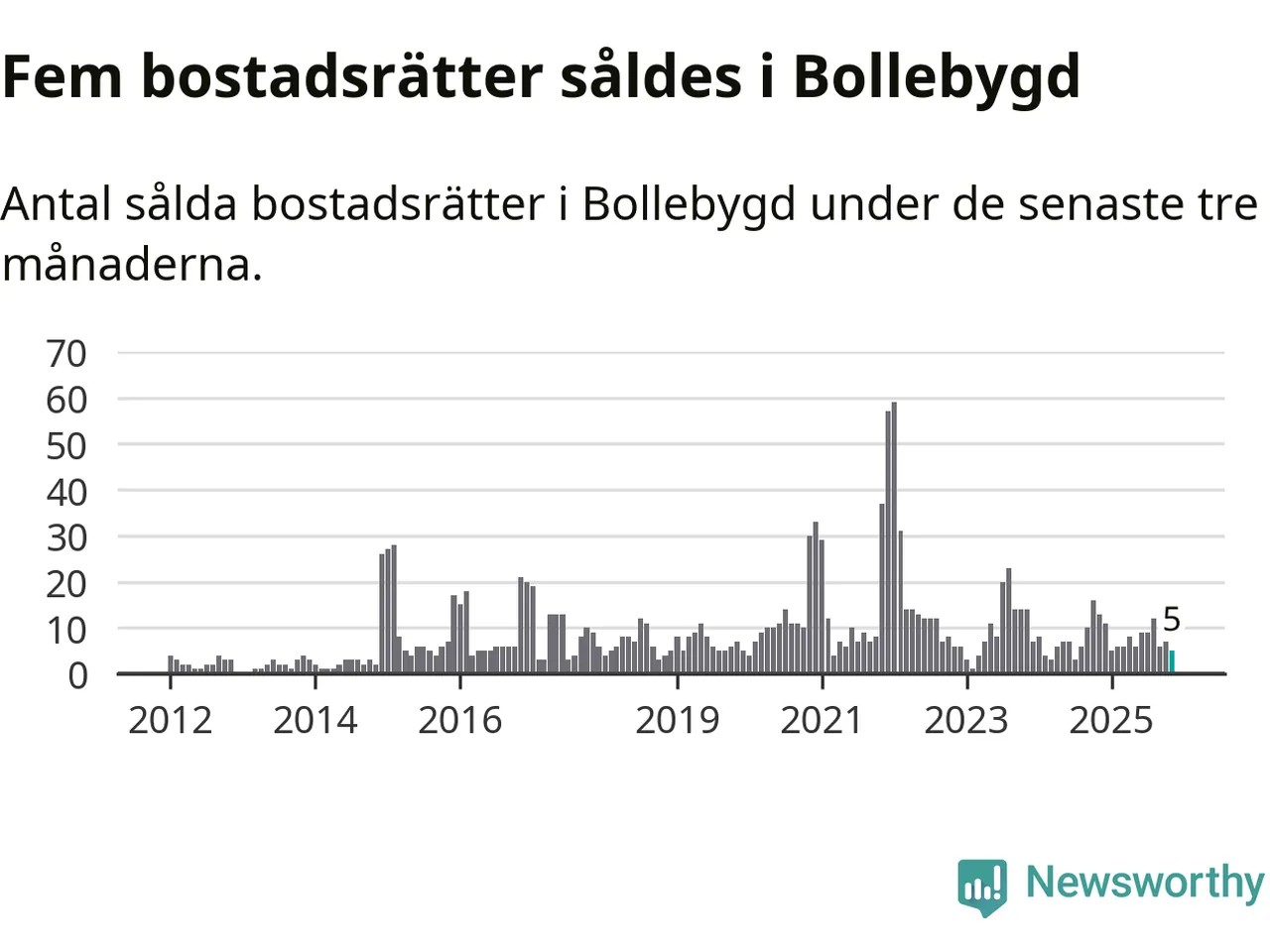Mellan september och november gjordes sammanlagt fem affärer med bostadsrätter i Bollebygds kommun. Det kan jämföras med 13 vid motsvarande tid i fjol.