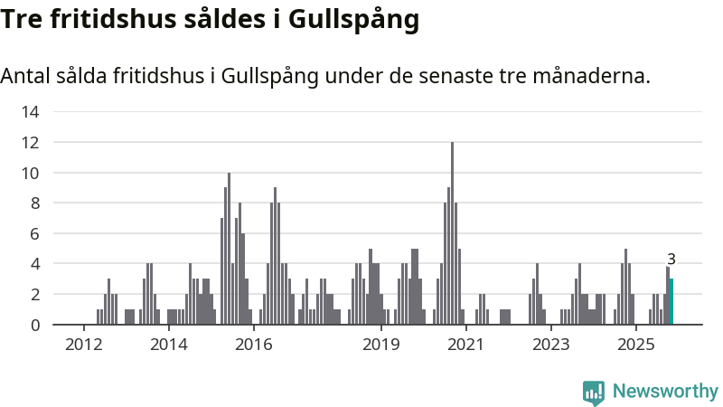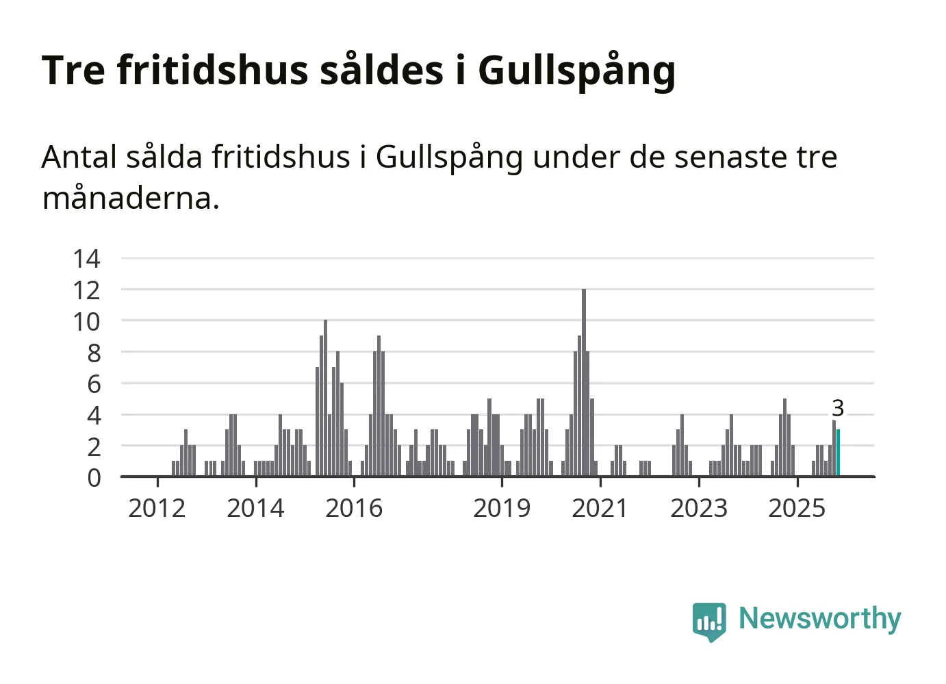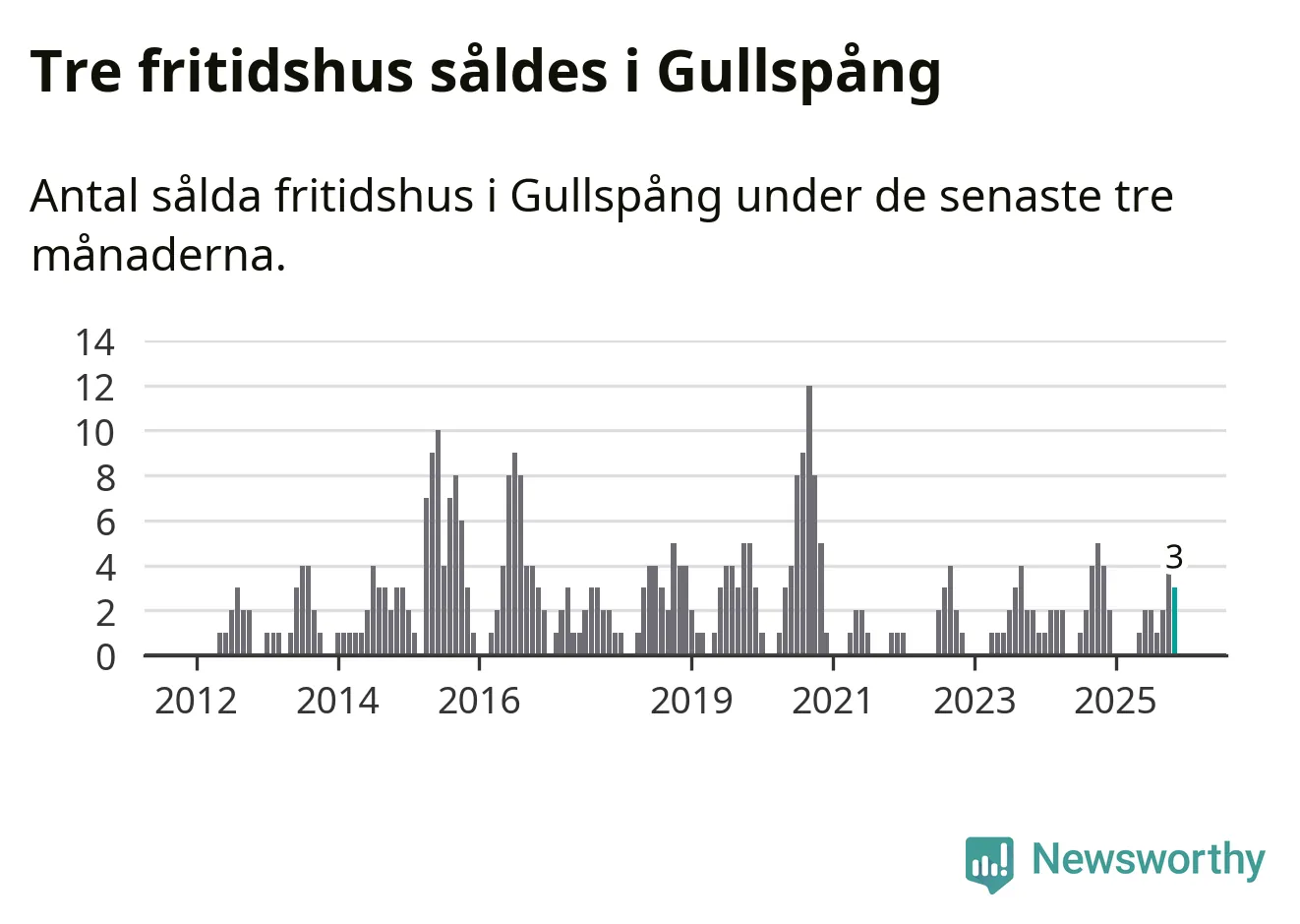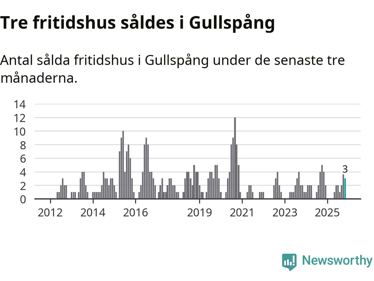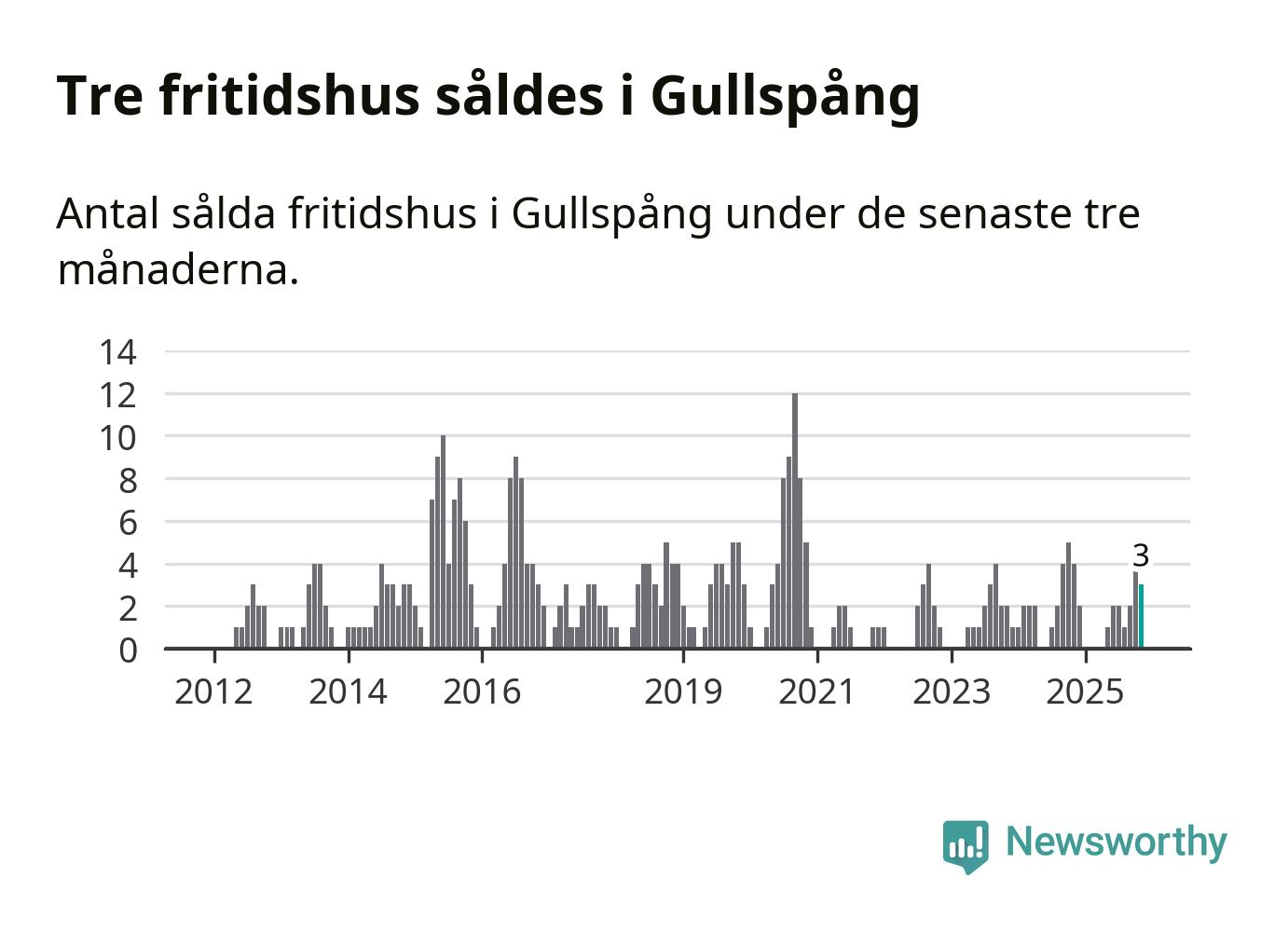 Mellan september och november gjordes sammanlagt tre affärer med fritidshus i Gullspångs kommun. Det kan jämföras med fyra vid motsvarande tid i fjol.