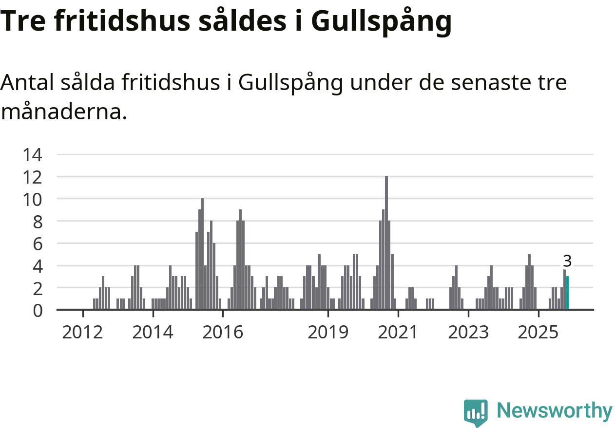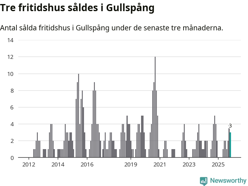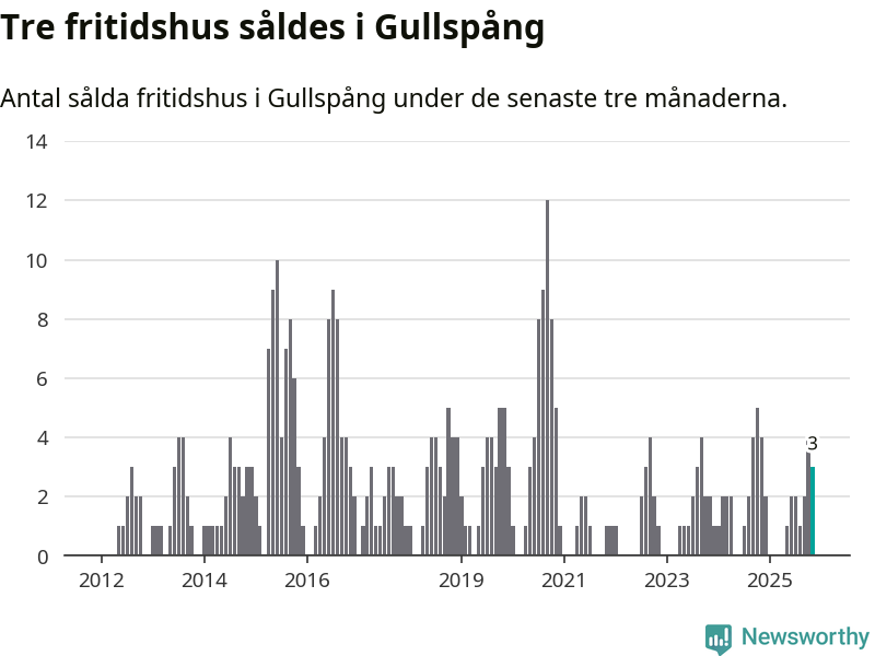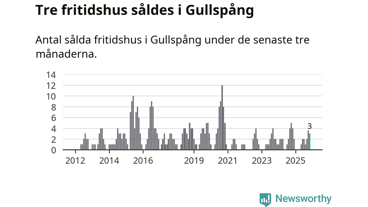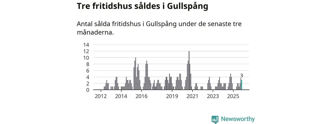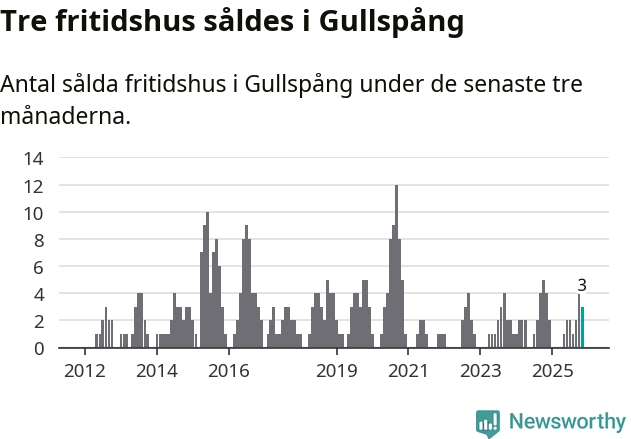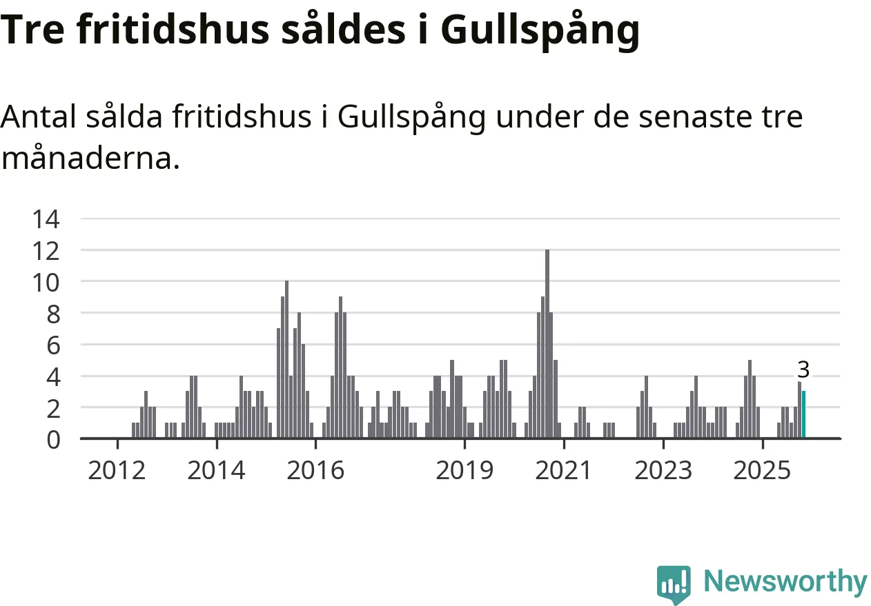Mellan september och november gjordes sammanlagt tre affärer med fritidshus i Gullspångs kommun. Det kan jämföras med fyra vid motsvarande tid i fjol.