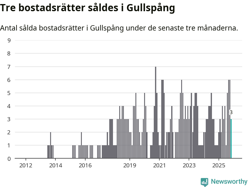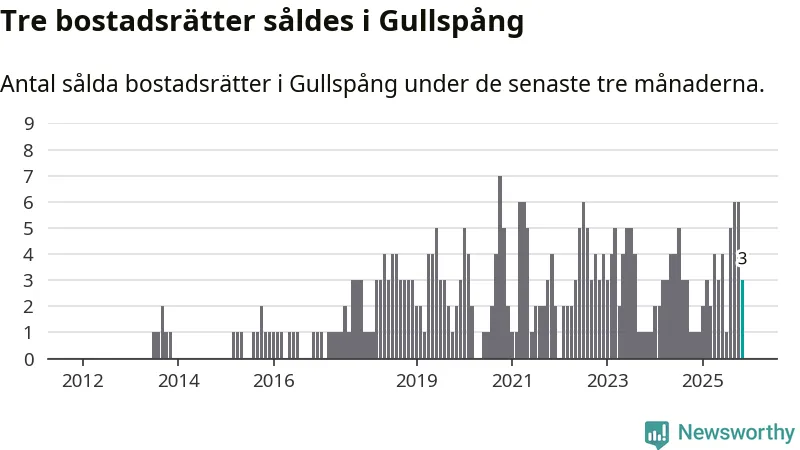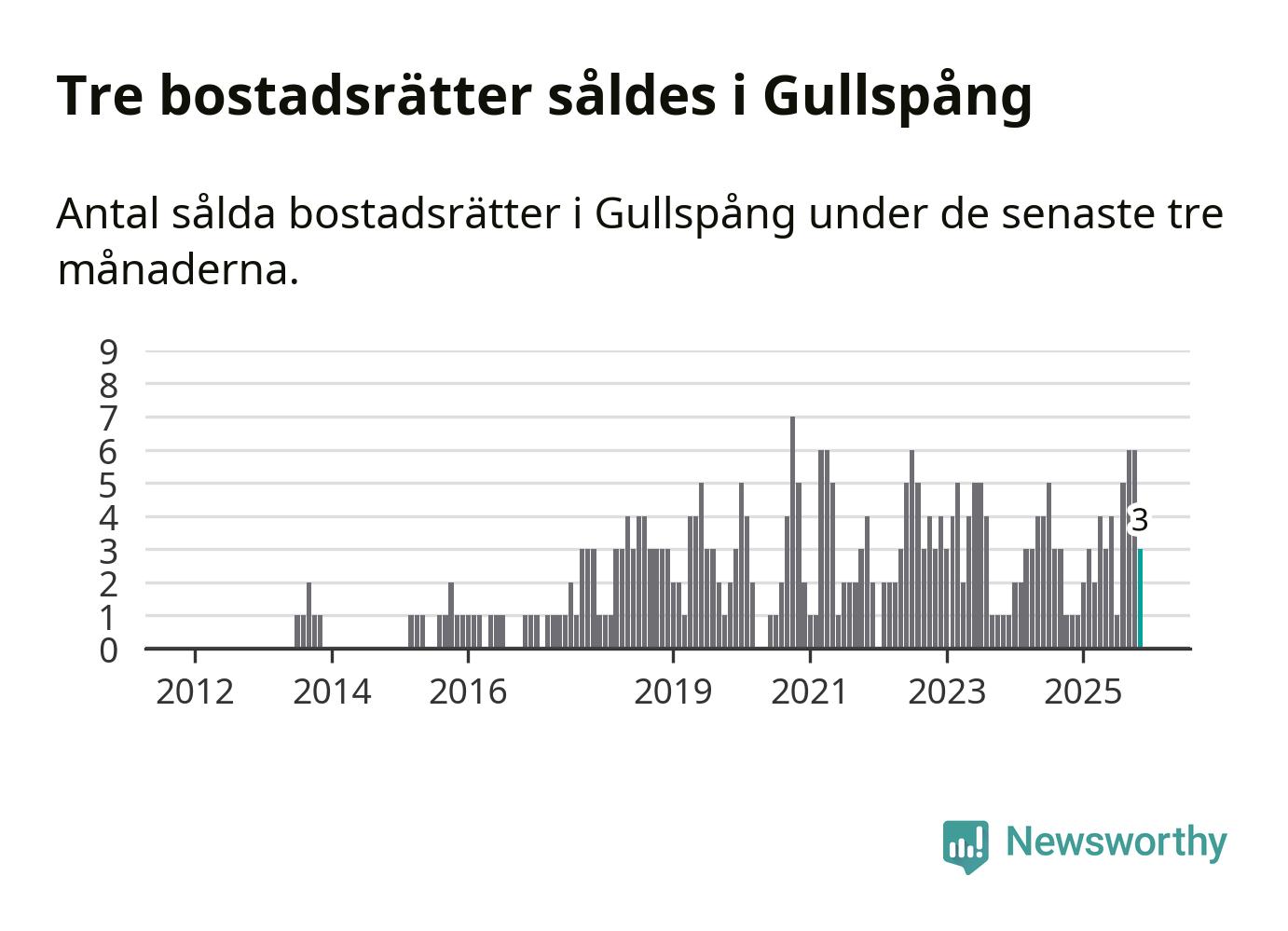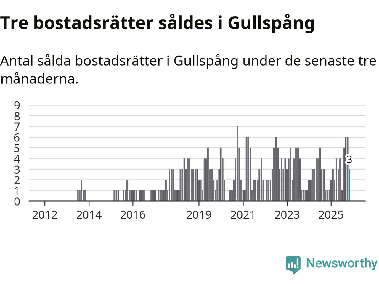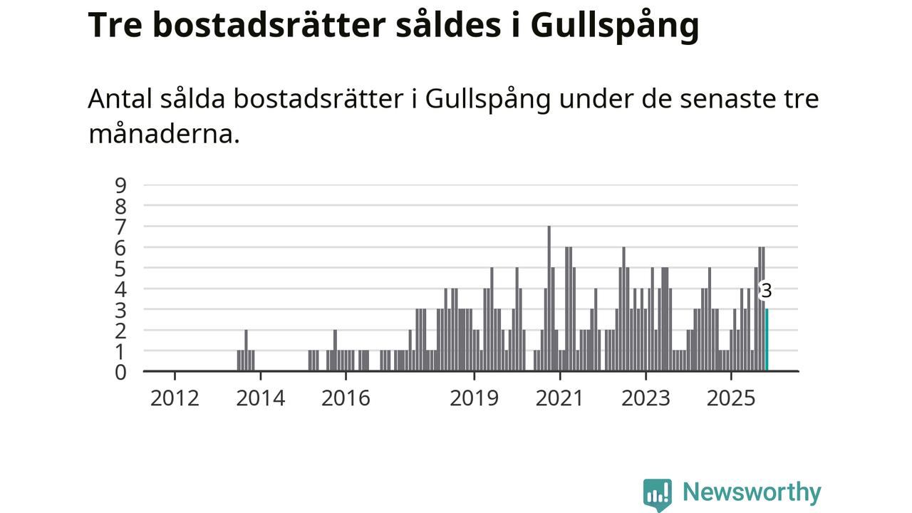 Mellan september och november gjordes sammanlagt tre affärer med bostadsrätter i Gullspångs kommun. Det kan jämföras med ett vid motsvarande tid i fjol.