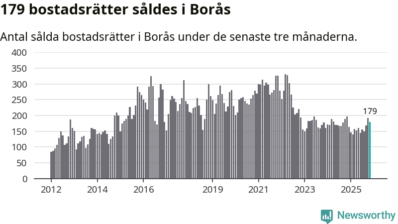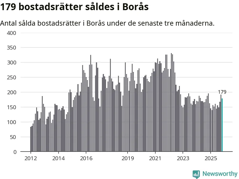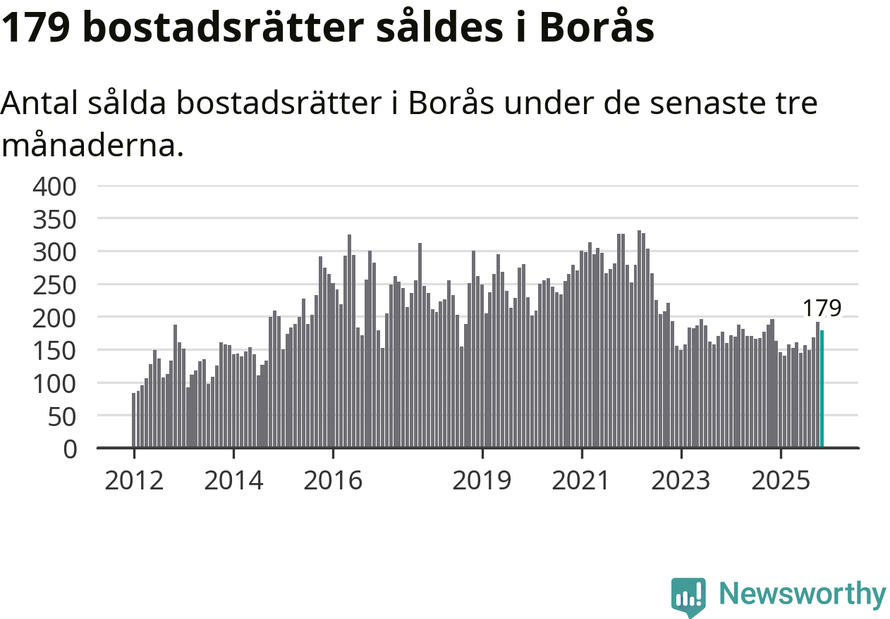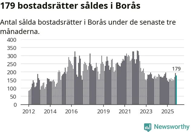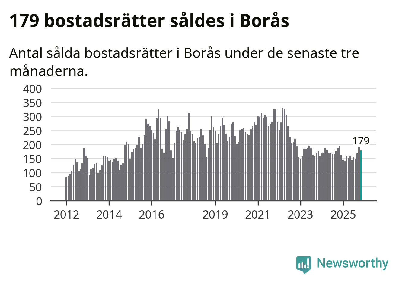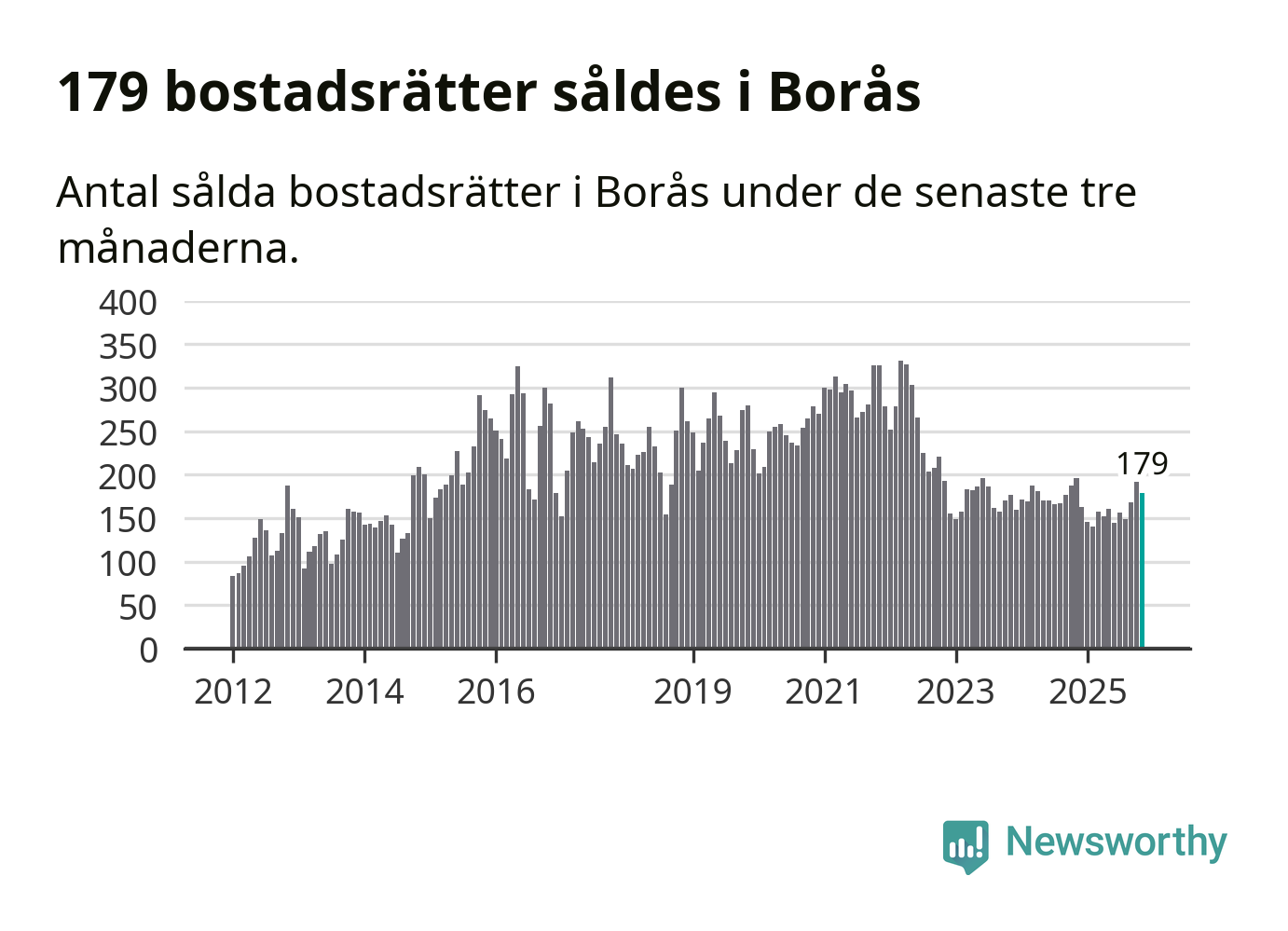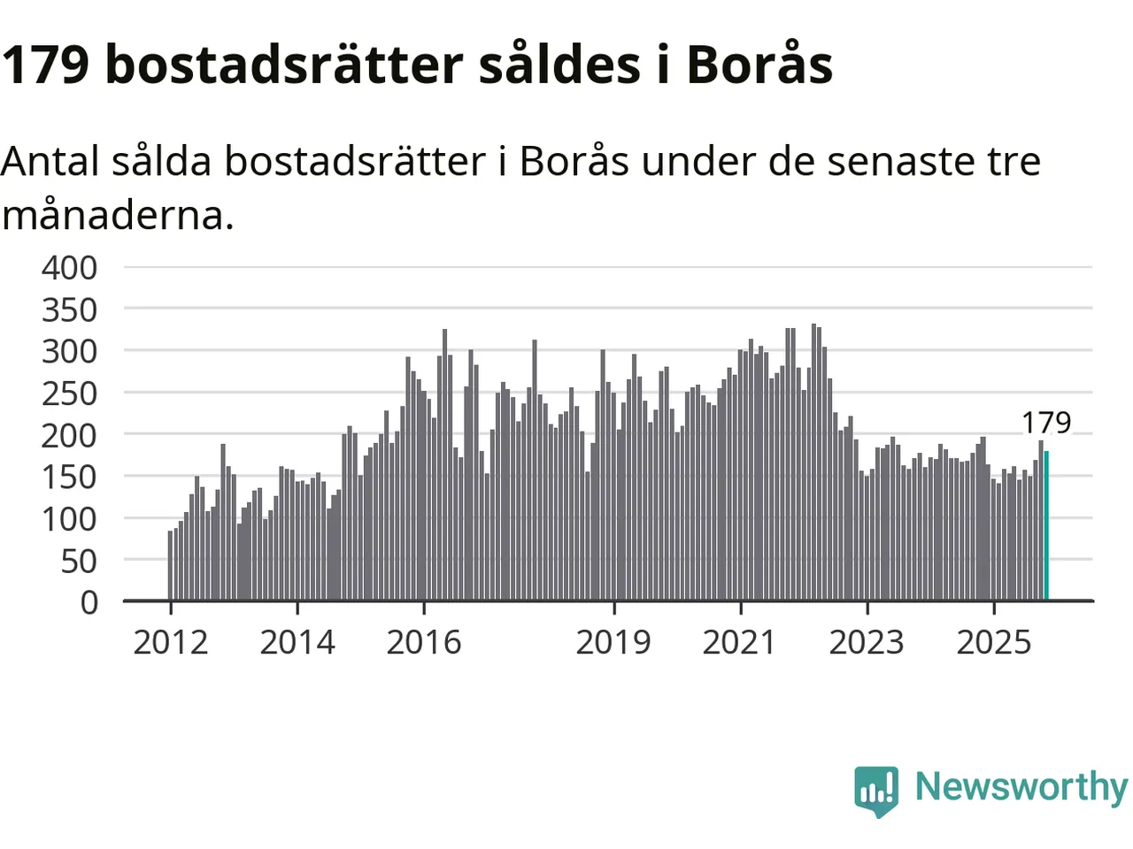 Sammanlagt såldes 179 bostadsrätter i Borås kommun mellan september och november till ett genomsnittligt pris på 1,4 miljoner kronor. I fjol gjordes 196 affärer vid den här tiden på året.