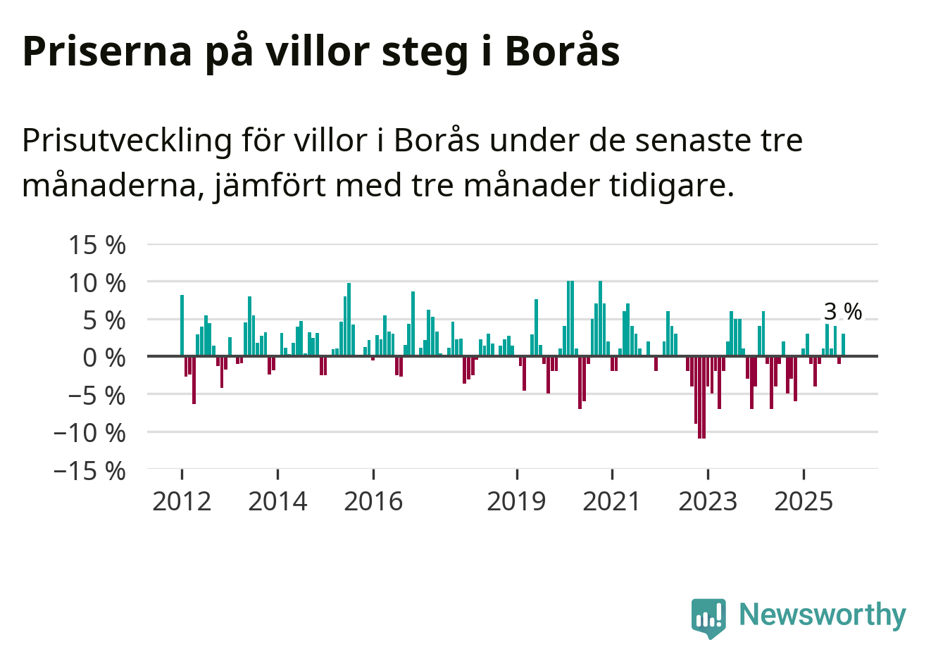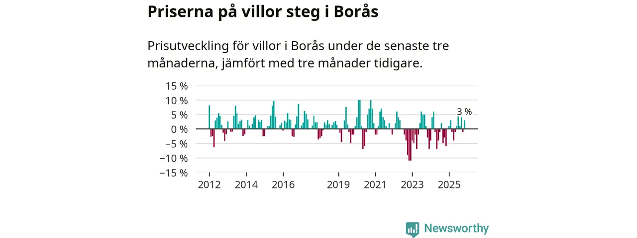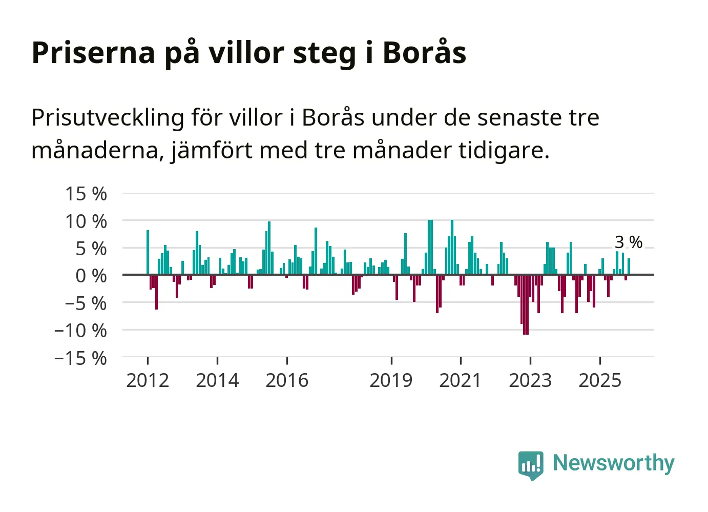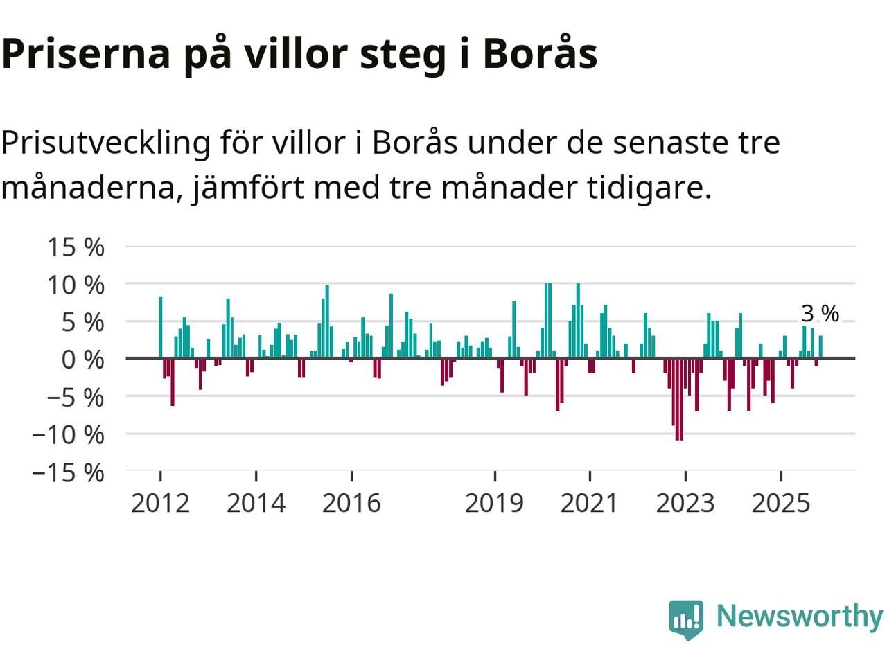 Villapriserna har gått upp i Borås kommun. Medelpriset på försäljningarna under de senaste tre månaderna visar på en uppgång med 3 procent.