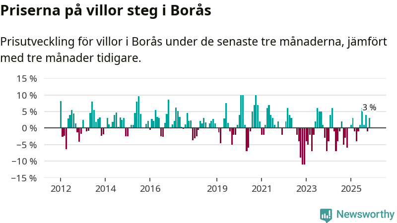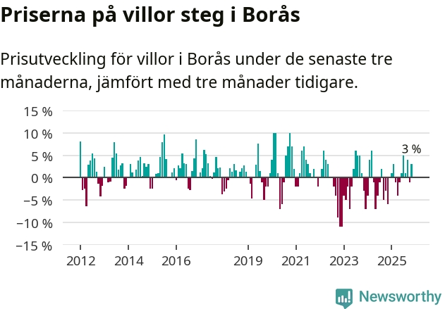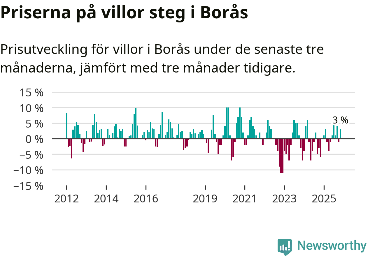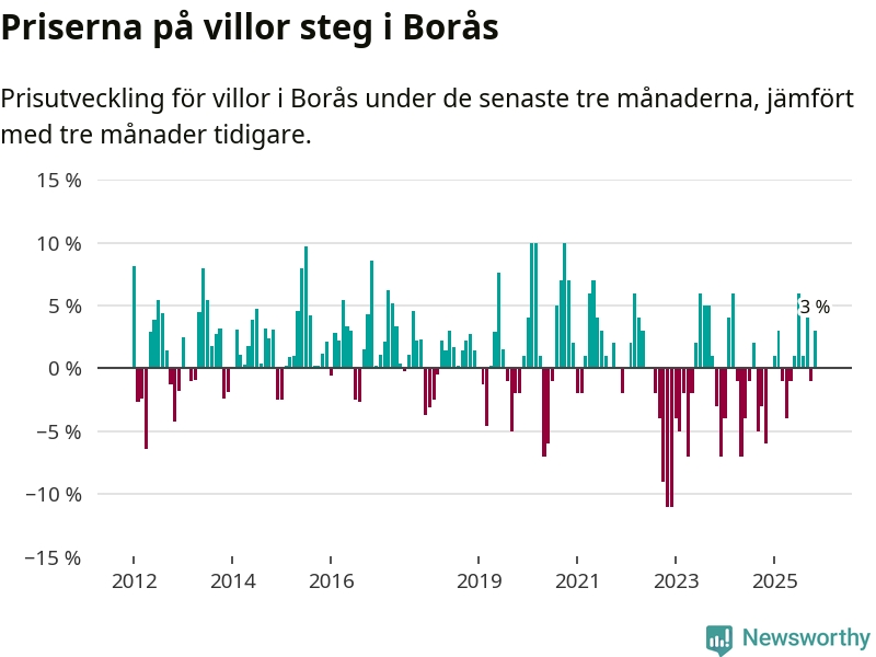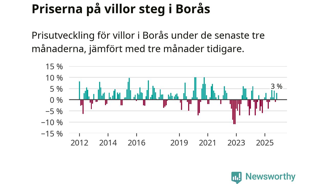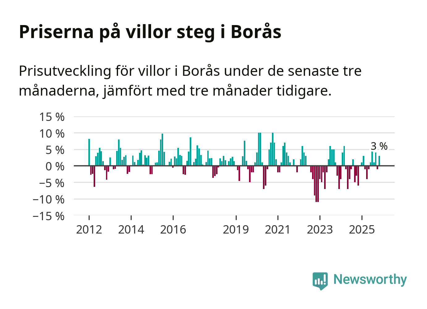 Villapriserna har gått upp i Borås kommun. Medelpriset på försäljningarna under de senaste tre månaderna visar på en uppgång med 3 procent.