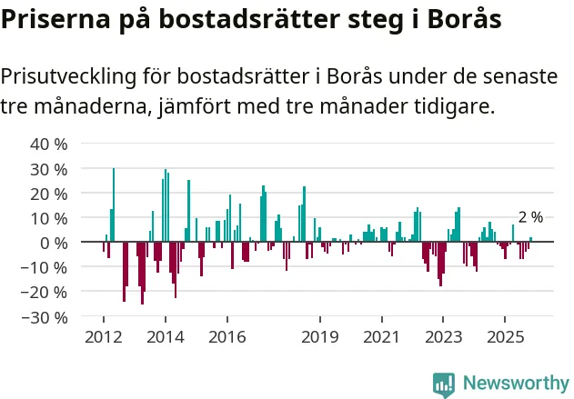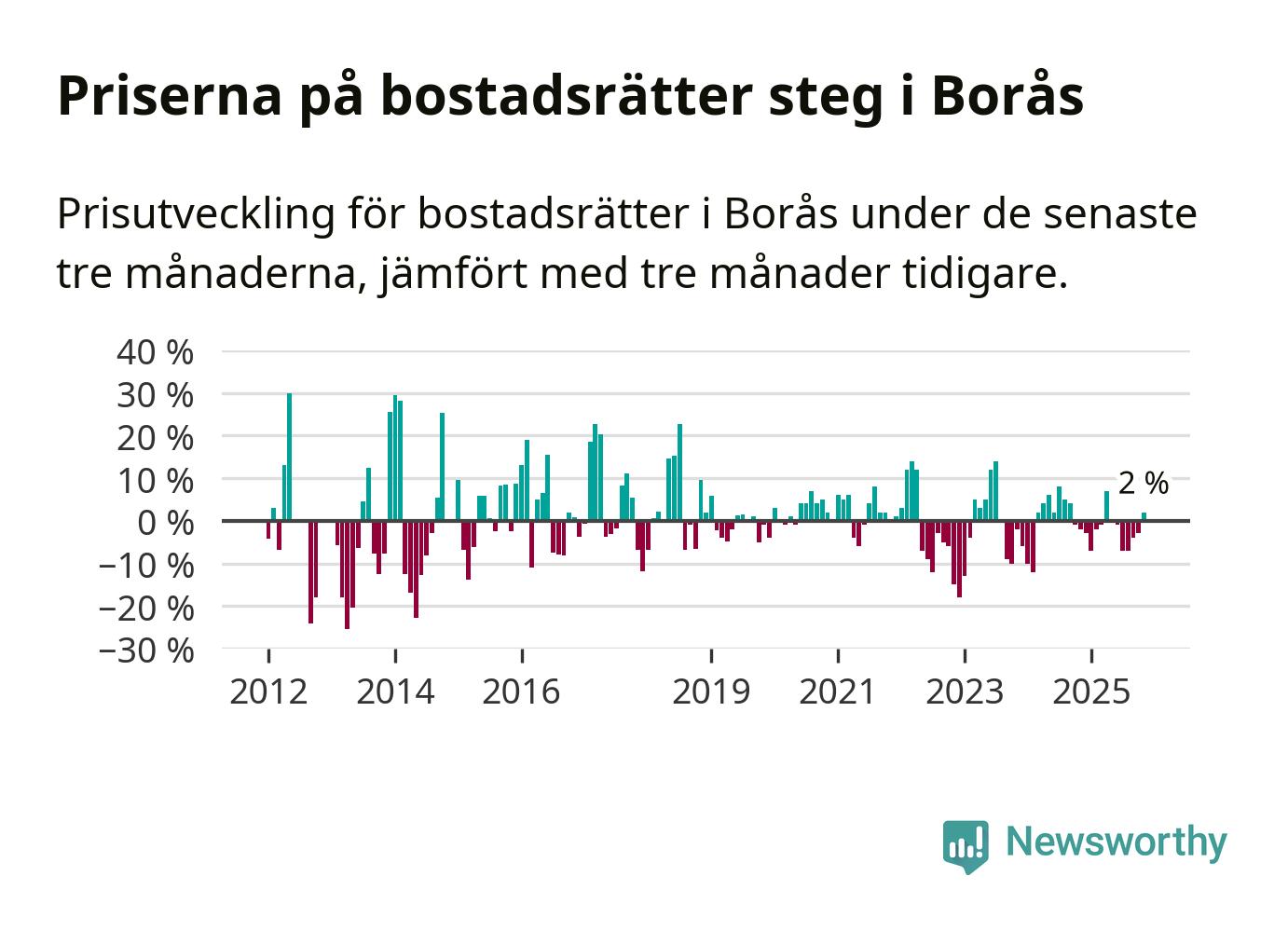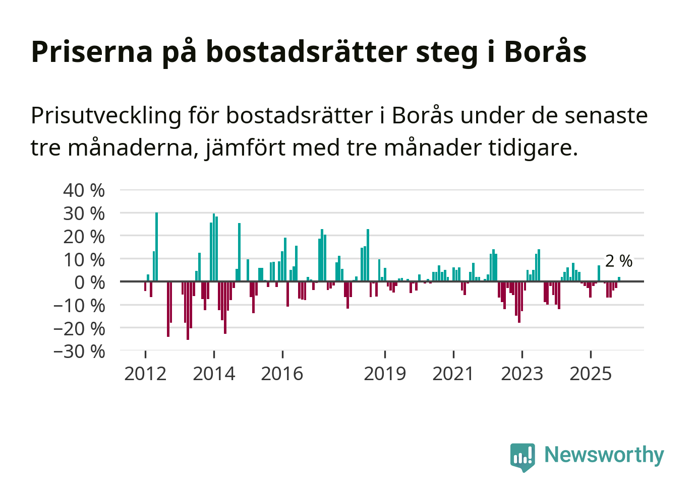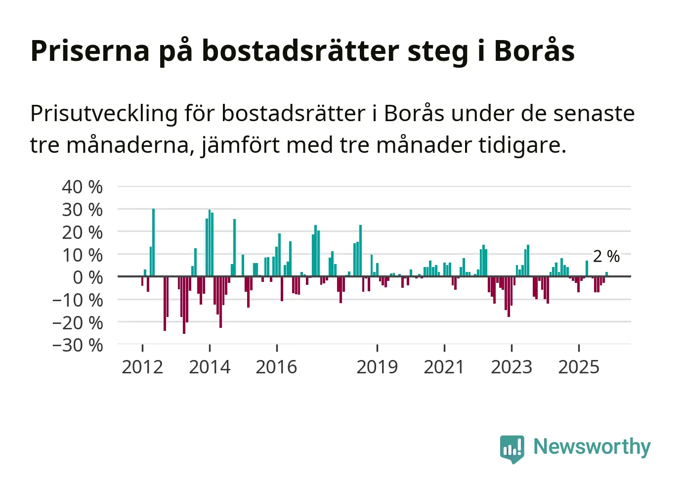 Priserna på bostadsrätter har gått upp i Borås kommun. Medelpriset på försäljningarna under de senaste tre månaderna visar på en uppgång med 2 procent.