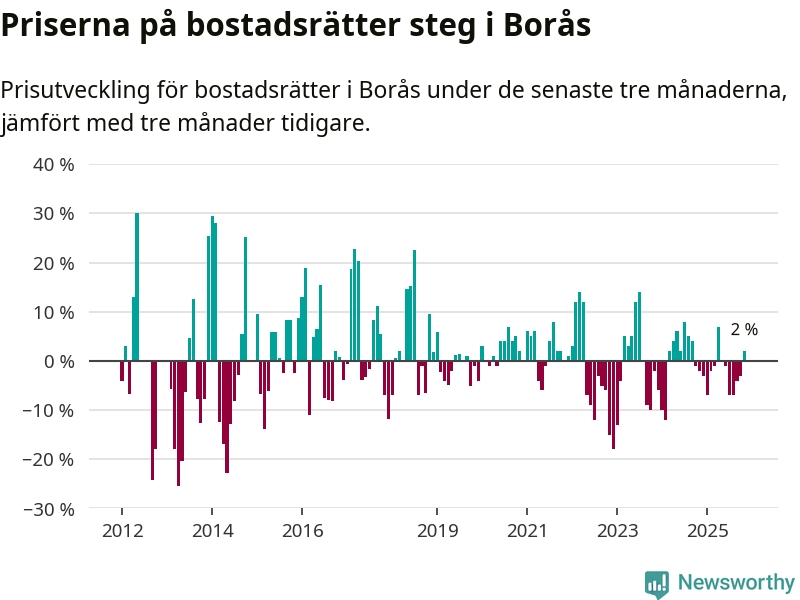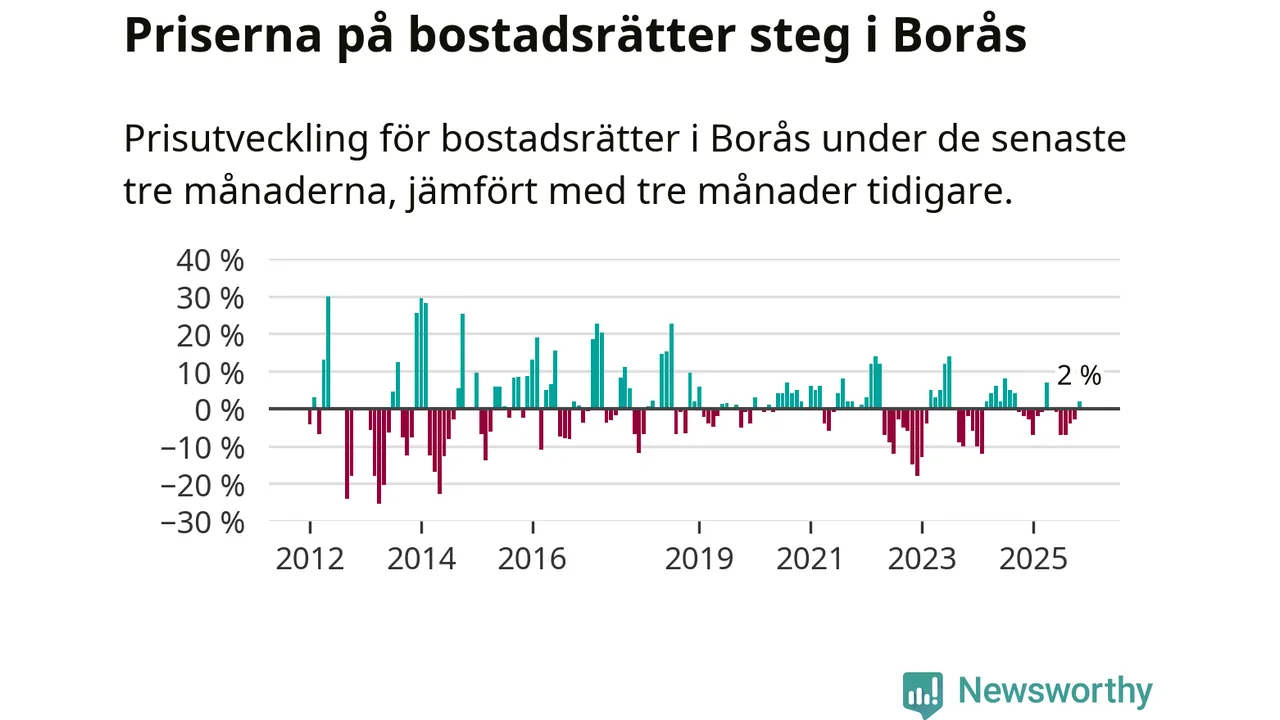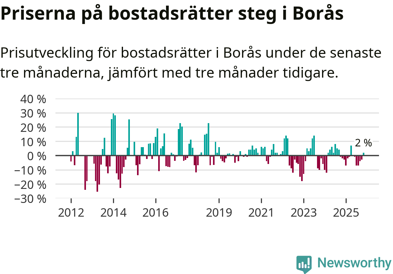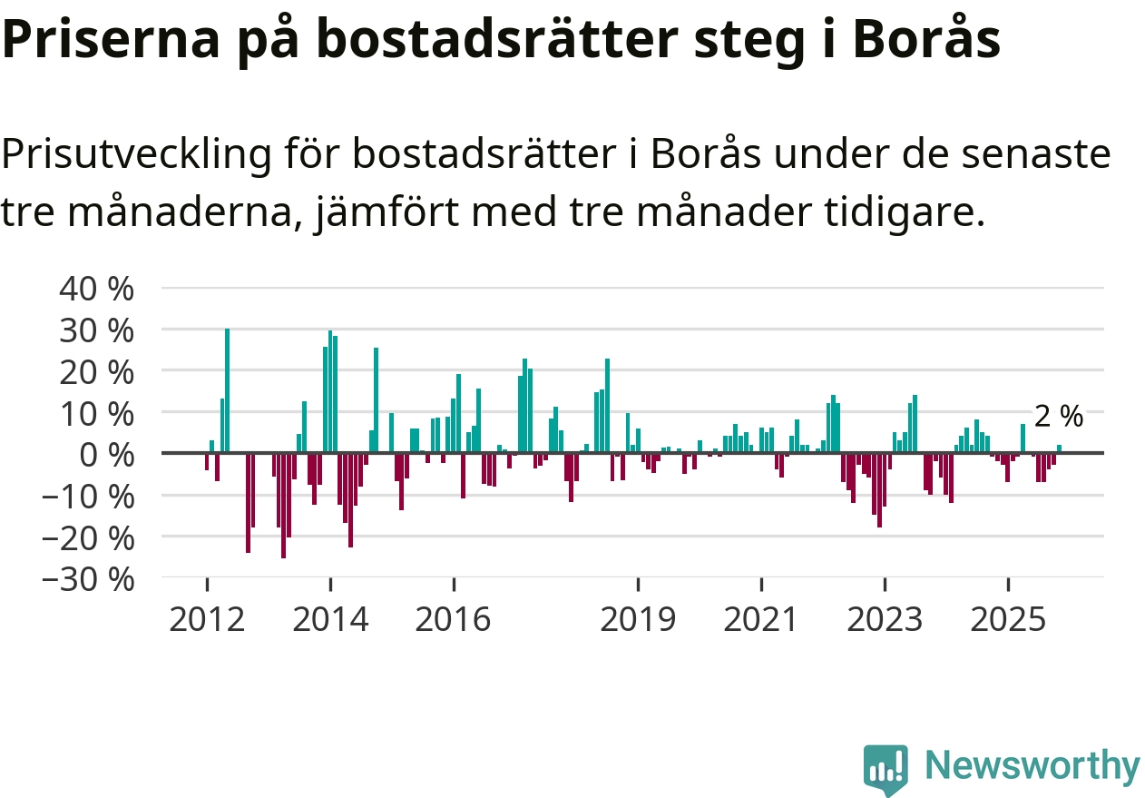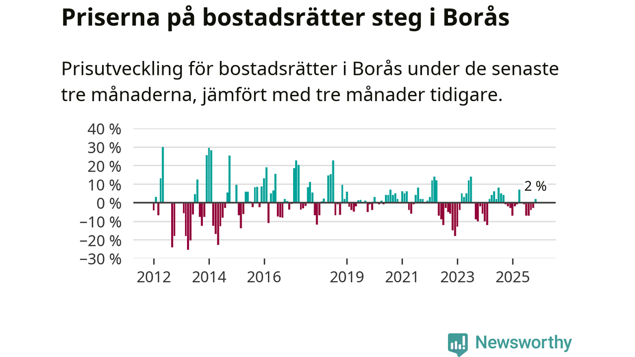 Priserna på bostadsrätter har gått upp i Borås kommun. Medelpriset på försäljningarna under de senaste tre månaderna visar på en uppgång med 2 procent.