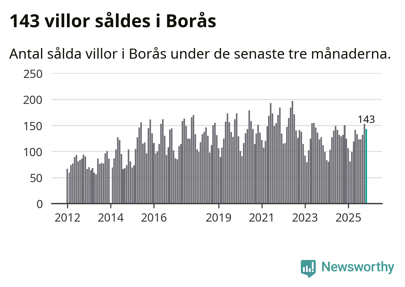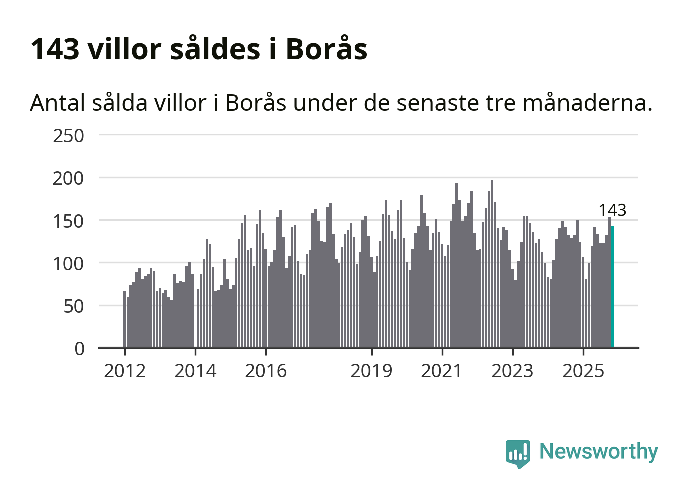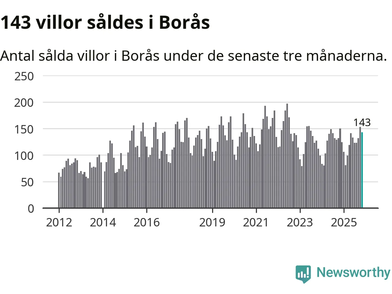 Sammanlagt såldes 143 villor i Borås kommun mellan september och november till ett genomsnittligt pris på 3,1 miljoner kronor. I fjol gjordes 150 affärer vid den här tiden på året.