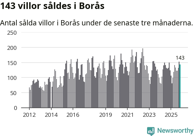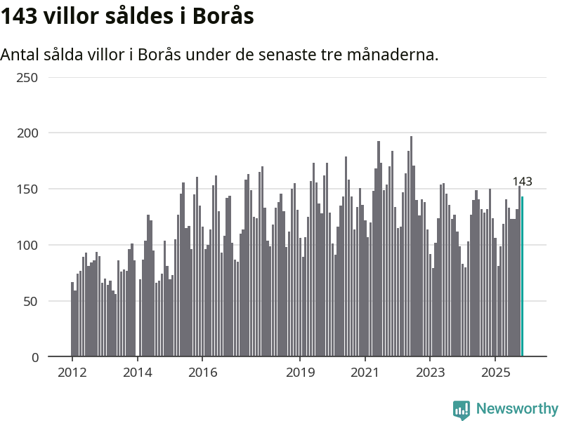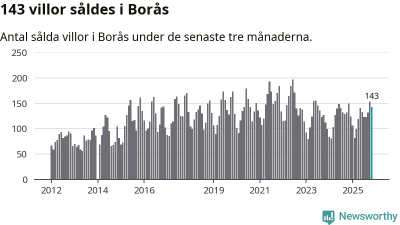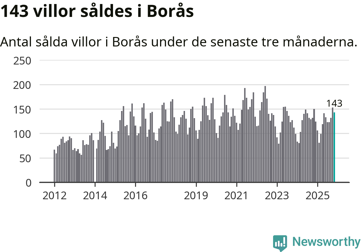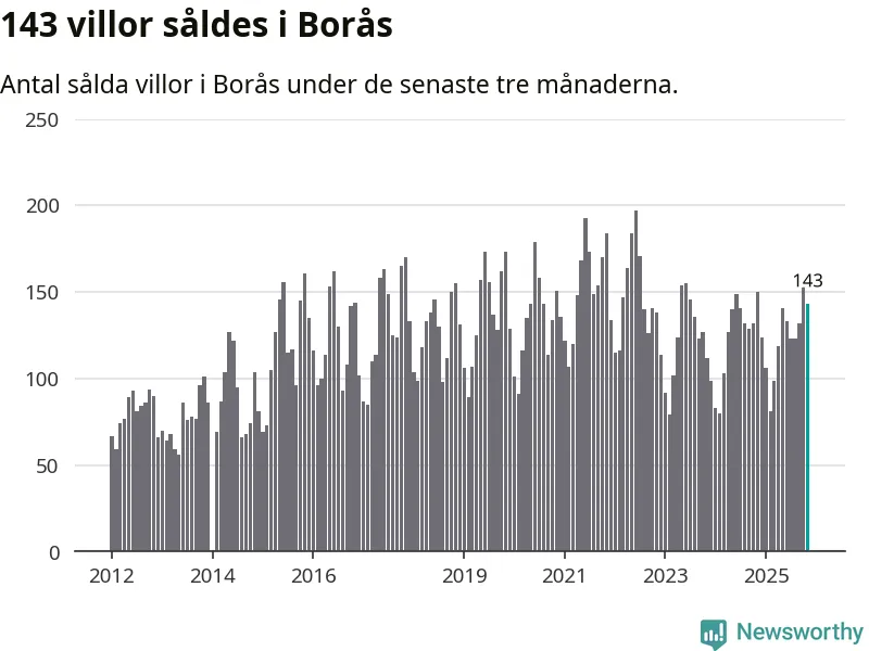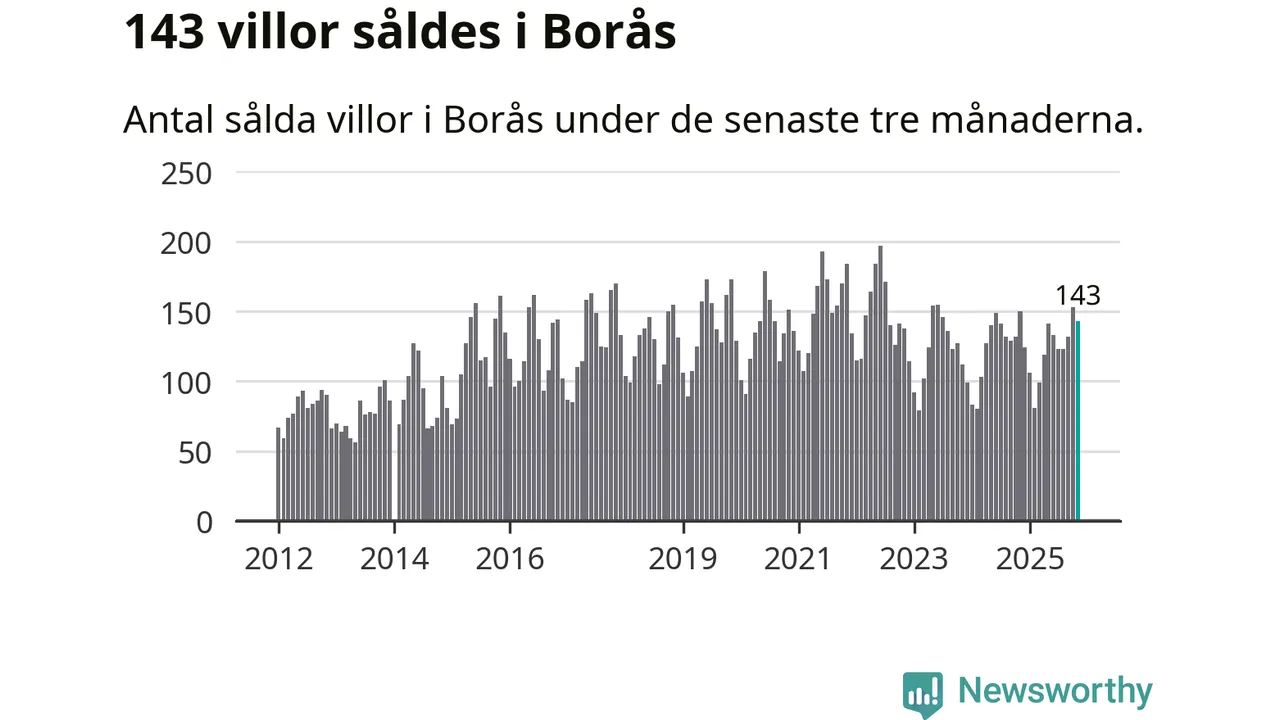 Sammanlagt såldes 143 villor i Borås kommun mellan september och november till ett genomsnittligt pris på 3,1 miljoner kronor. I fjol gjordes 150 affärer vid den här tiden på året.