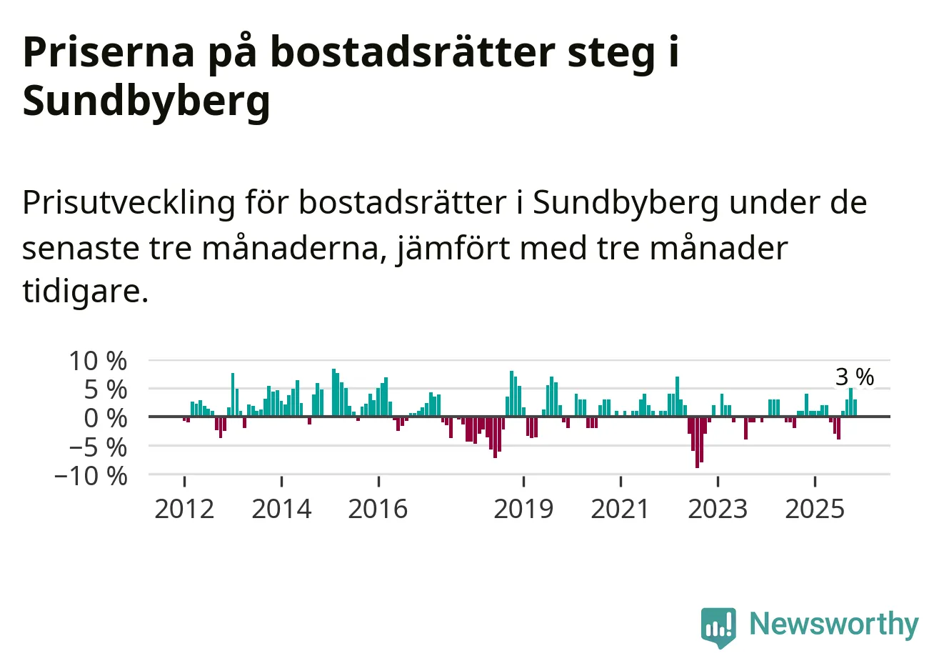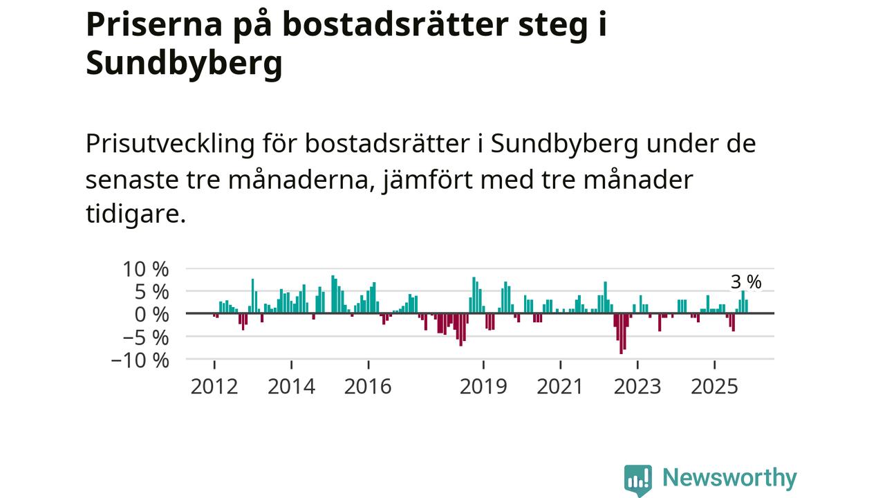 Statistiken visar även på en prisuppgång i Sundbybergs kommun. Medelpriset på försäljningarna av bostadsrätter i kommunen var 3 procent högre än för tre månader sedan. Även i hela Stockholms län ökar priserna på bostadsrätter. I hela länet noterades en prisuppgång på 6 procent.