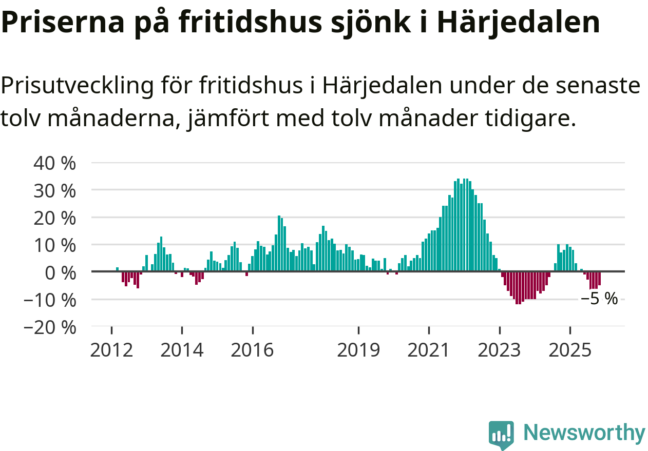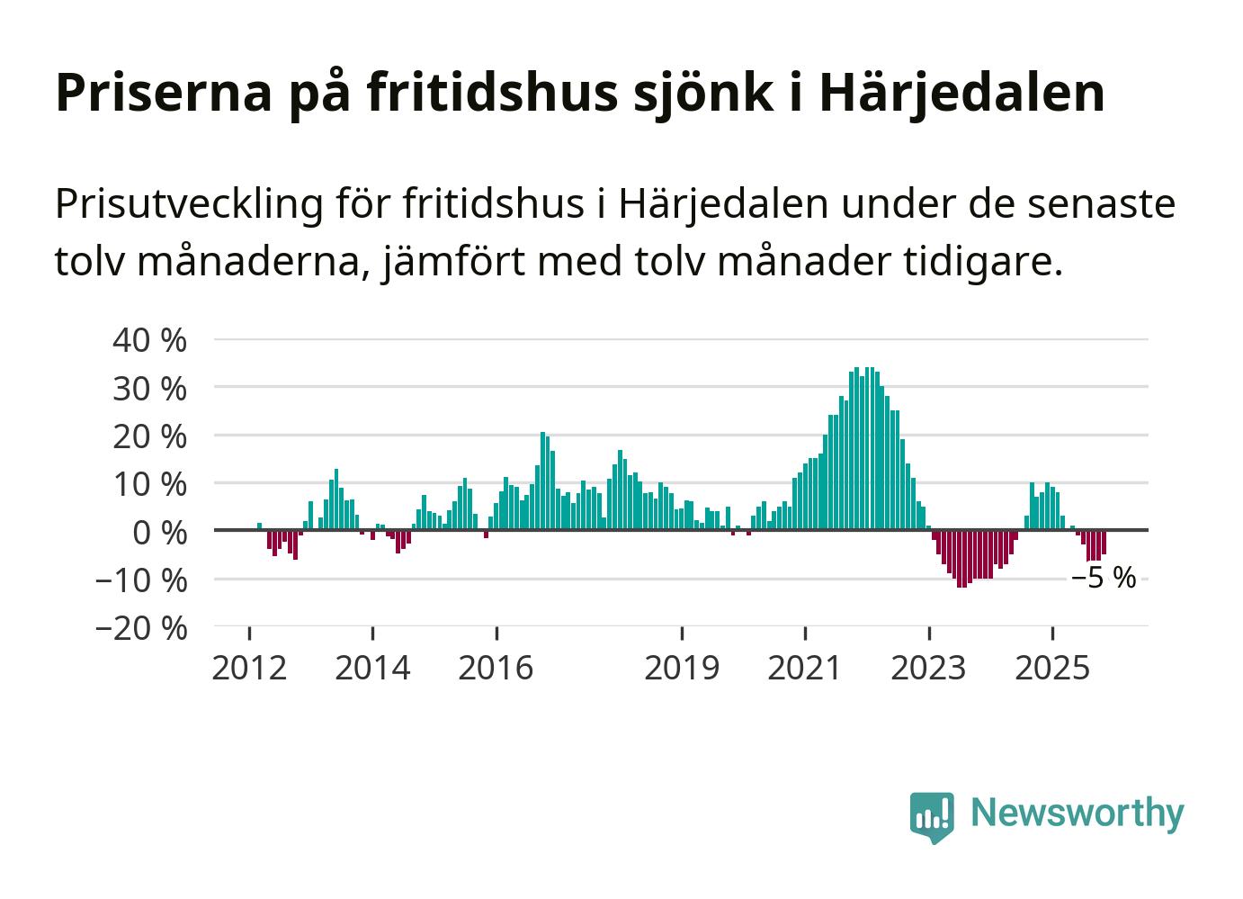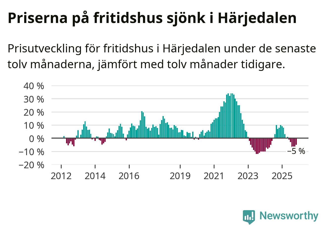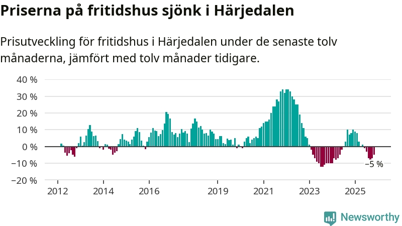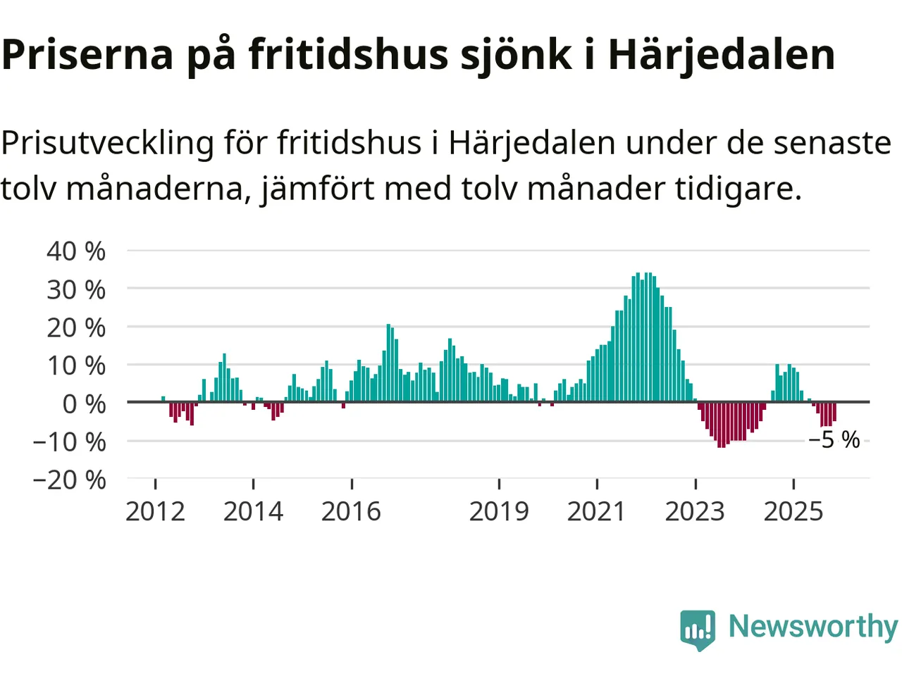 Statistiken visar även på en kännbar prisnedgång i Härjedalens kommun. Medelpriset på försäljningarna av fritidshus i kommunen var 5 procent lägre än för ett år sedan. Även i hela Jämtland sjunker priserna på fritidshus. I hela länet noterades en prisnedgång på 4 procent.