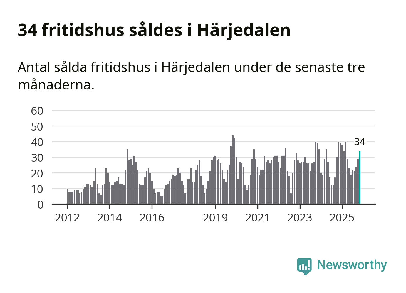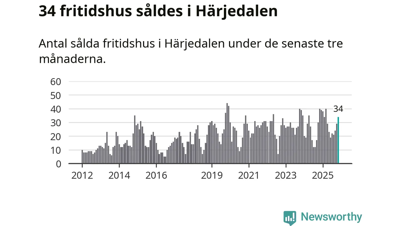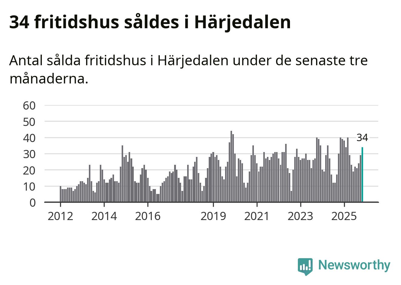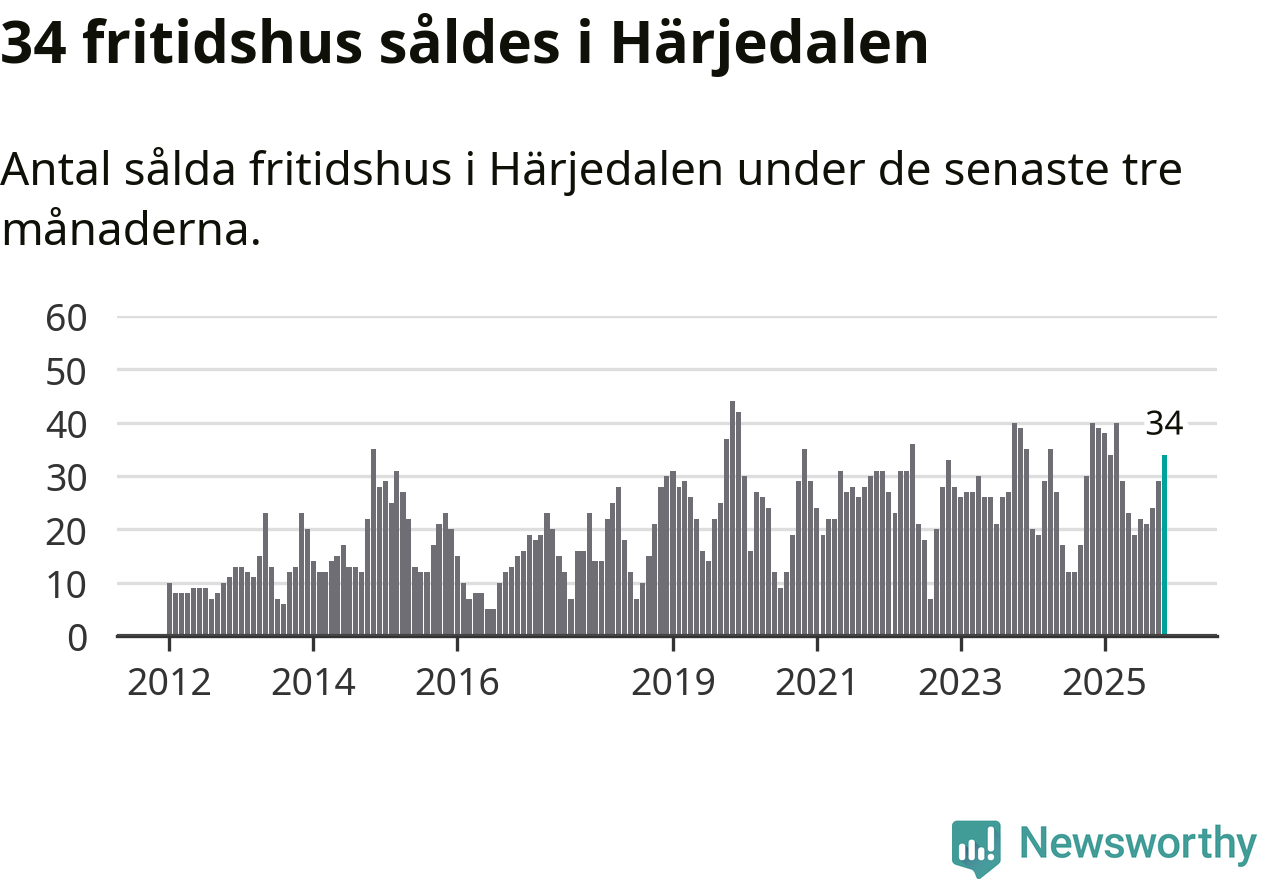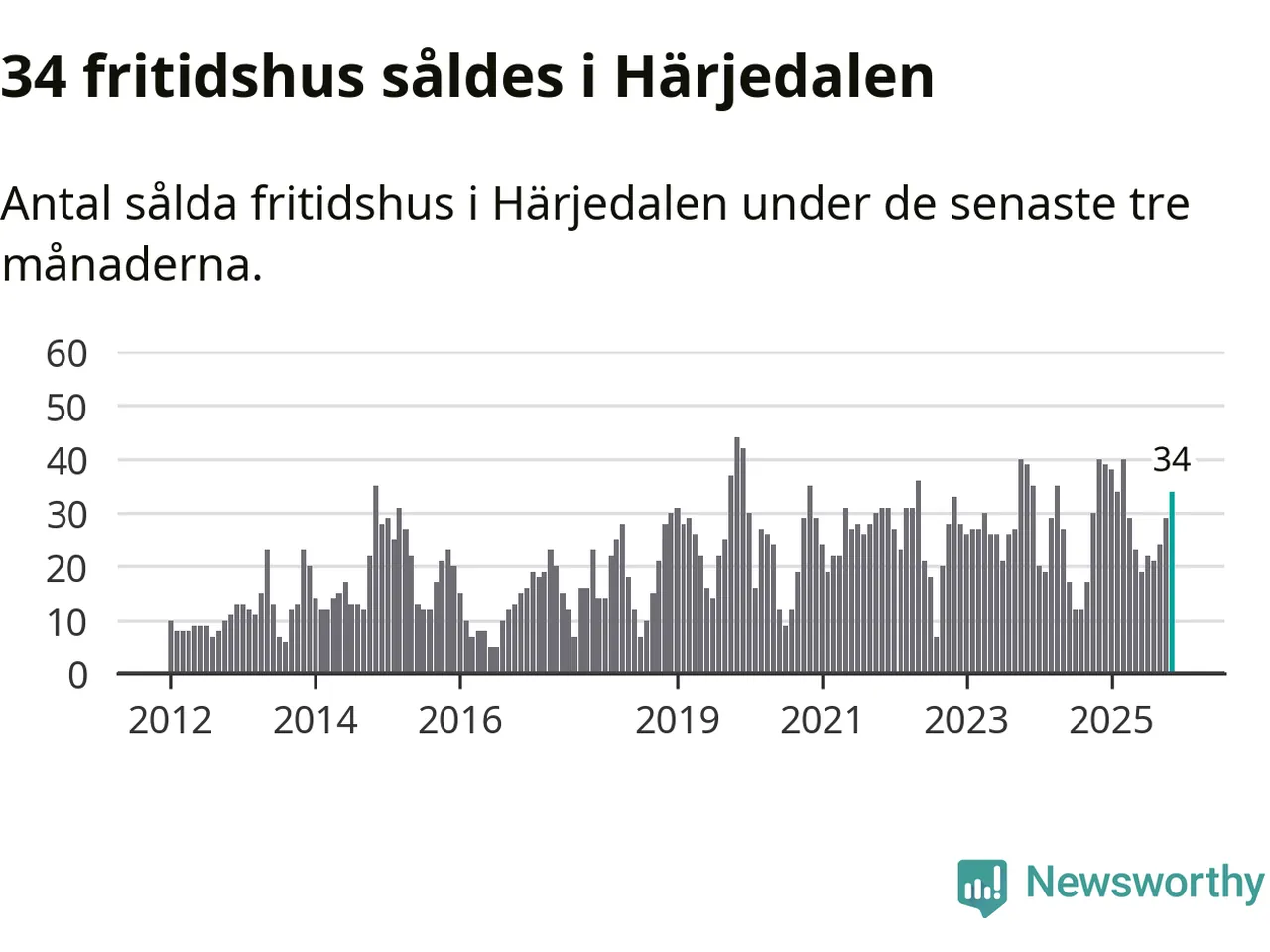 Mellan september och november såldes 34 fritidshus i Härjedalens kommun. Det är relativt få sett till aktiviteten på bostadsmarknaden i kommunen under de senaste tolv månaderna, samt det historiska snittet för den här tiden på året.