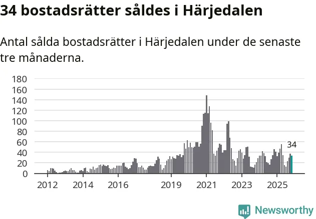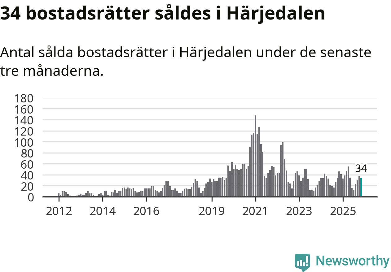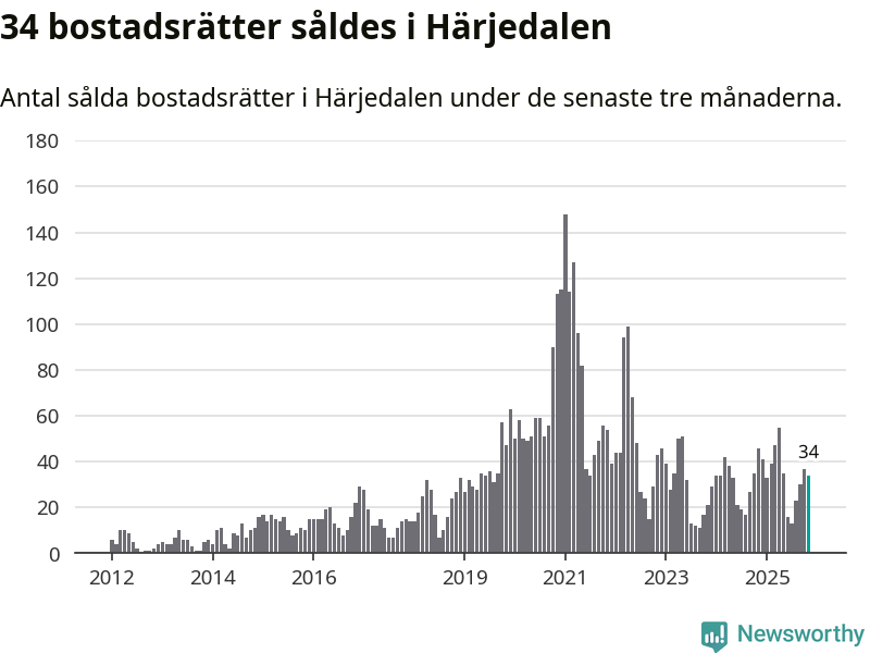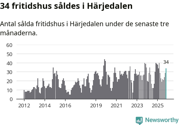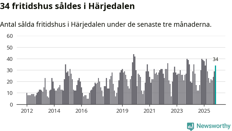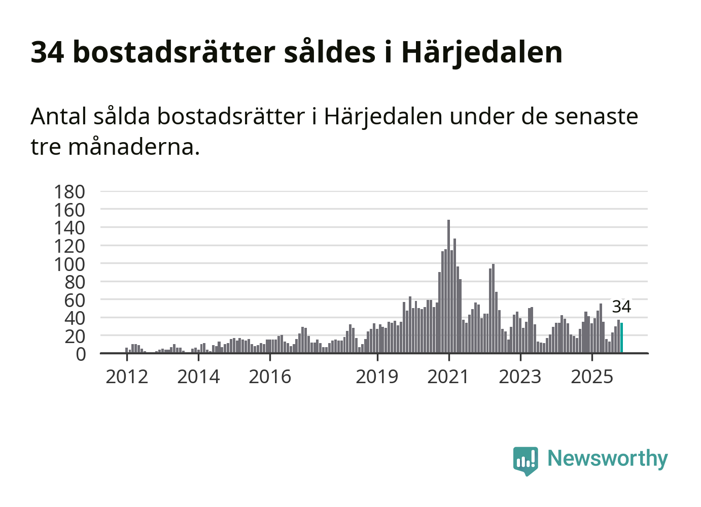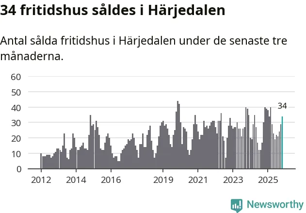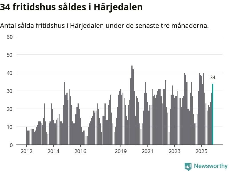 Mellan september och november såldes 34 fritidshus i Härjedalens kommun. Det är relativt få sett till aktiviteten på bostadsmarknaden i kommunen under de senaste tolv månaderna, samt det historiska snittet för den här tiden på året.