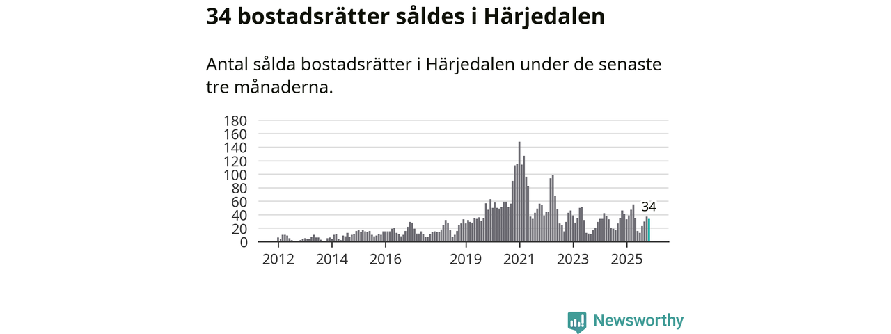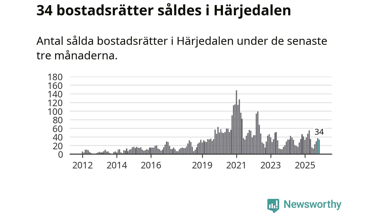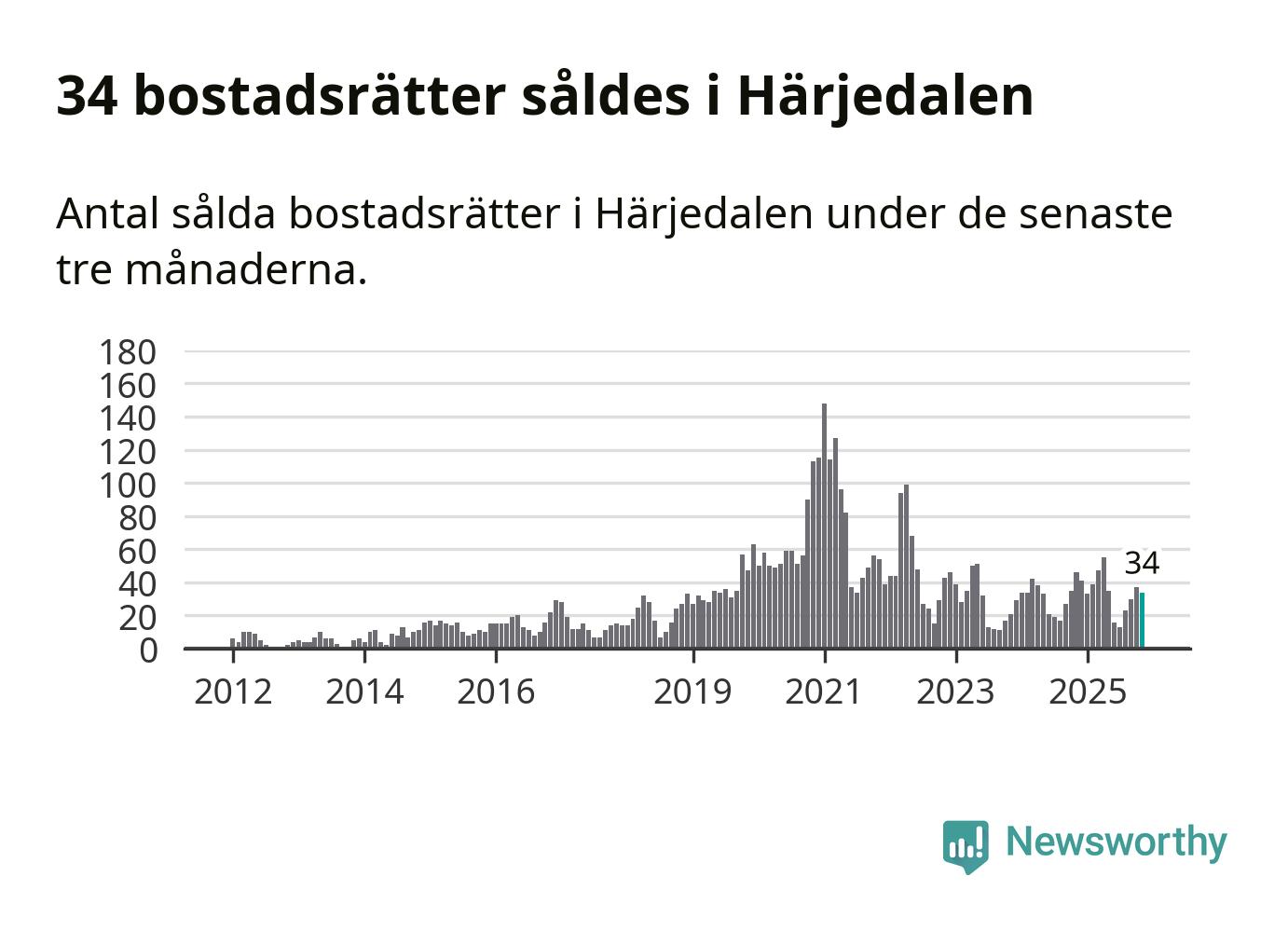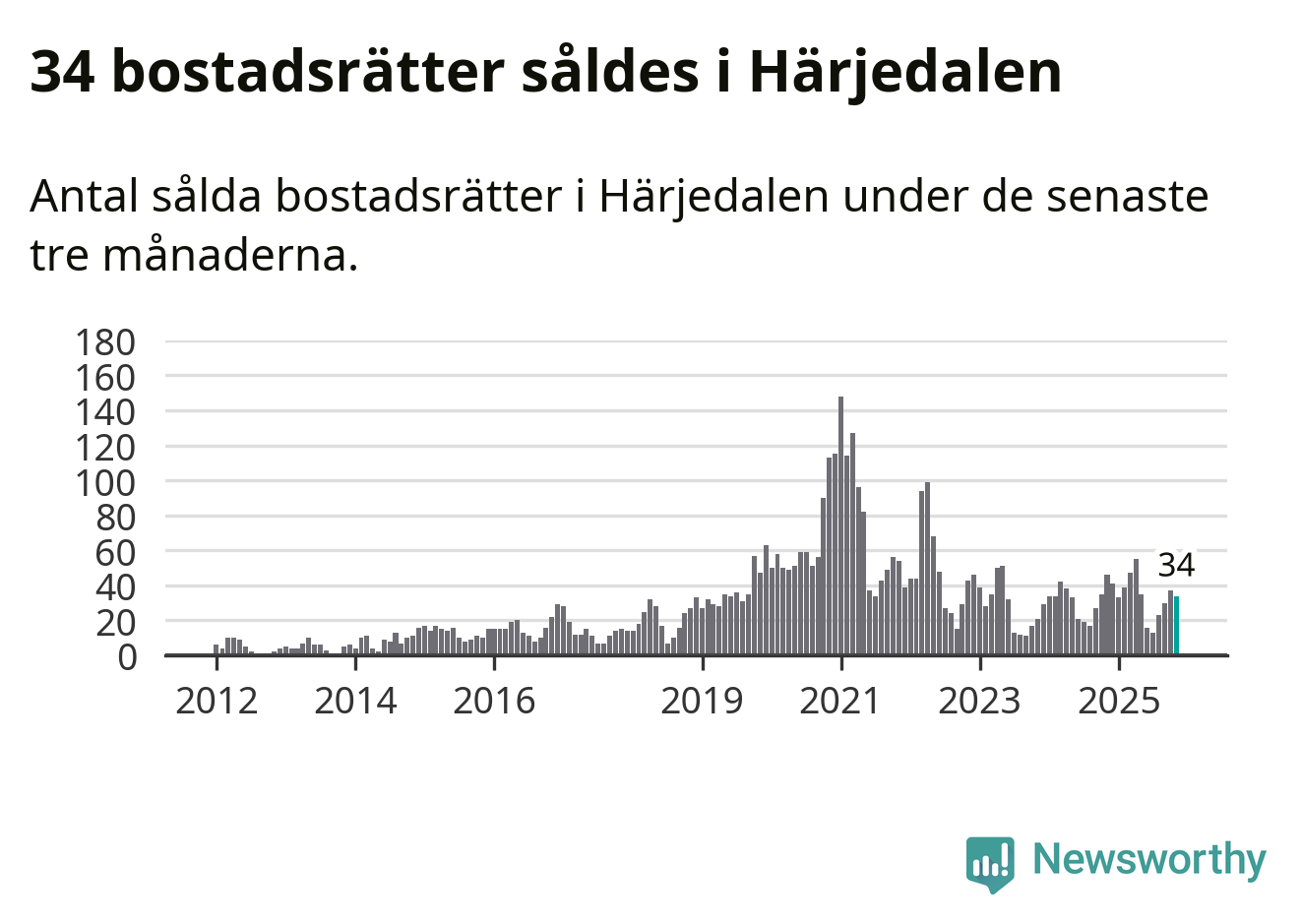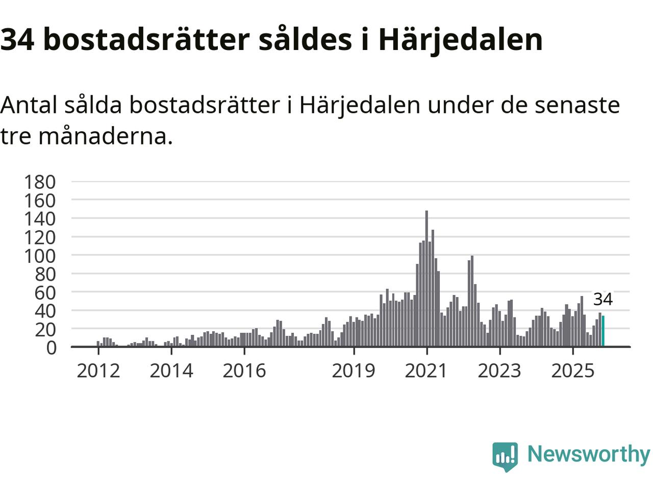 Sammanlagt såldes 34 bostadsrätter i Härjedalens kommun mellan september och november till ett genomsnittligt pris på 2,9 miljoner kronor. I fjol gjordes 46 affärer vid den här tiden på året.