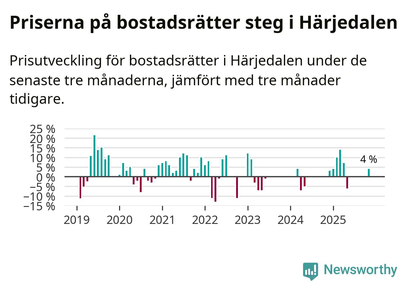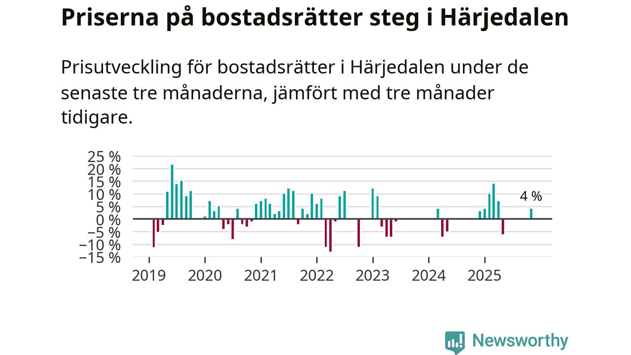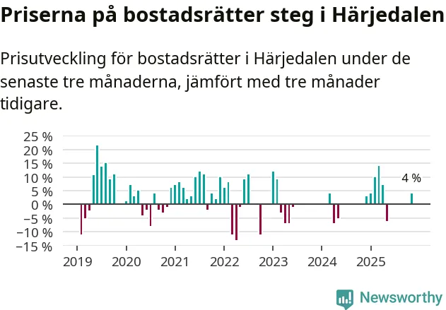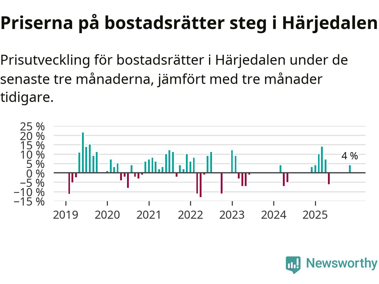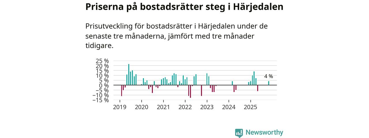 Priserna på bostadsrätter har gått upp i Härjedalens kommun. Medelpriset på försäljningarna under de senaste tre månaderna visar på en uppgång med 4 procent.