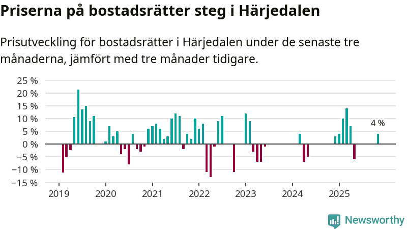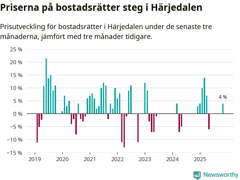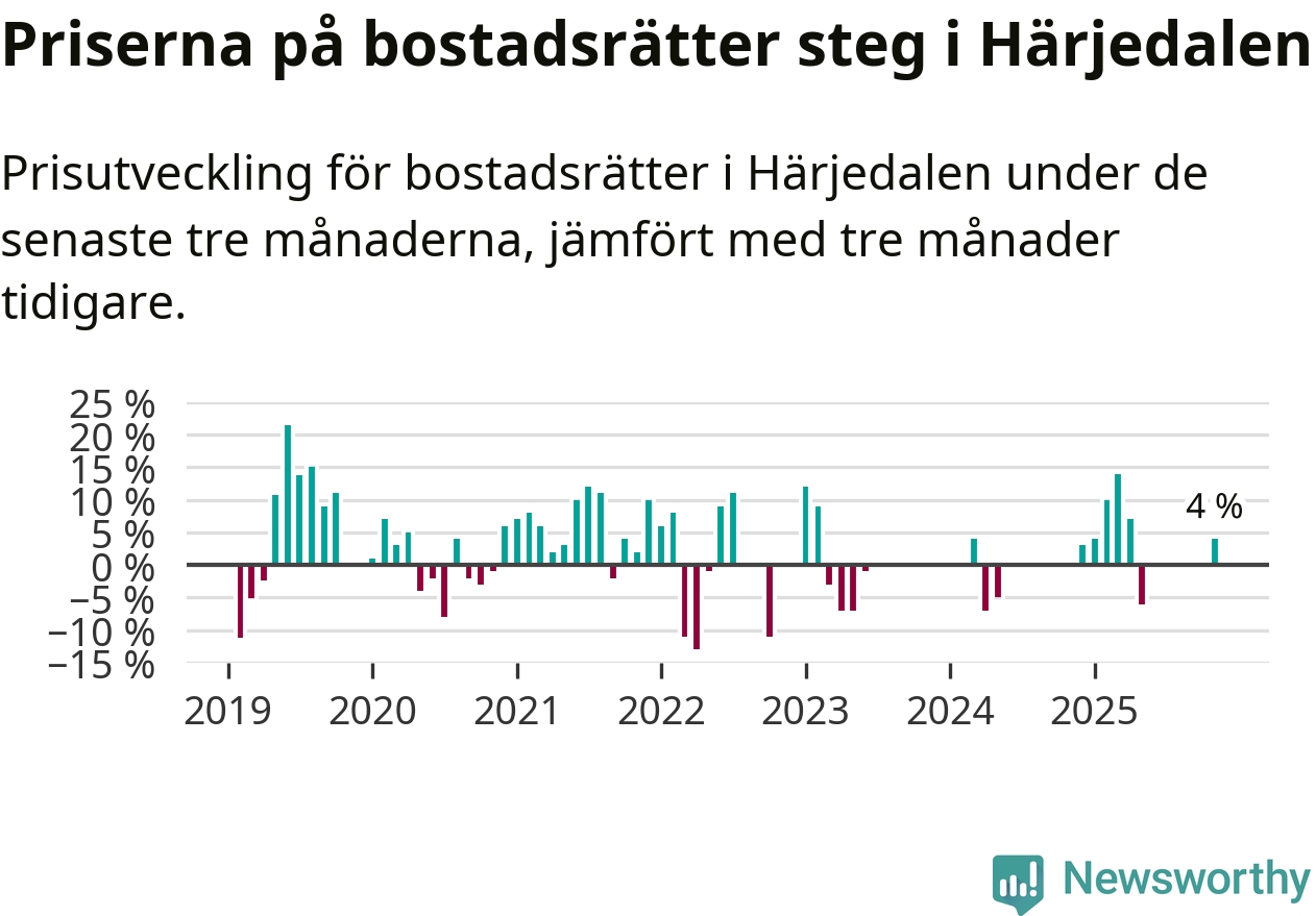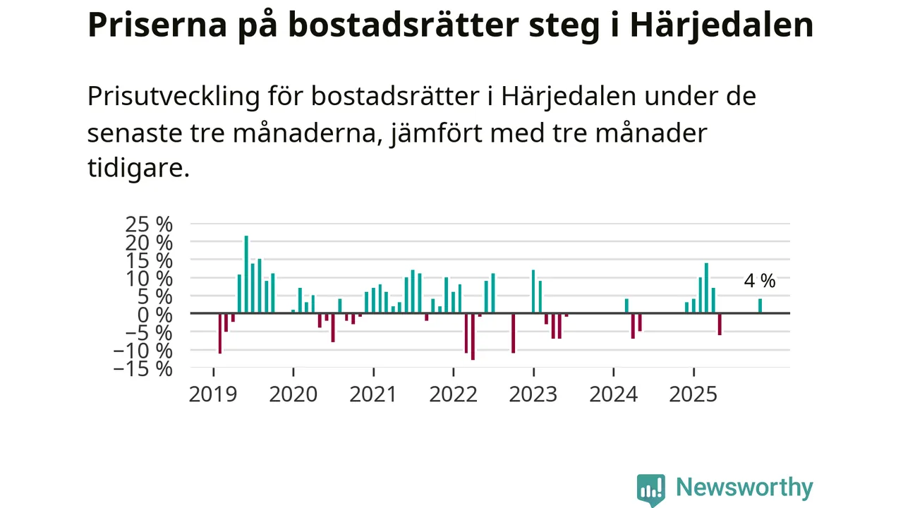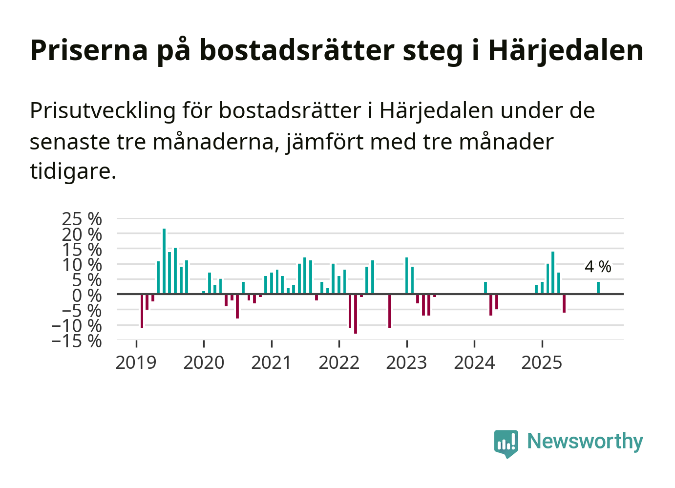 Priserna på bostadsrätter har gått upp i Härjedalens kommun. Medelpriset på försäljningarna under de senaste tre månaderna visar på en uppgång med 4 procent.