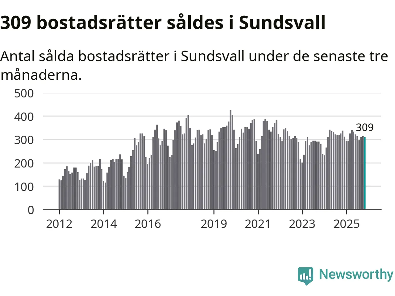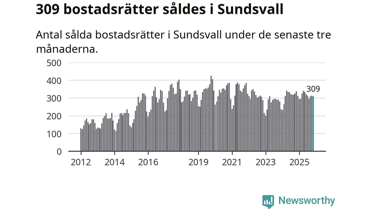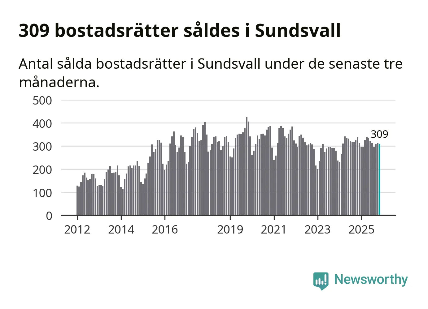 Mellan september och november såldes 309 bostadsrätter i Sundsvalls kommun. Det är relativt få sett till aktiviteten på bostadsmarknaden i kommunen under de senaste tolv månaderna, samt det historiska snittet för den här tiden på året.