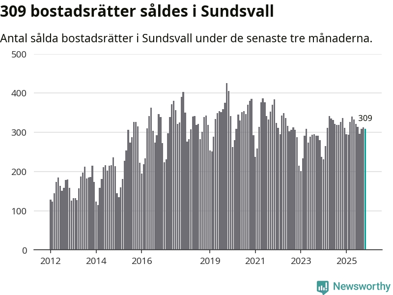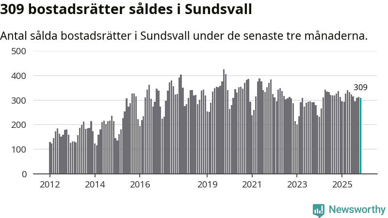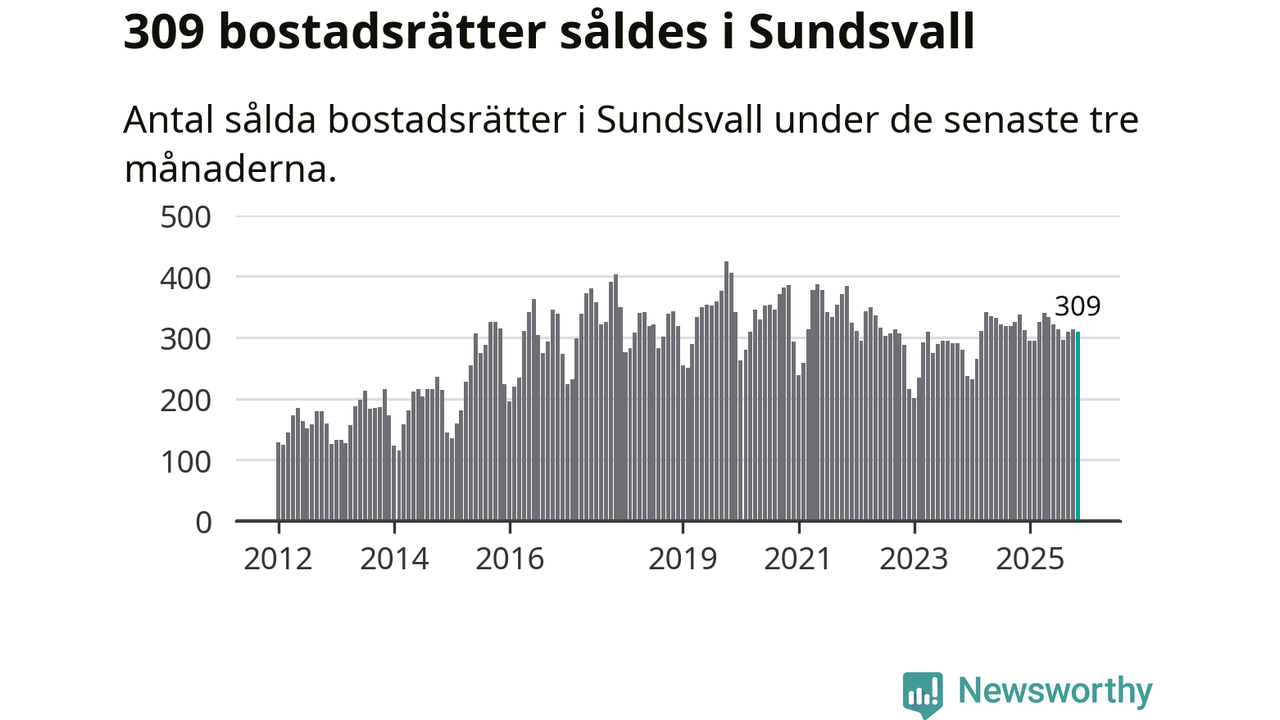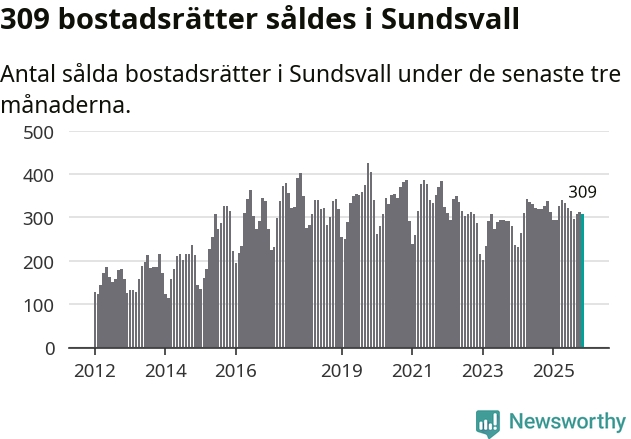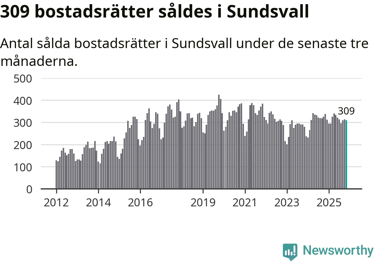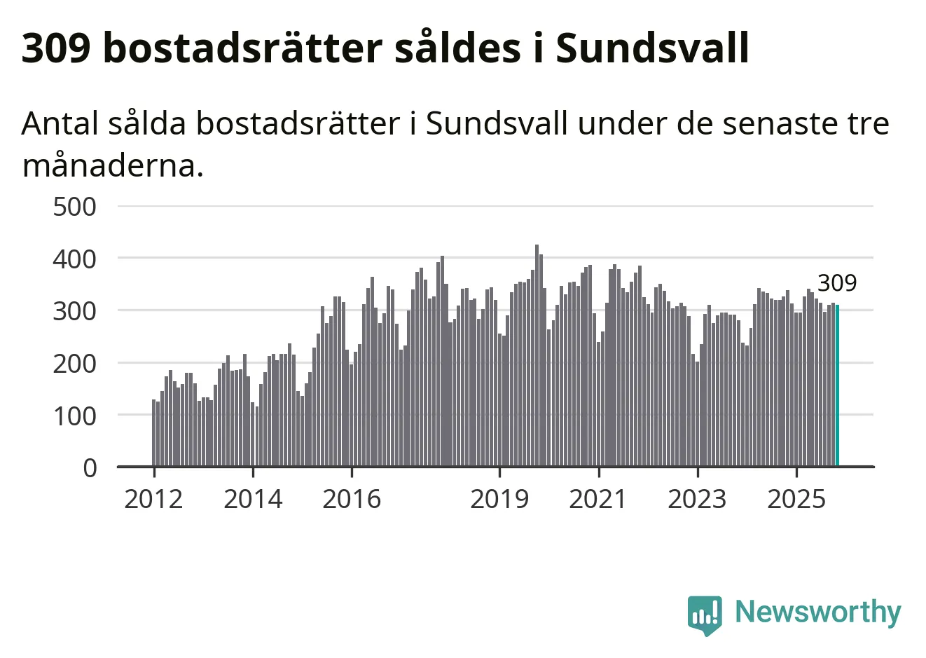 Mellan september och november såldes 309 bostadsrätter i Sundsvalls kommun. Det är relativt få sett till aktiviteten på bostadsmarknaden i kommunen under de senaste tolv månaderna, samt det historiska snittet för den här tiden på året.