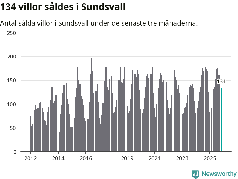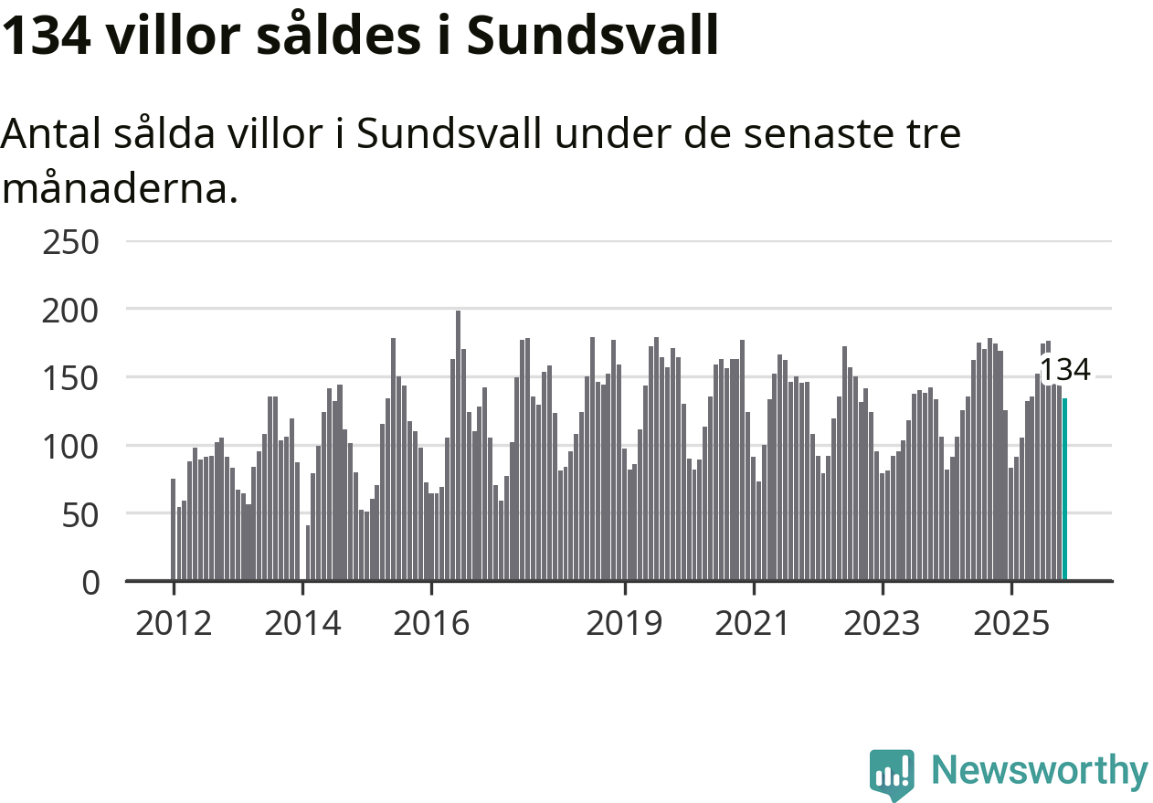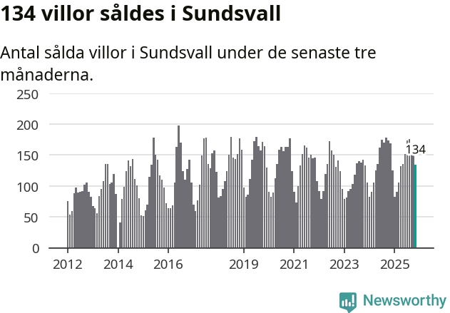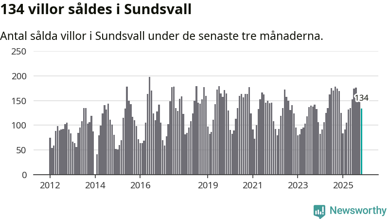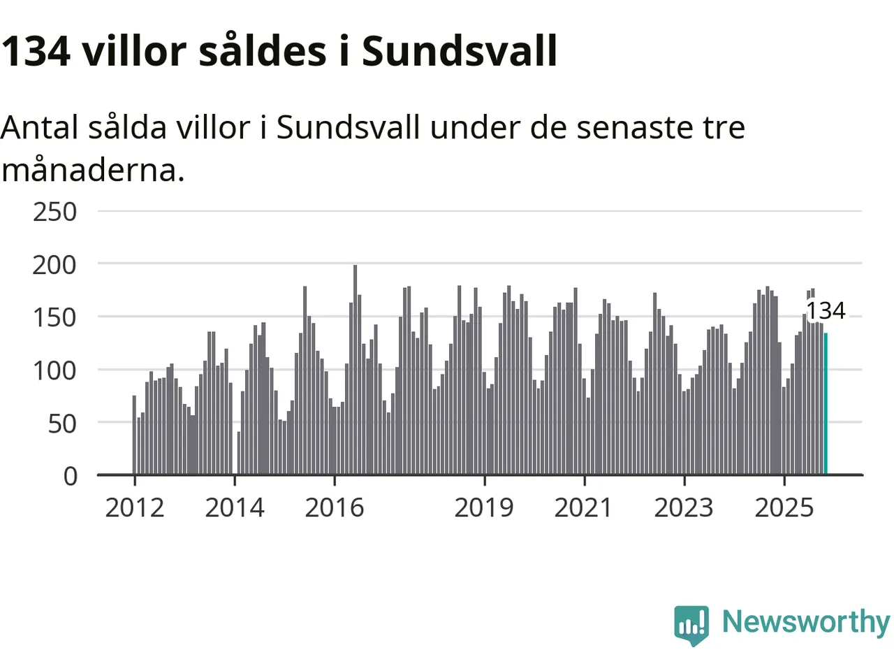 Sammanlagt såldes 134 villor i Sundsvalls kommun mellan september och november till ett genomsnittligt pris på 2,6 miljoner kronor. I fjol gjordes 169 affärer vid den här tiden på året.