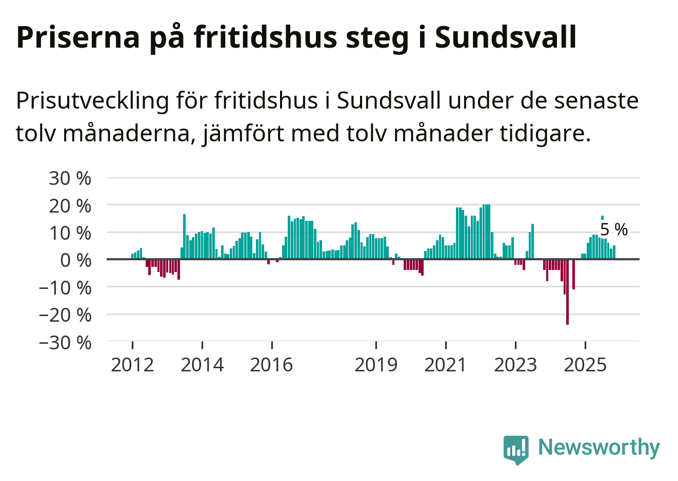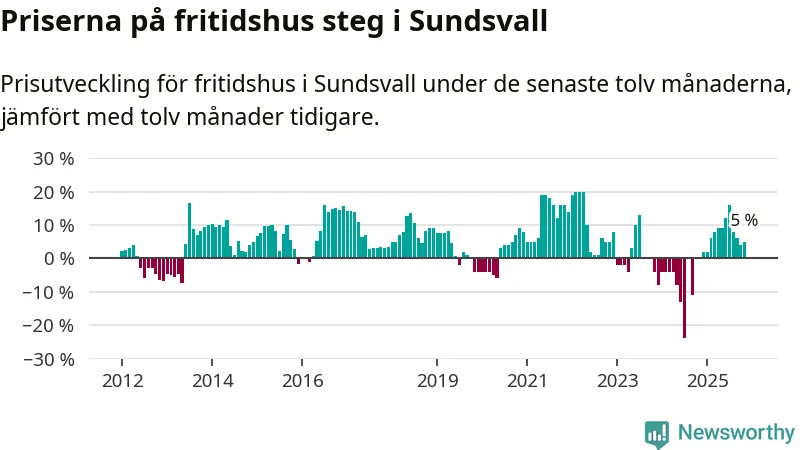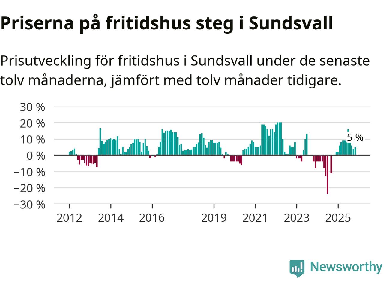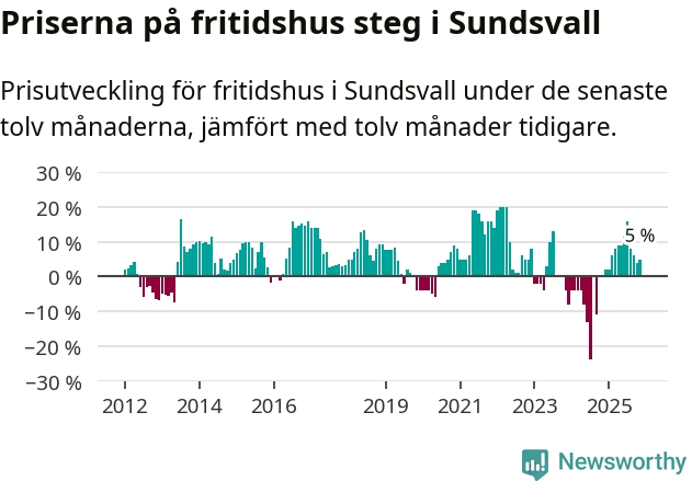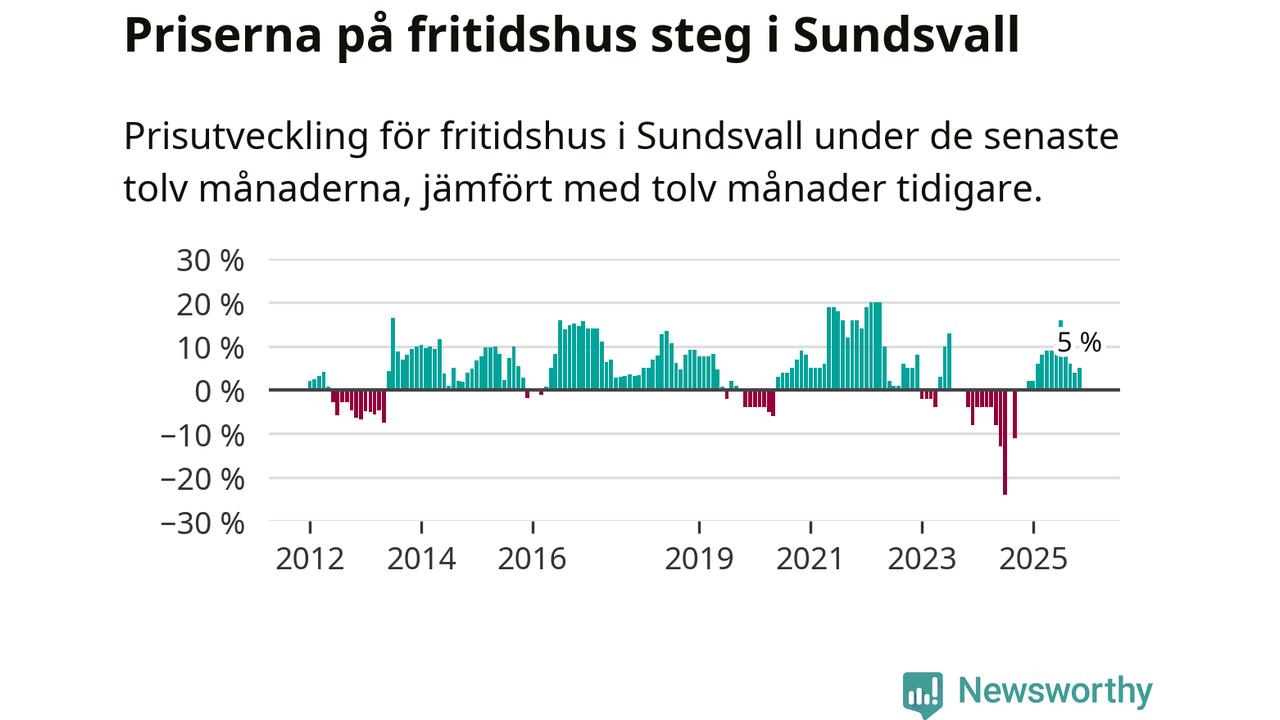 Priserna på fritidshus har gått upp i Sundsvalls kommun. Medelpriset på försäljningarna under de senaste tolv månaderna visar på en uppgång med 5 procent.