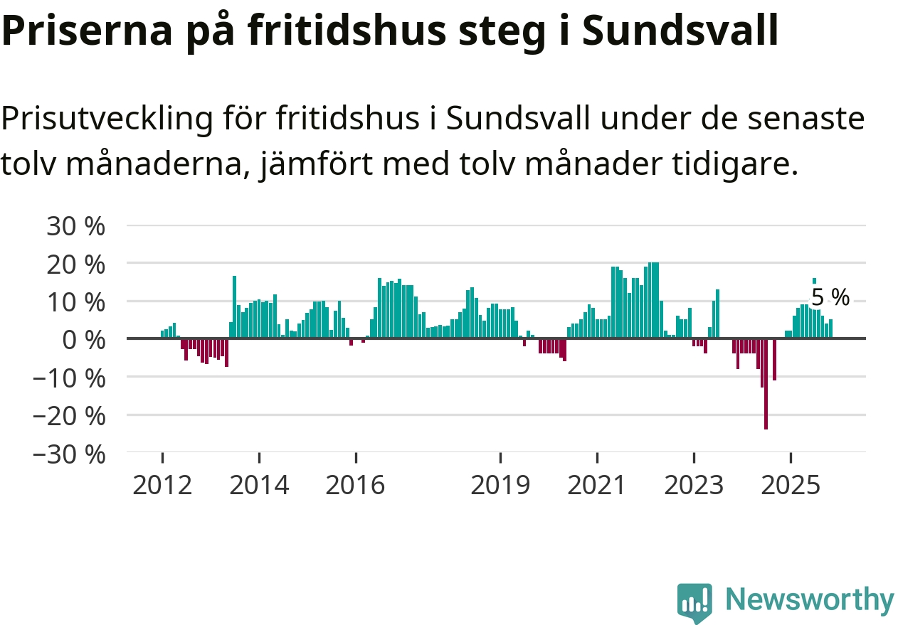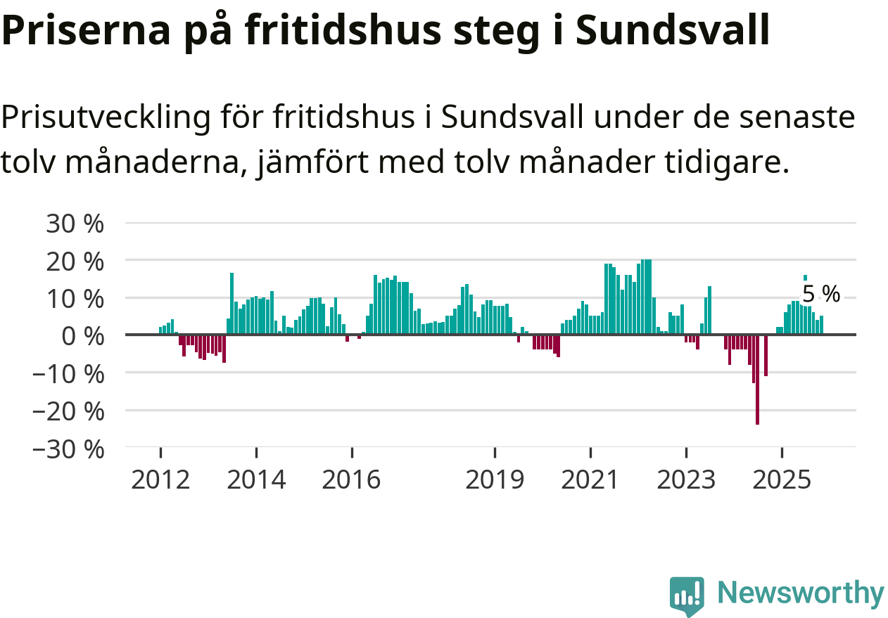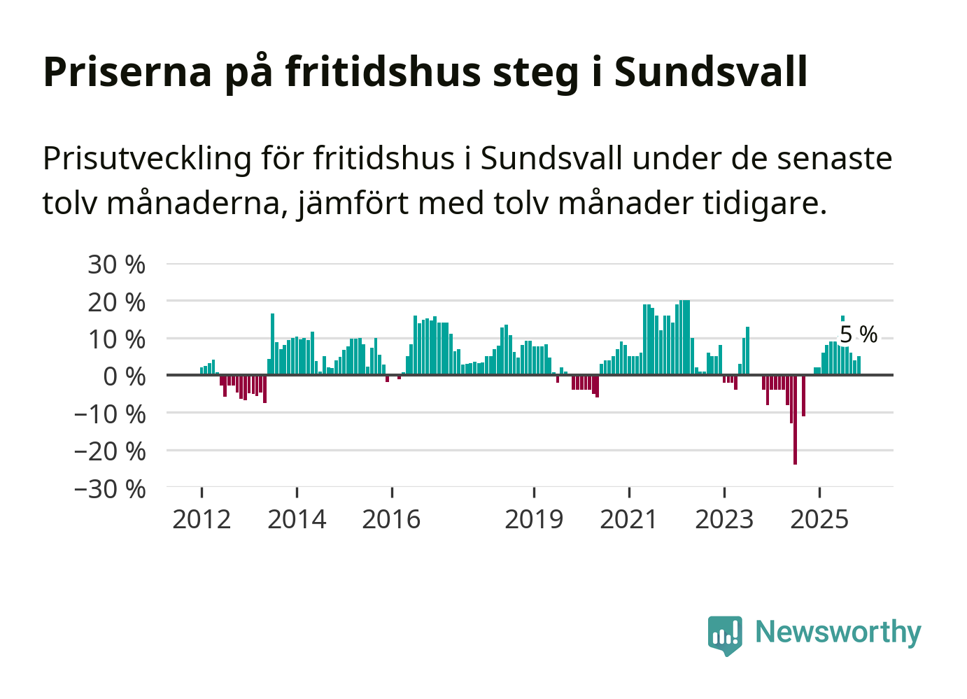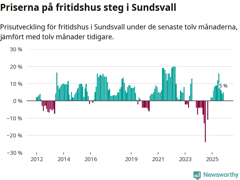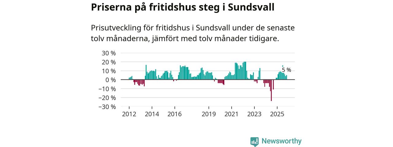 Priserna på fritidshus har gått upp i Sundsvalls kommun. Medelpriset på försäljningarna under de senaste tolv månaderna visar på en uppgång med 5 procent.